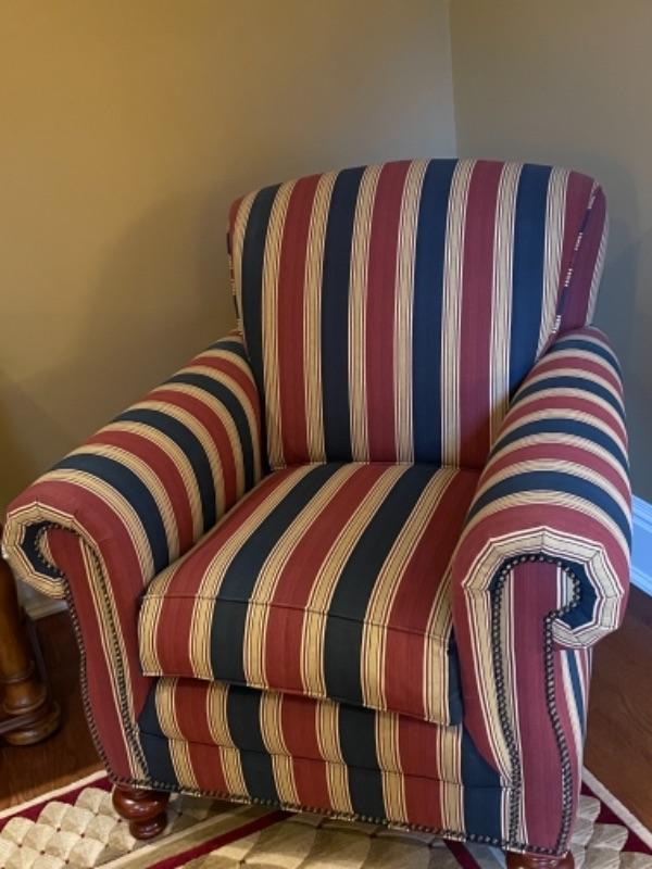 Brand new, never used. Red, off white and navy. Nailhead detail. Measures 32L x 34W x 38H