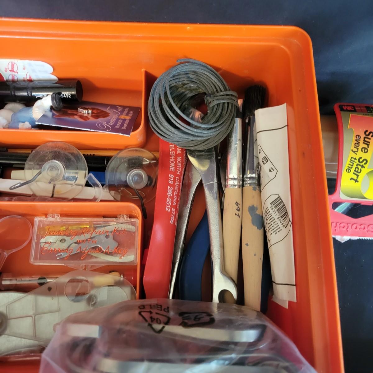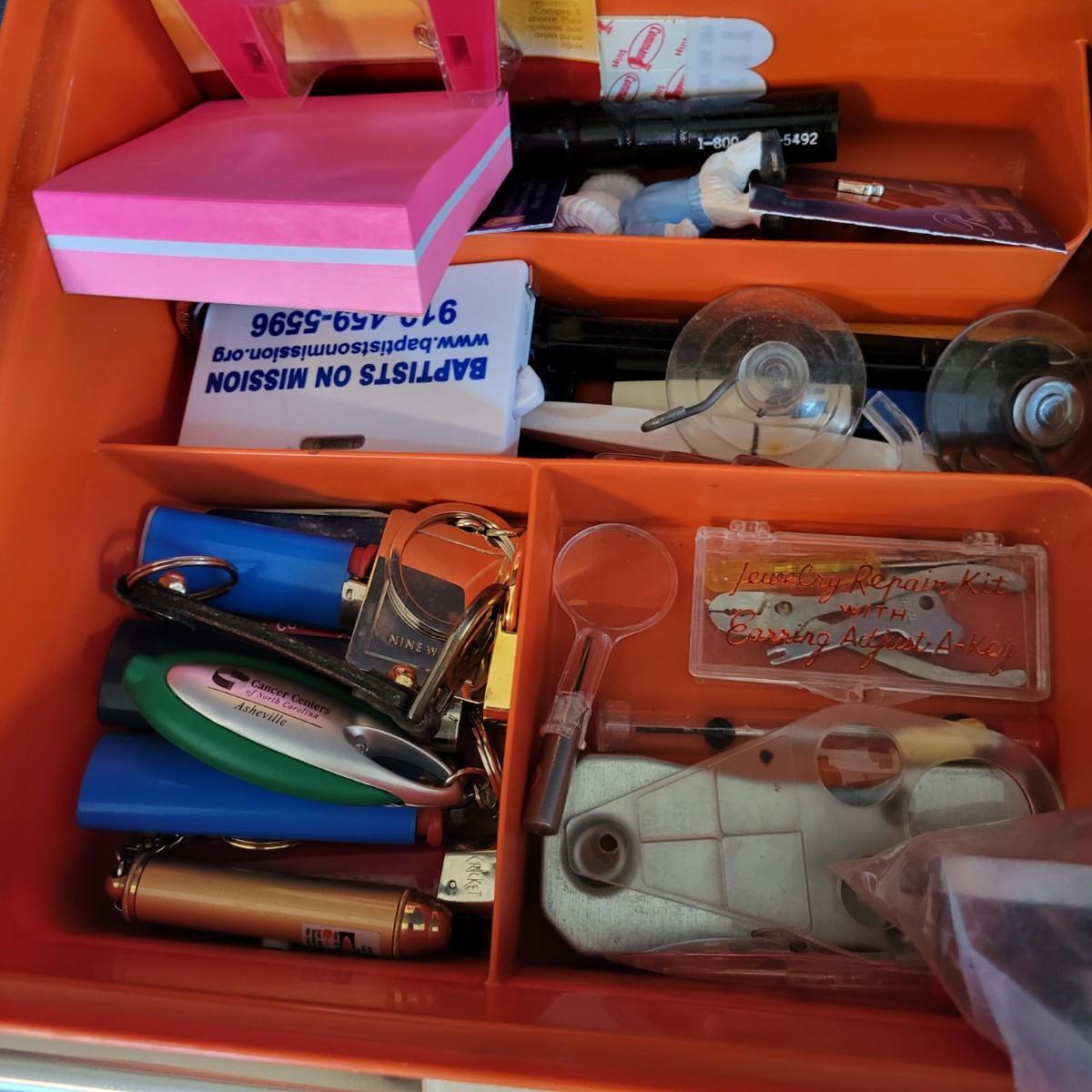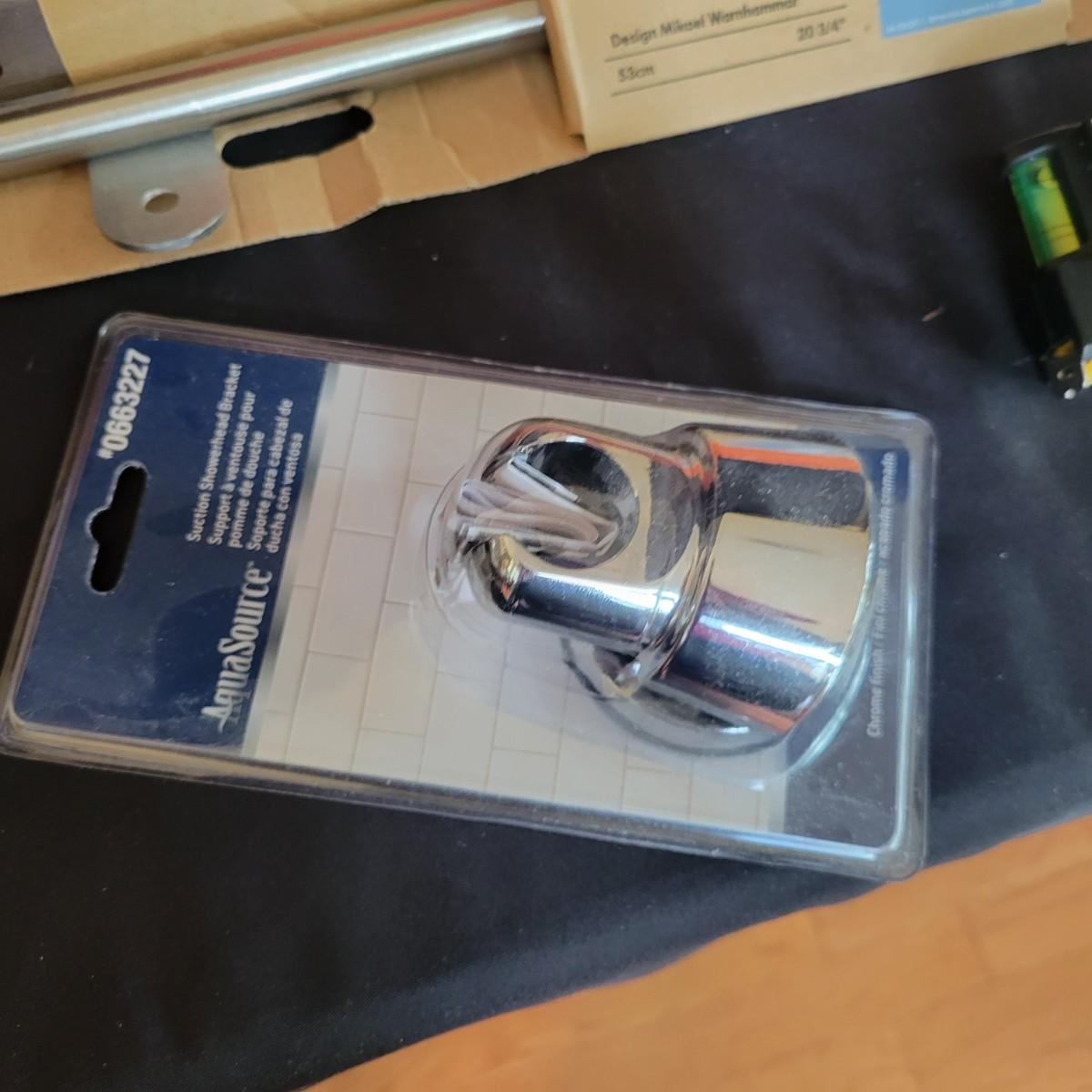 A small assortment of hardware ranging from screws and small nails to tape and other items one might find in that random drawer in the laundry room. A few organizing containers are included as well. The Grundtal towel rod measures approximately 20.75". Local pickup only