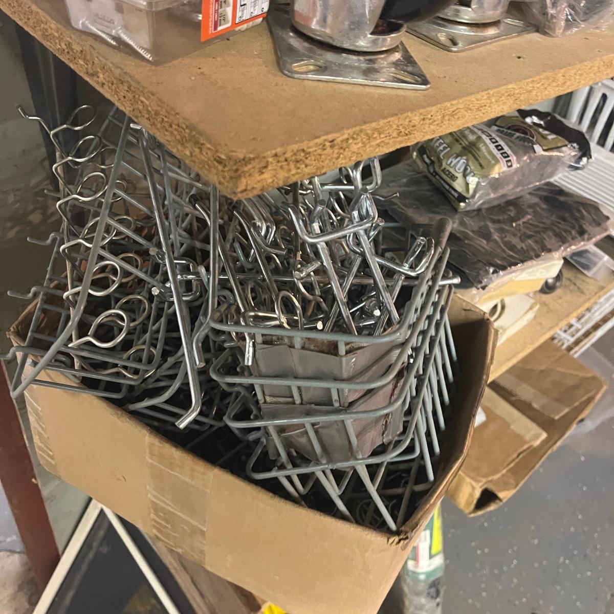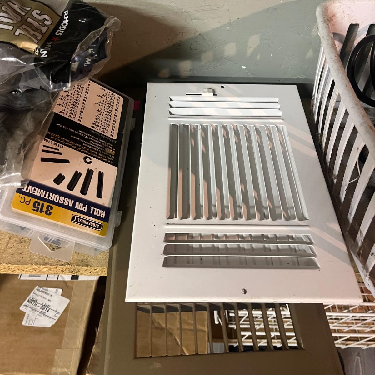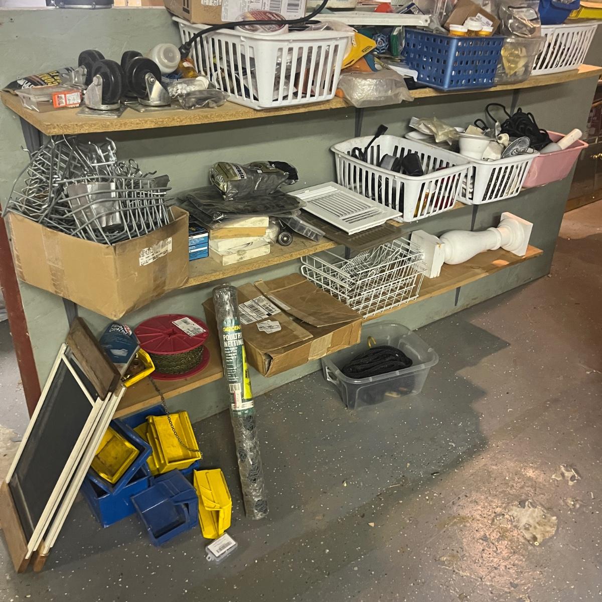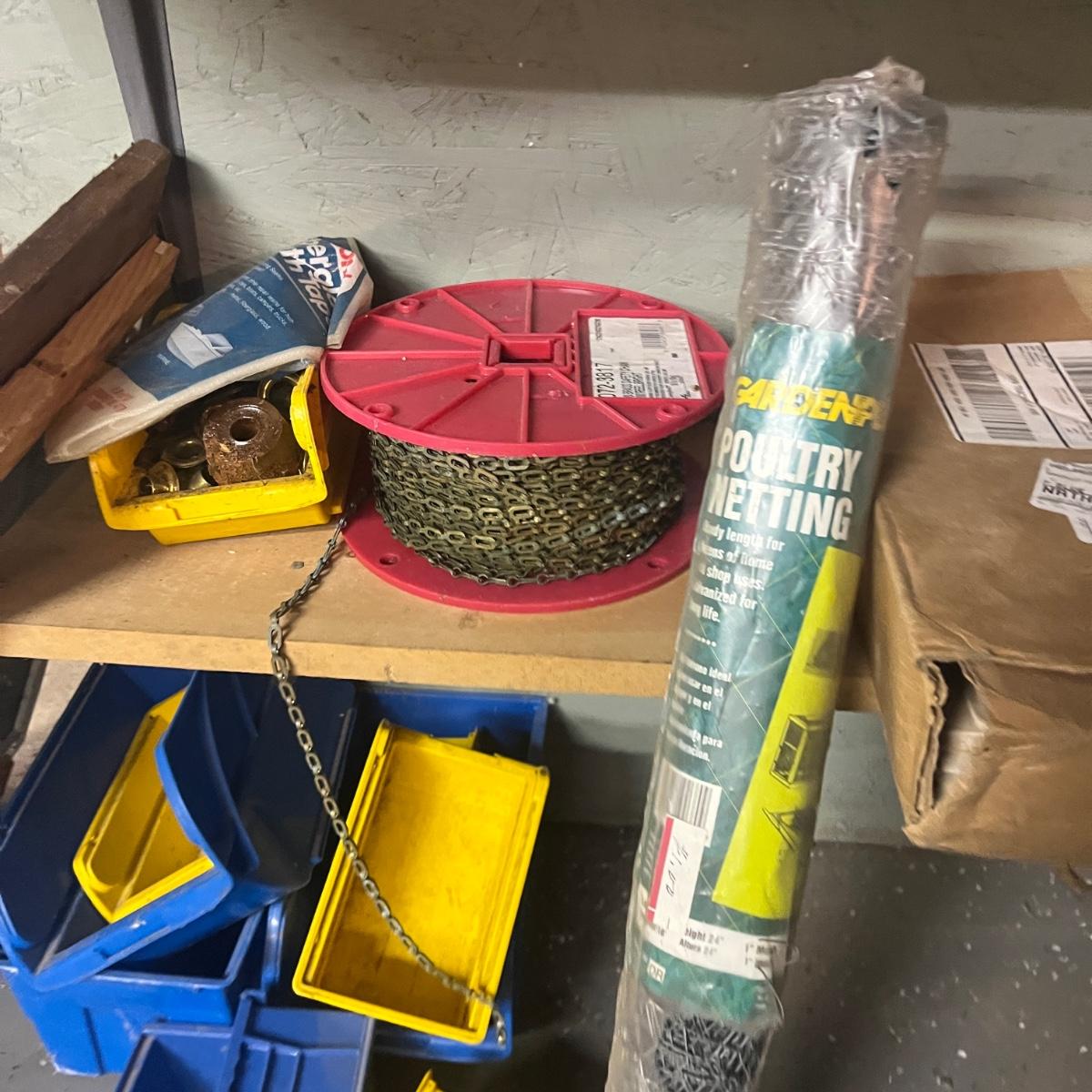 Lot contains a plethora of hardware including A/C registers, small plastic bins, work light, wheels, peg board accessories, poultry netting, chain, rope, bolts and more. Shelves not included.