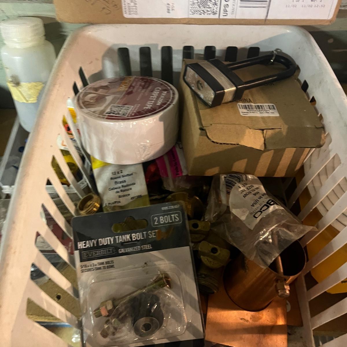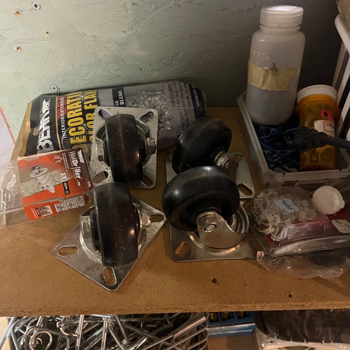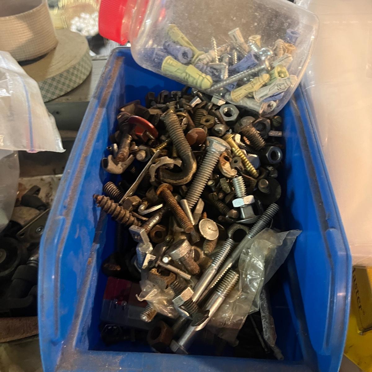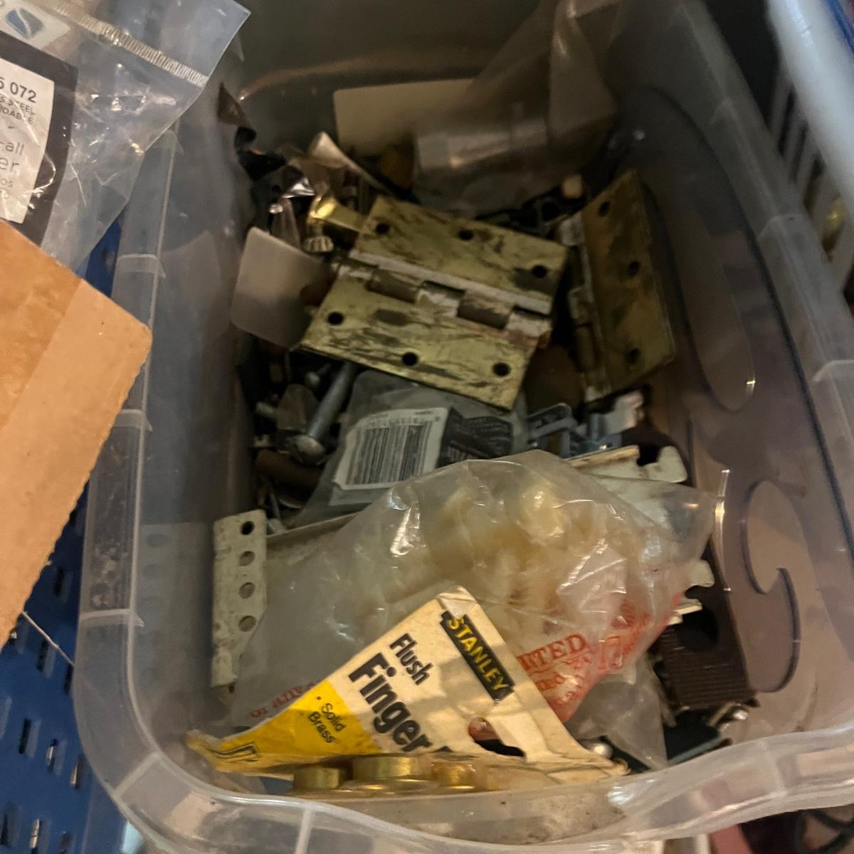 Lot contains a plethora of hardware including A/C registers, small plastic bins, work light, wheels, peg board accessories, poultry netting, chain, rope, bolts and more. Shelves not included.