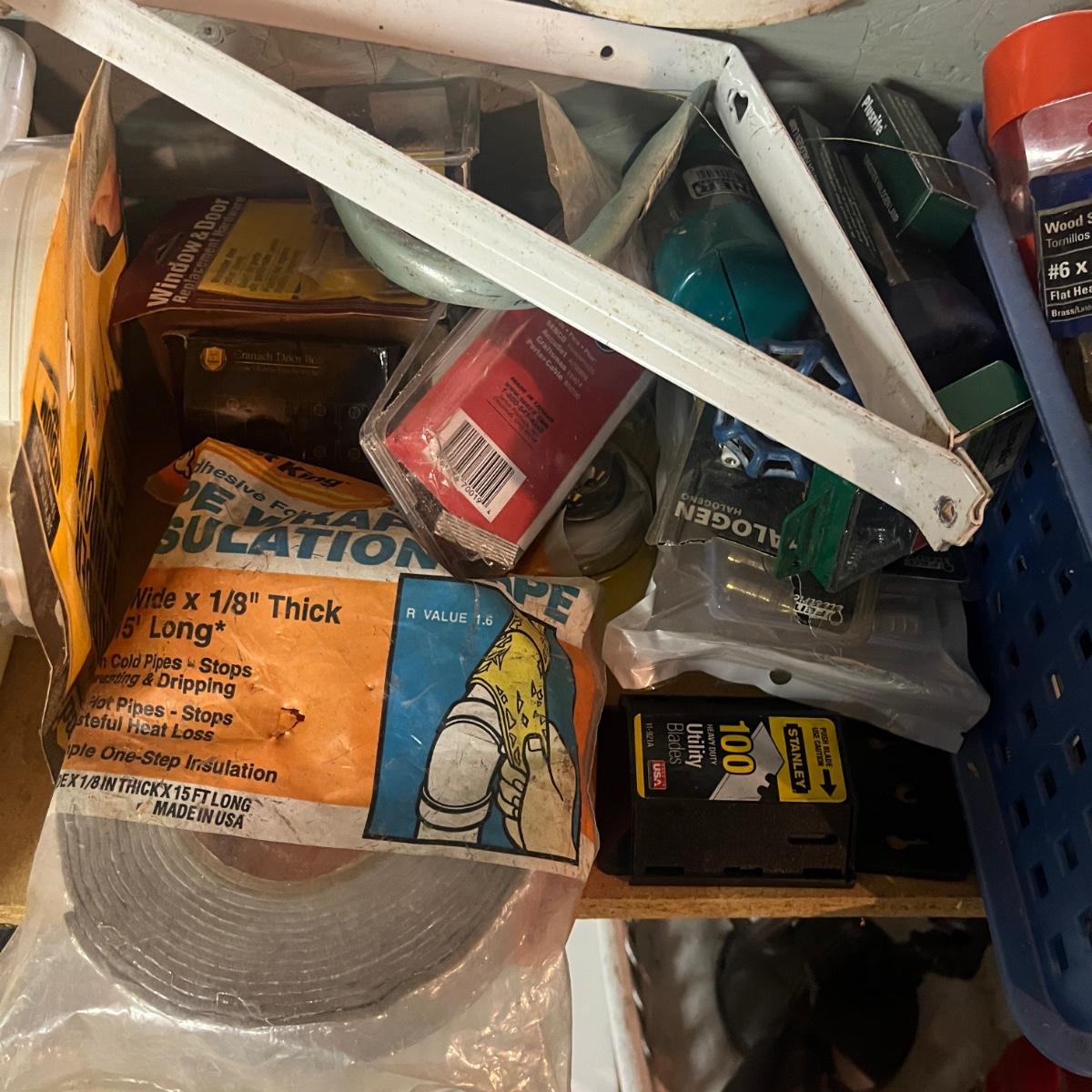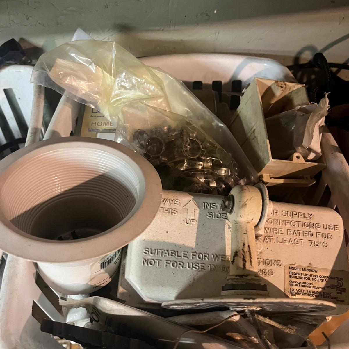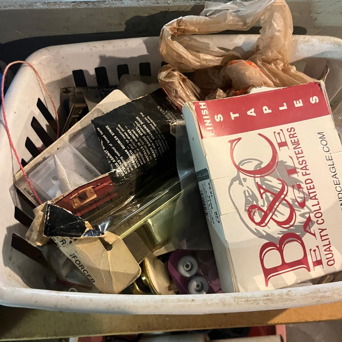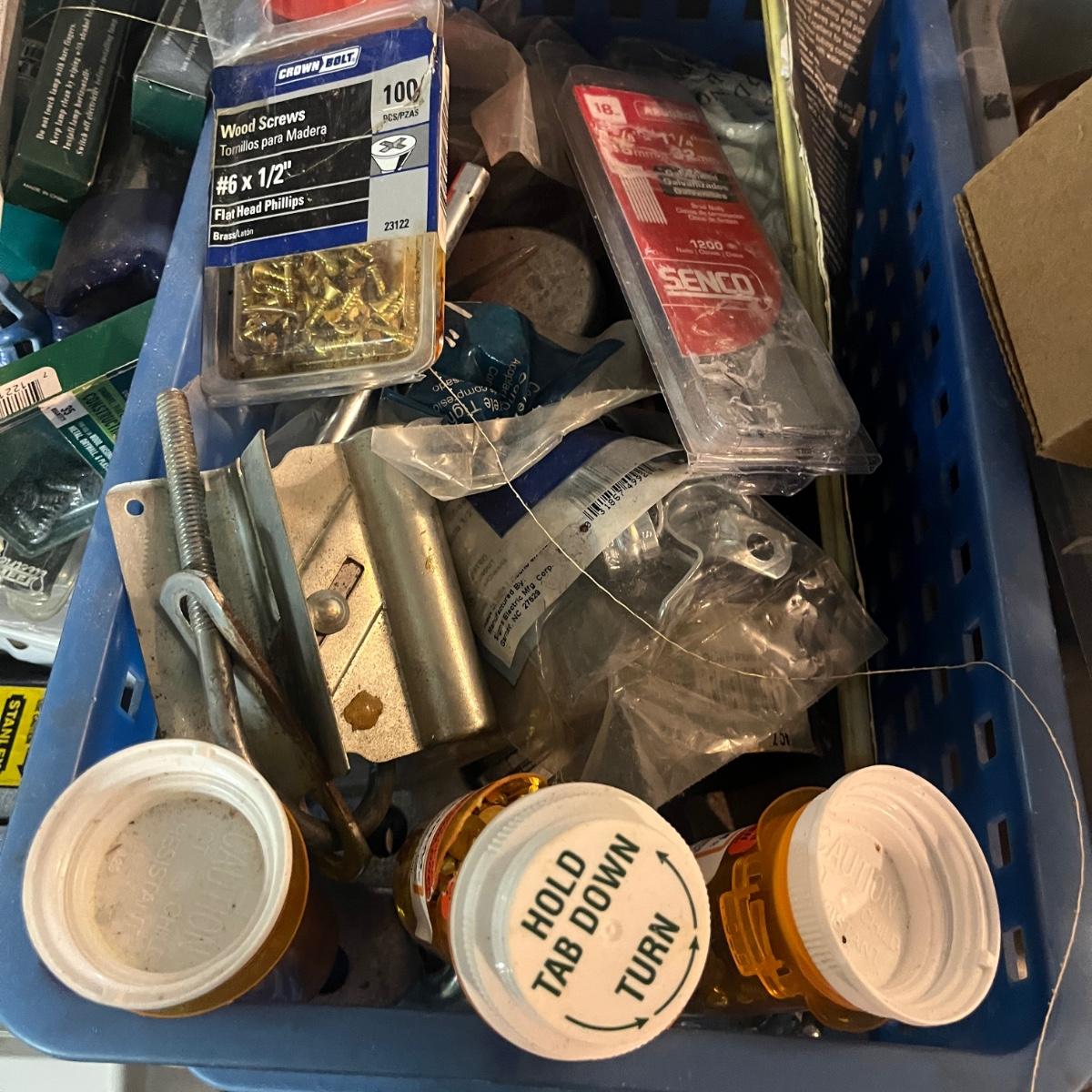Lot contains a plethora of hardware including A/C registers, small plastic bins, work light, wheels, peg board accessories, poultry netting, chain, rope, bolts and more. Shelves not included.
