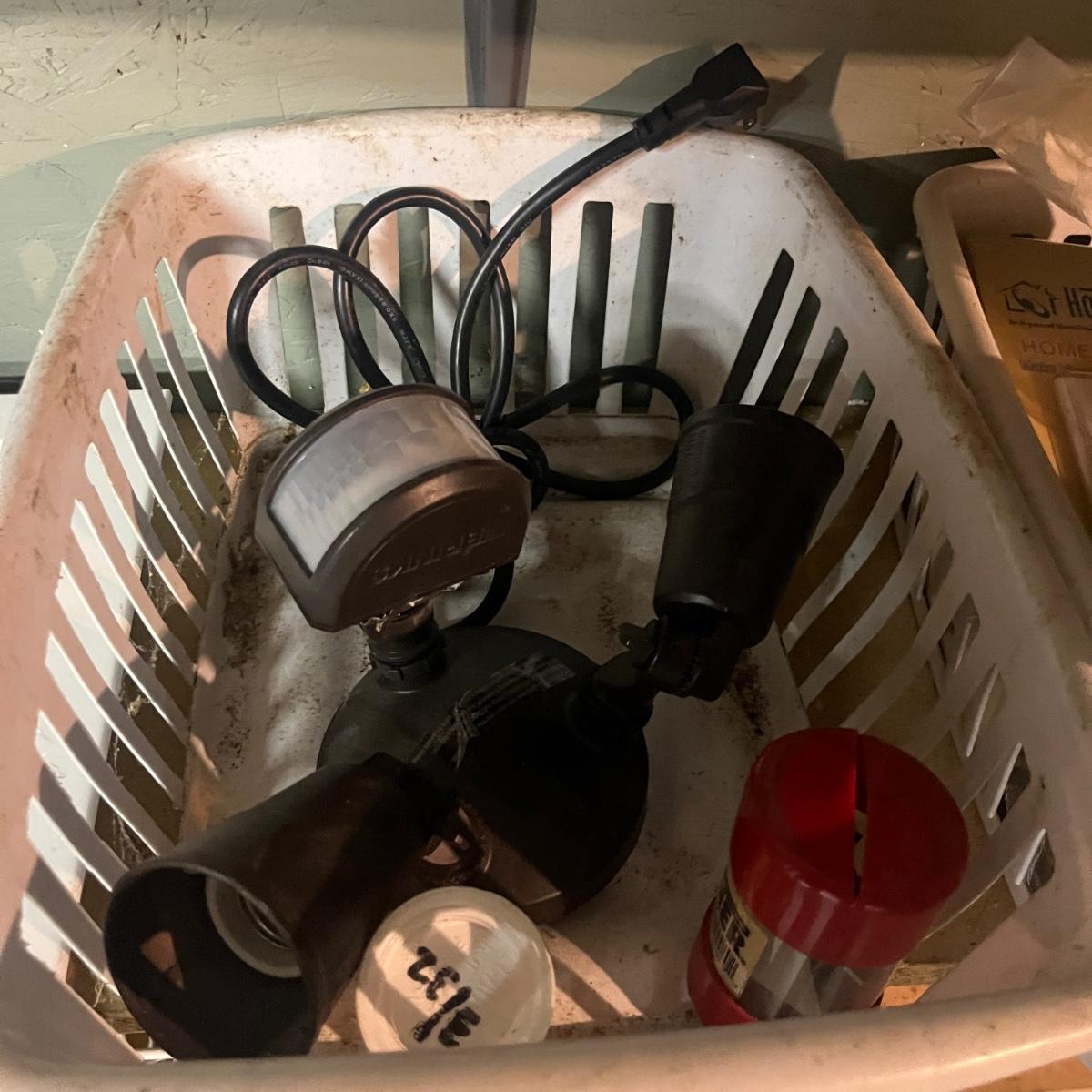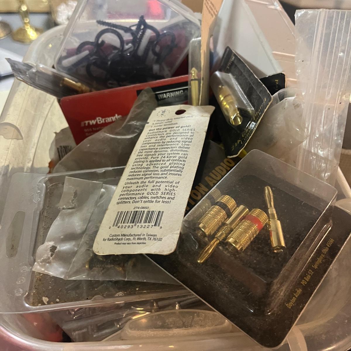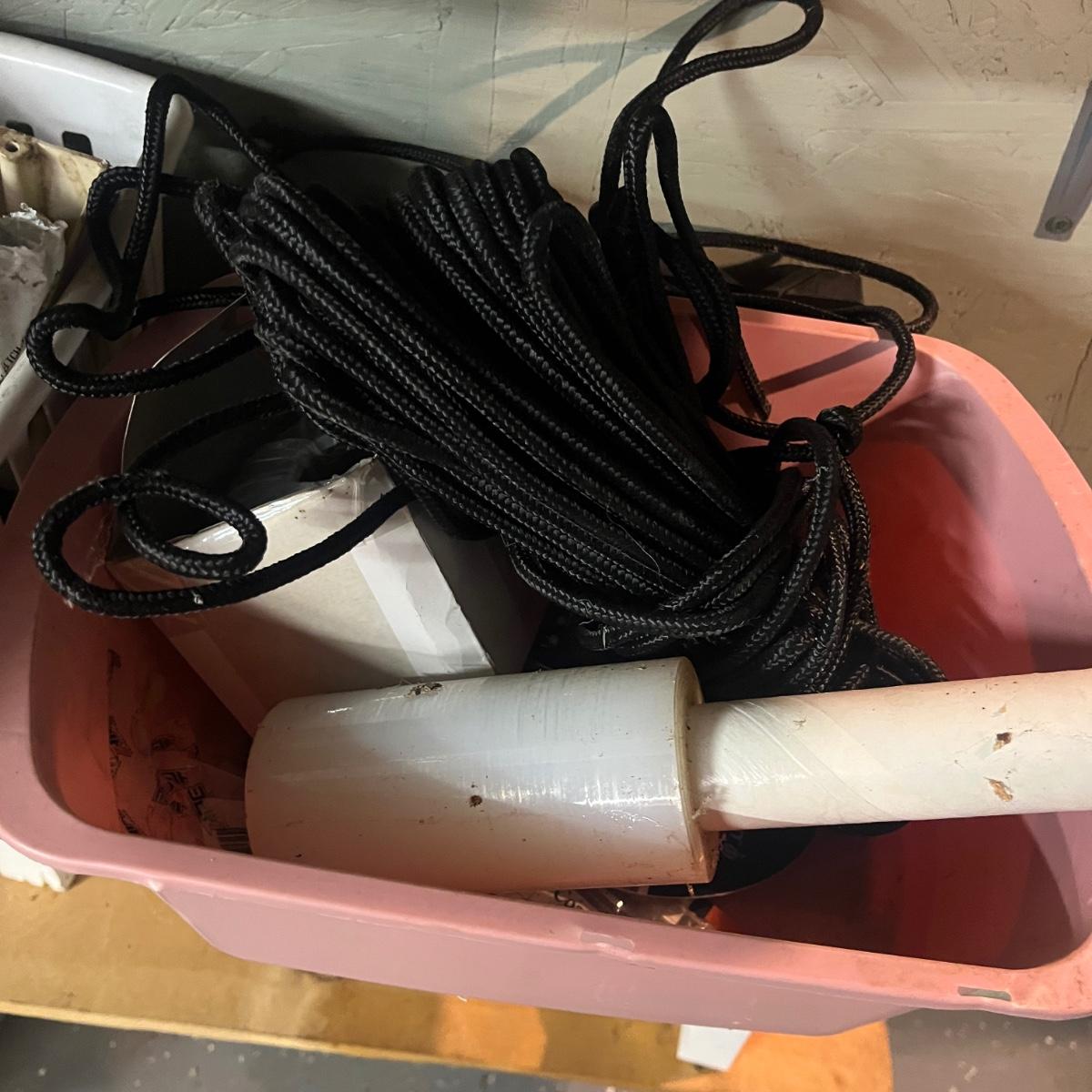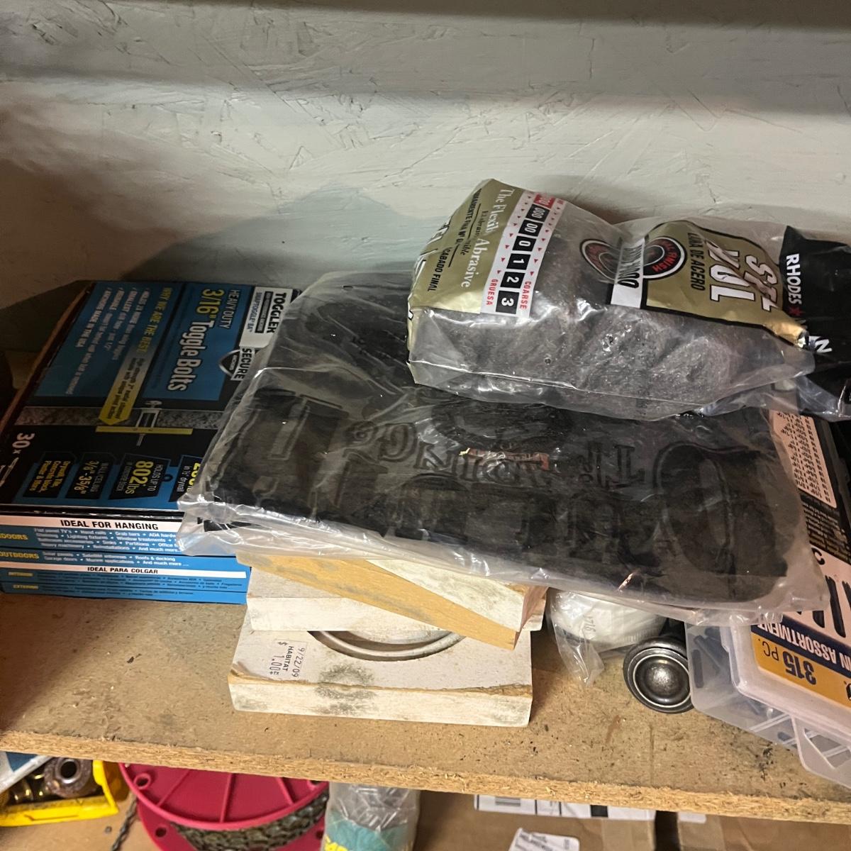 Lot contains a plethora of hardware including A/C registers, small plastic bins, work light, wheels, peg board accessories, poultry netting, chain, rope, bolts and more. Shelves not included.