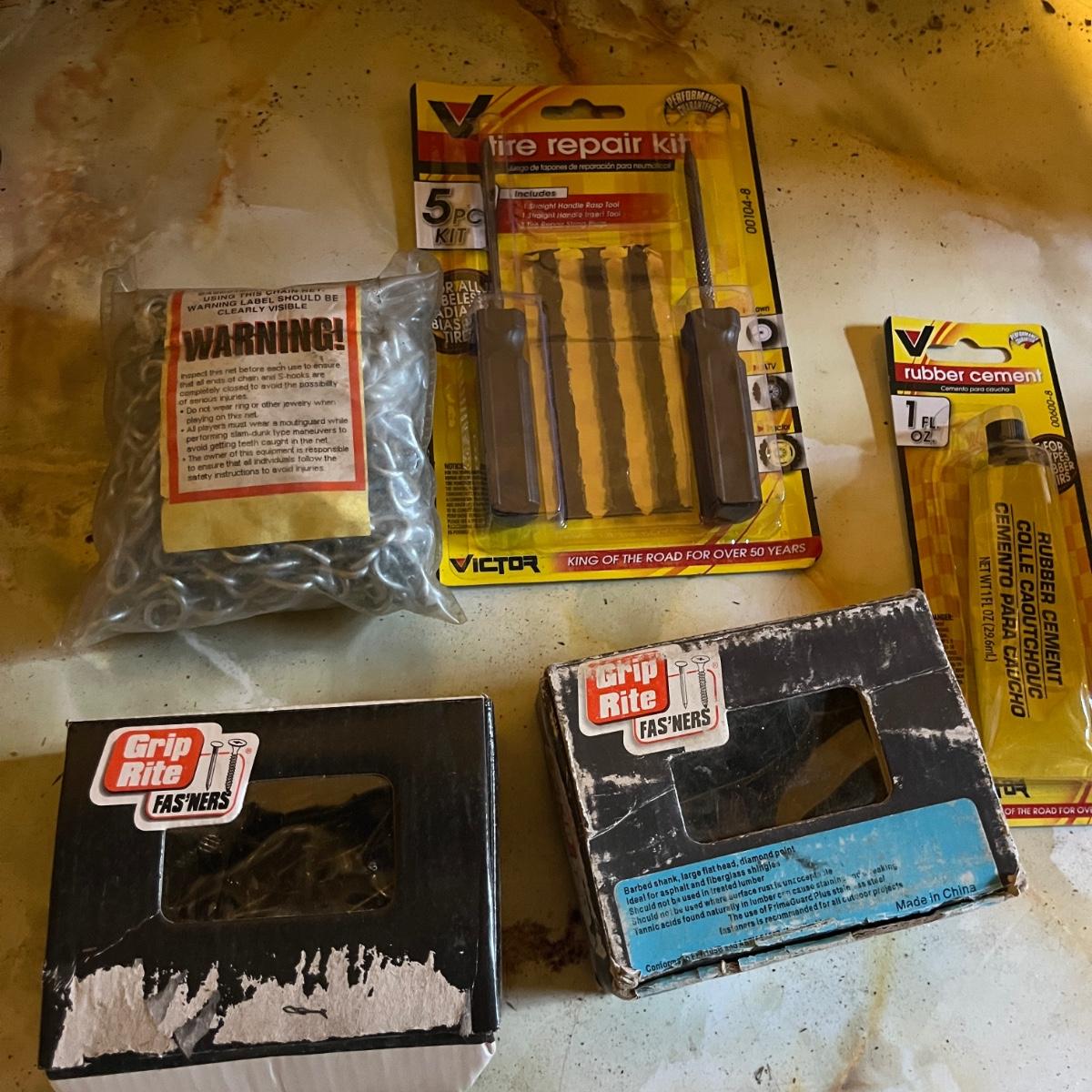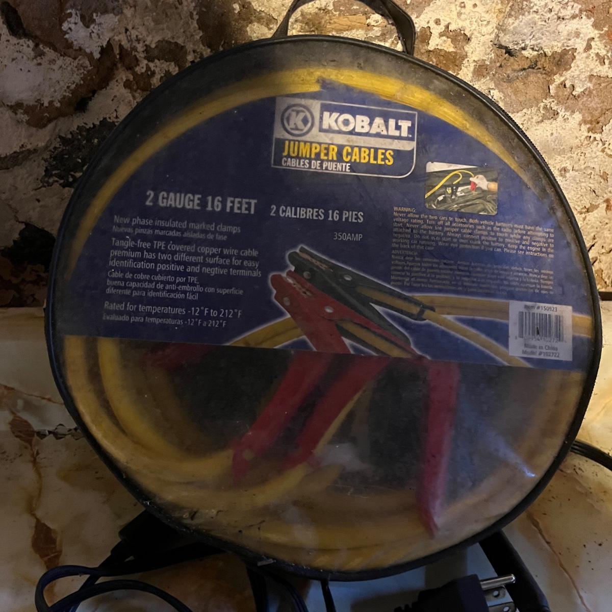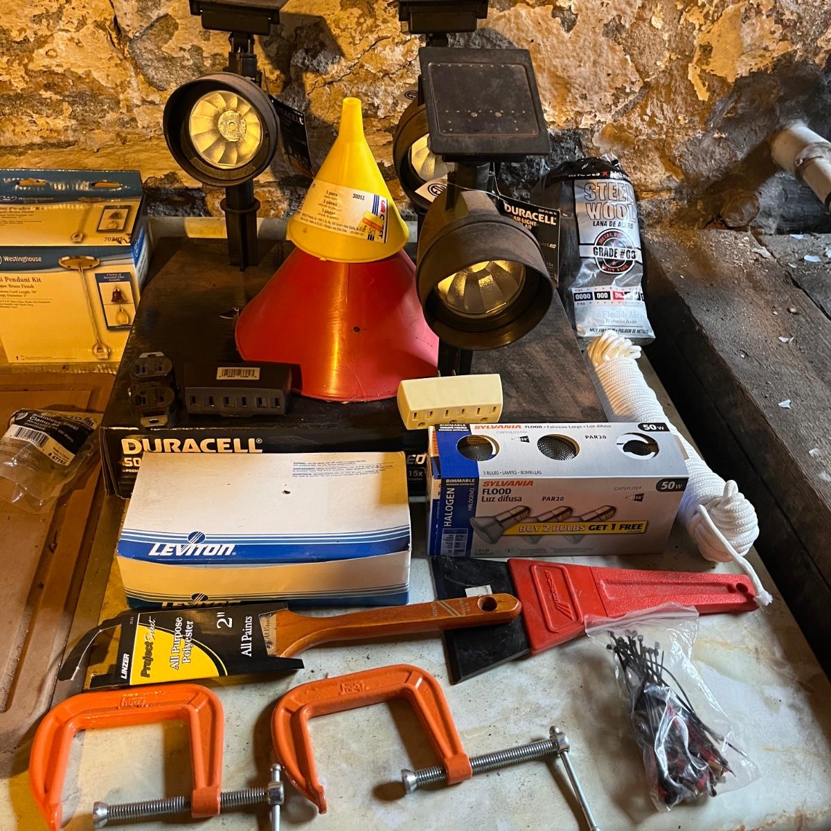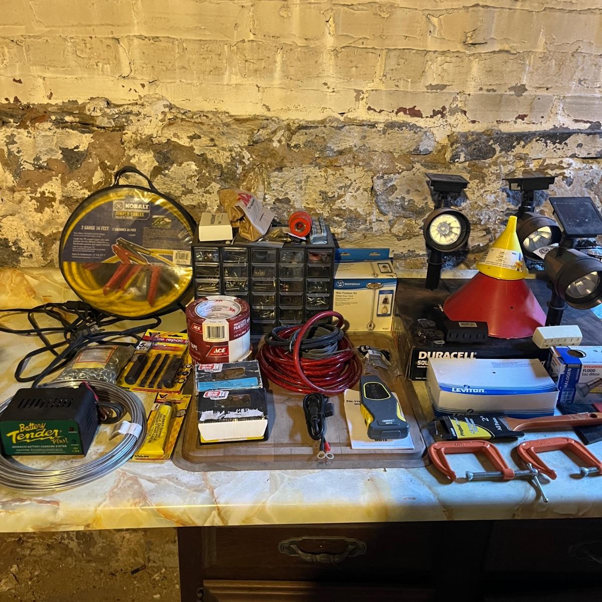 Lot includes plastic storage bin, jumper cables, battery tender, two c clamps, nails, paint brush, solar lights, painters tape and more. Storage bin measures 11” x 5” x 8”H.