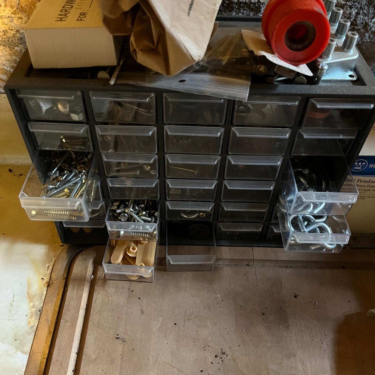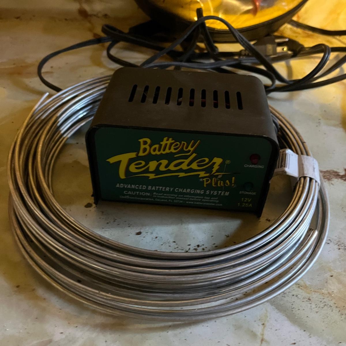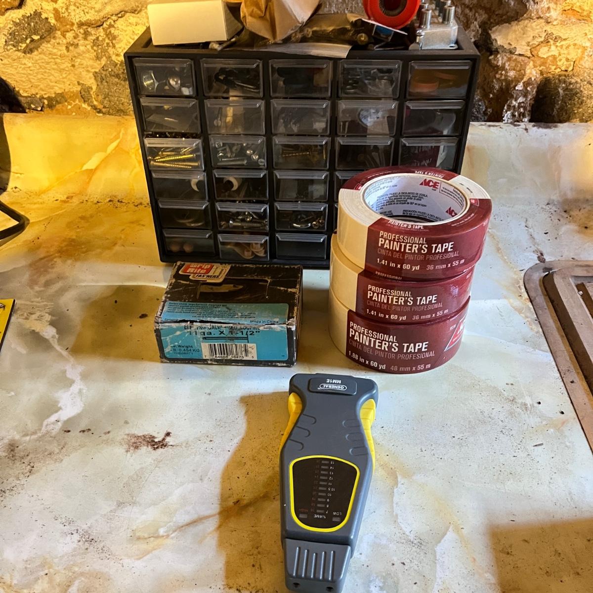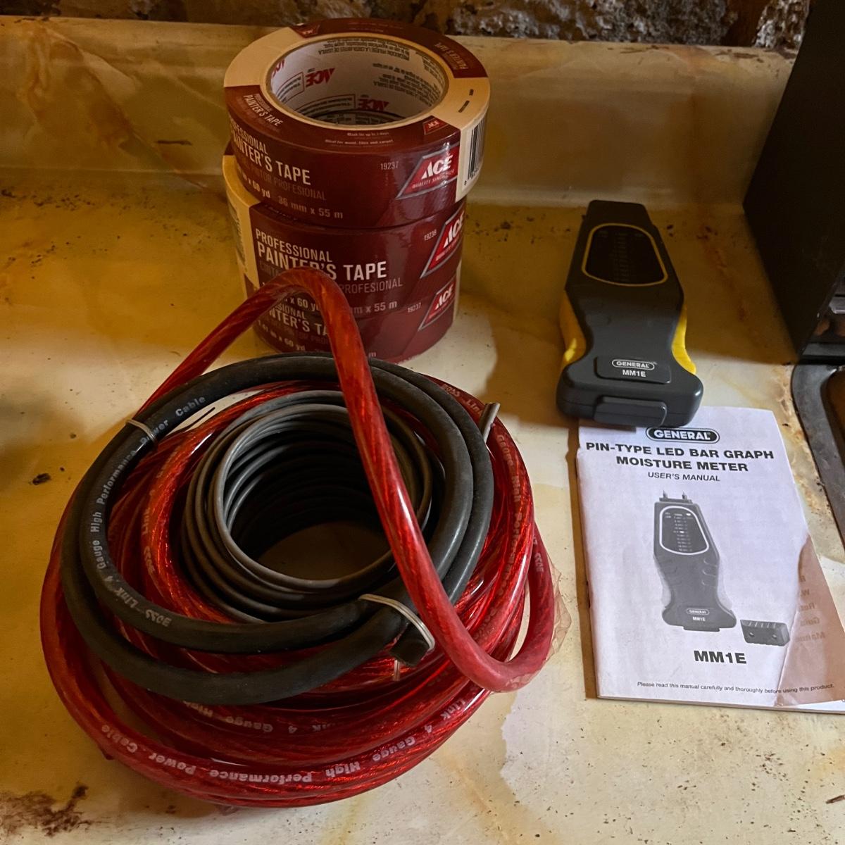 Lot includes plastic storage bin, jumper cables, battery tender, two c clamps, nails, paint brush, solar lights, painters tape and more. Storage bin measures 11” x 5” x 8”H.