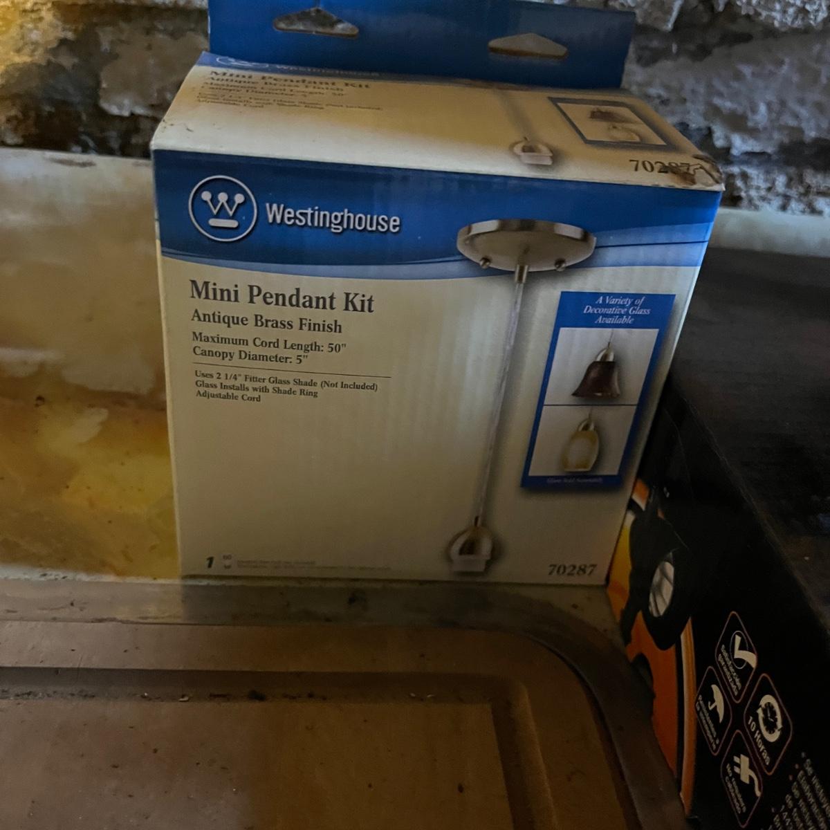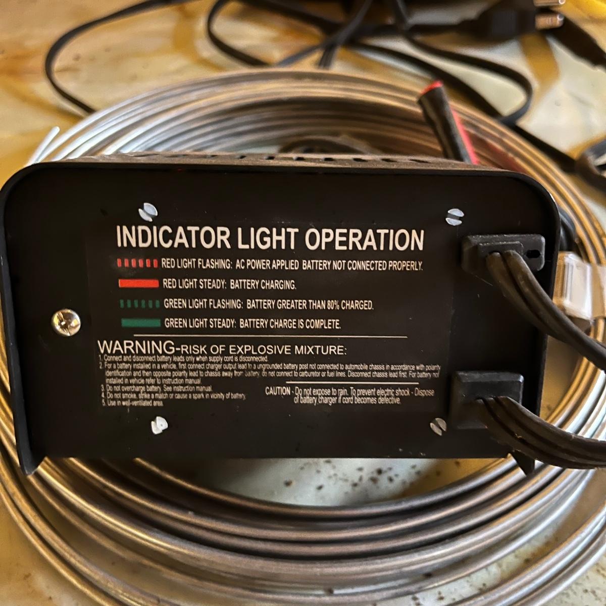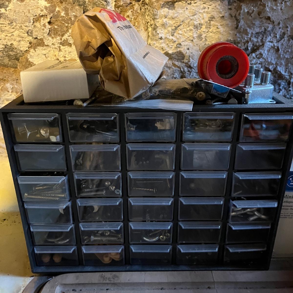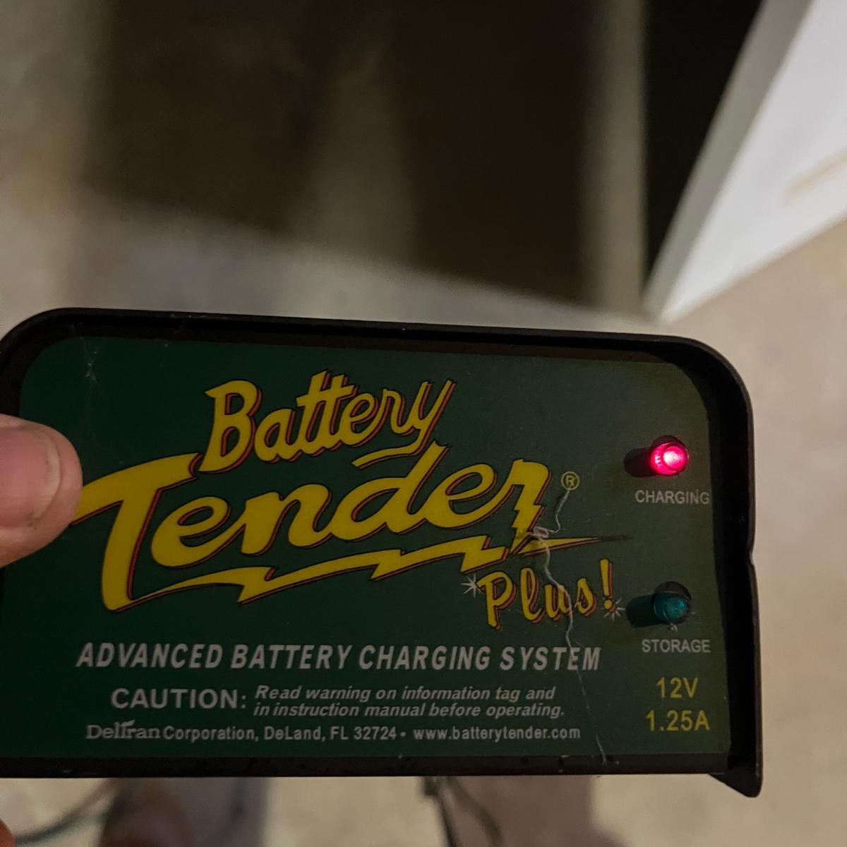 Lot includes plastic storage bin, jumper cables, battery tender, two c clamps, nails, paint brush, solar lights, painters tape and more. Storage bin measures 11” x 5” x 8”H.