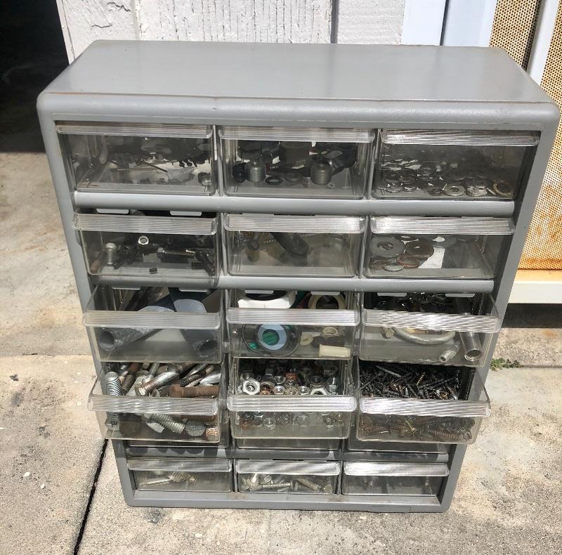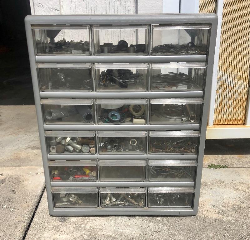 Metal cabinet with 18 clear plastic drawers to sort screws, bolts, nuts, washers and other small items. Comes with a lot of hardware!
