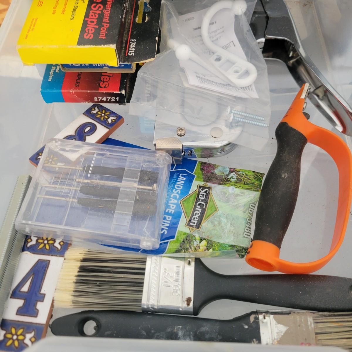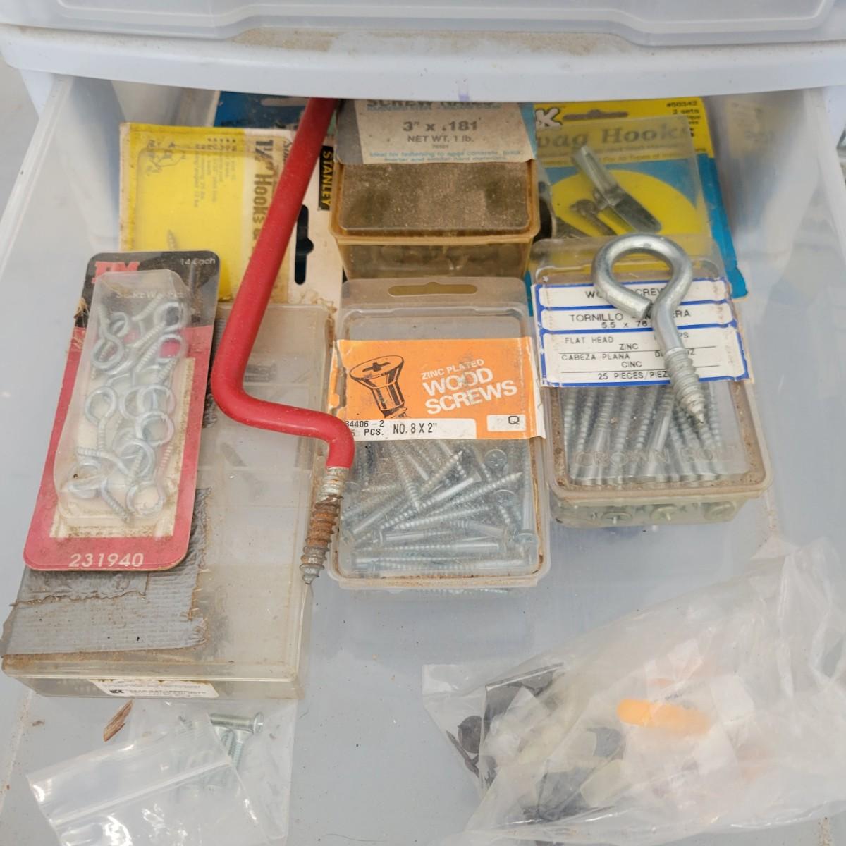 A large assortment of random hardware that also includes a rolling bin and two caddies. The rolling bun measures approximately 12" x 14" x 26"H. Hardware assortment has all of the bits and pieces usually found in these types of caddies. Screws, nails, bolts, hooks, washers and such. See pictures for full inventory. Local pickup only