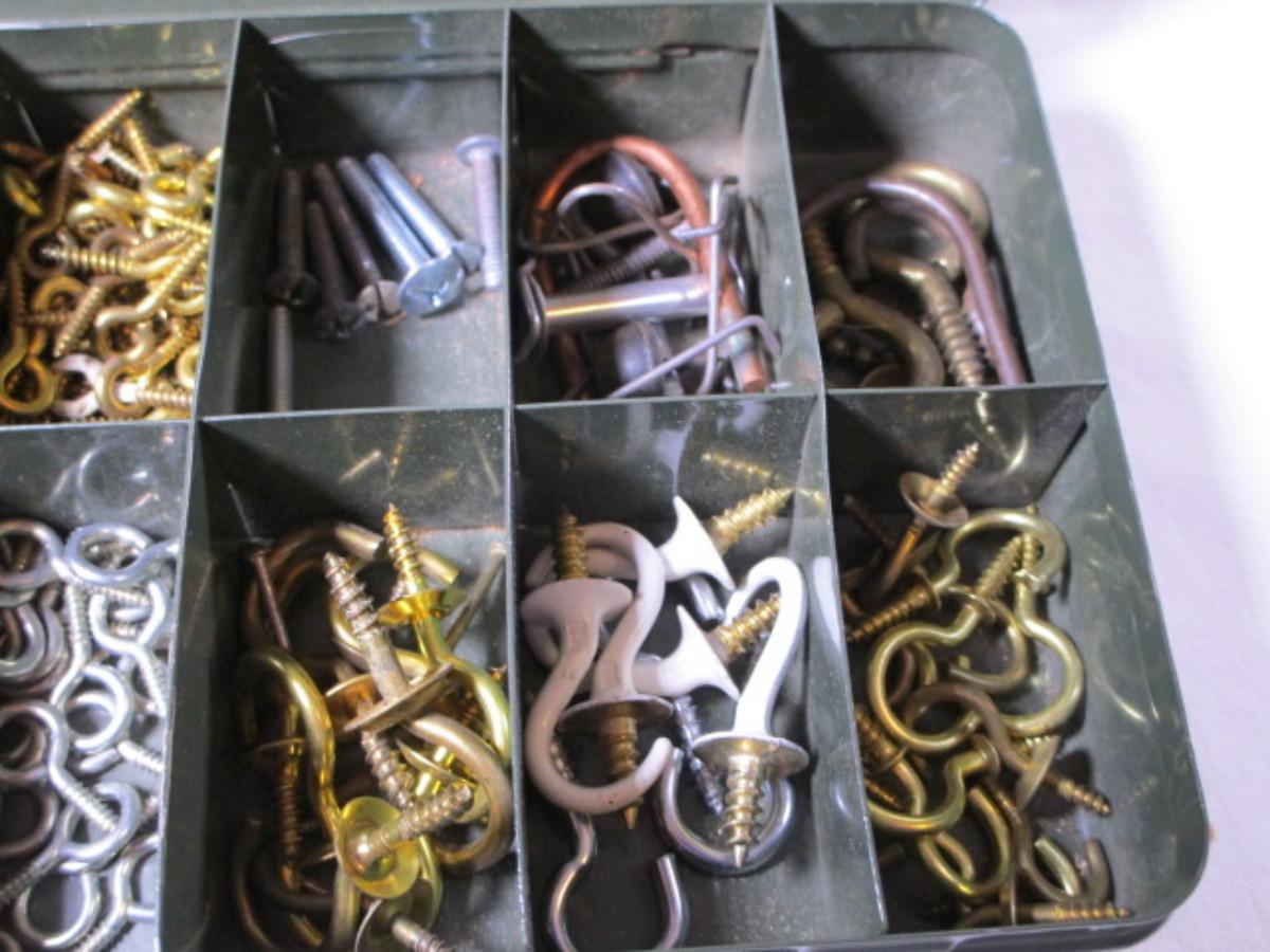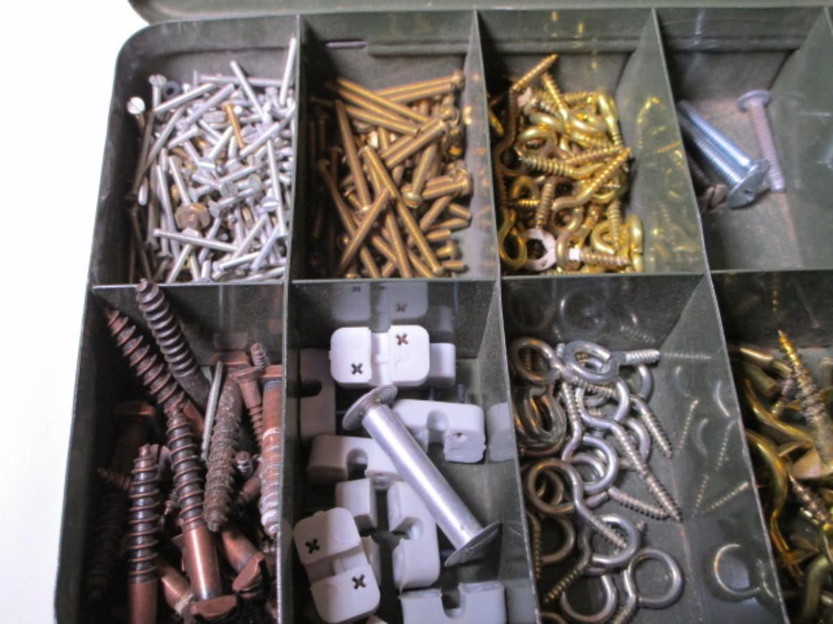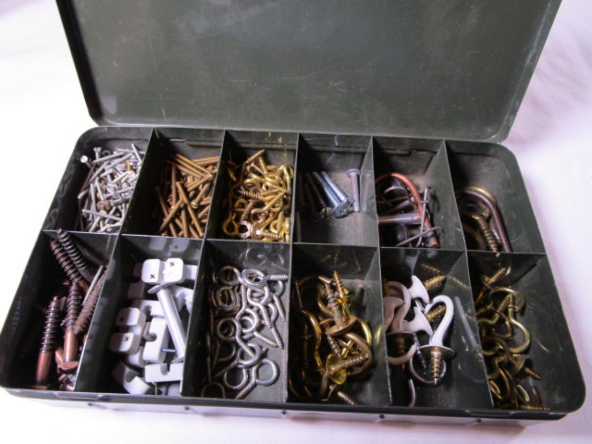 screws, I-screws, cup hooks, case is 7-1/2" x 4-3/8" x 1-1/4" tall