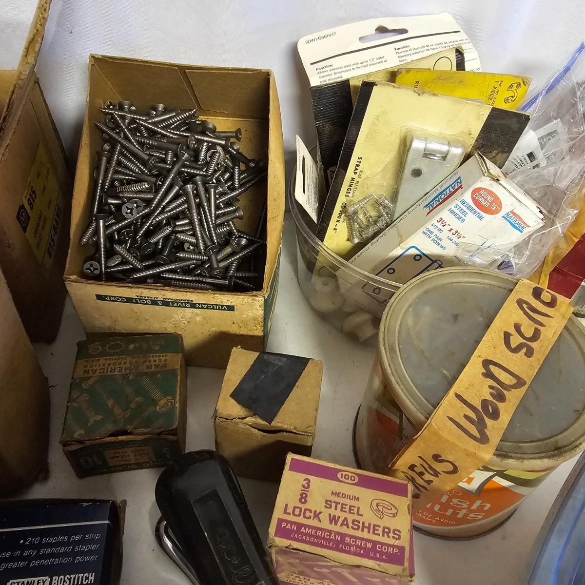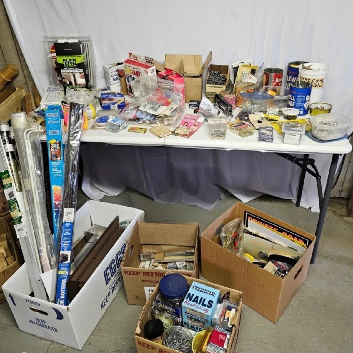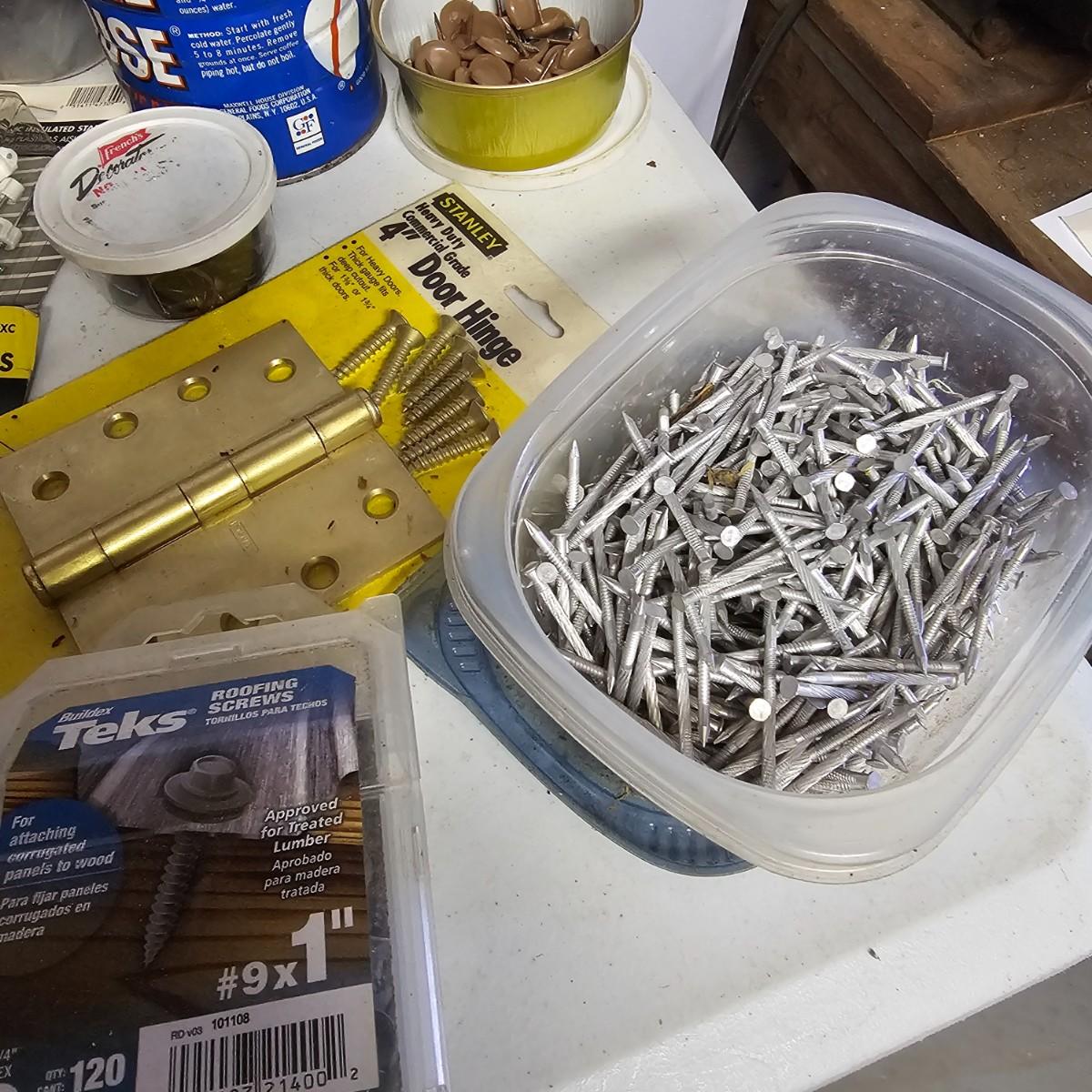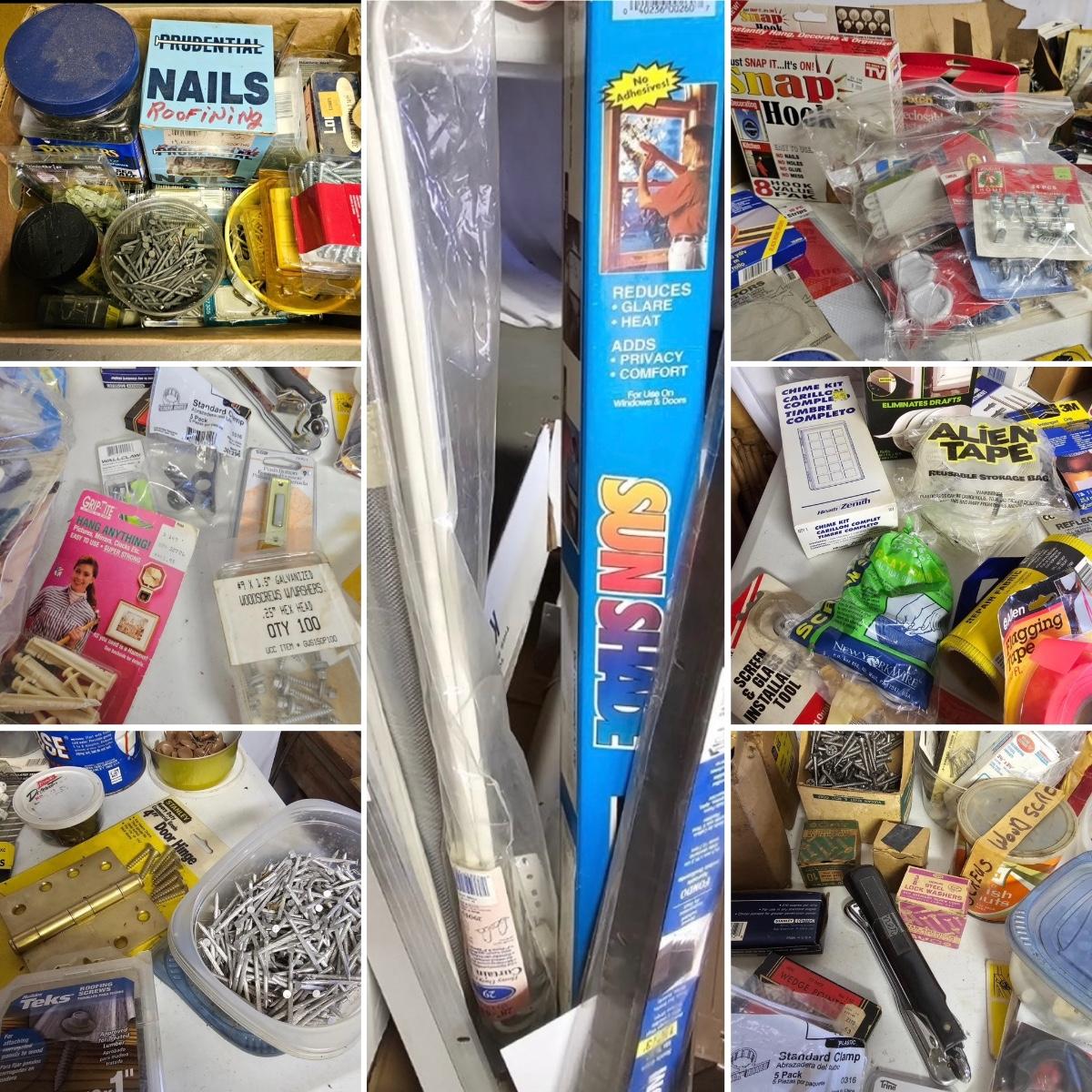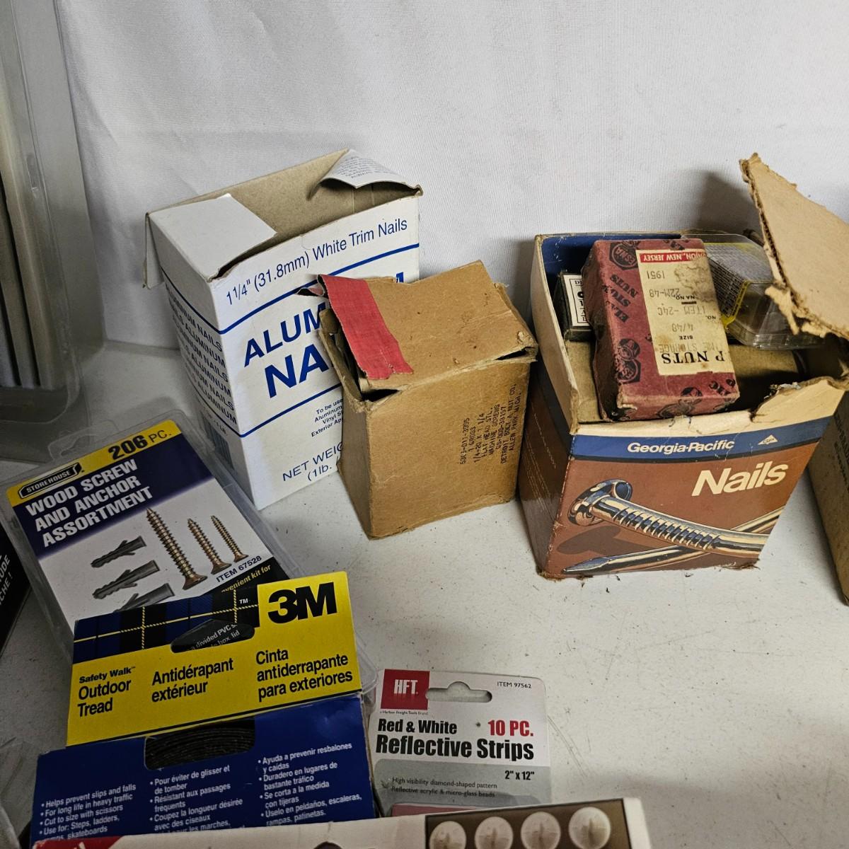 We have it again, that multipiece everything you need hardware lot. Screws, bolts, nails, tape, sliders, hinges and lots lots more. Too many items to show them all individually, but there are five boxes of steel, aluminum and many other goodies. See photos for details.