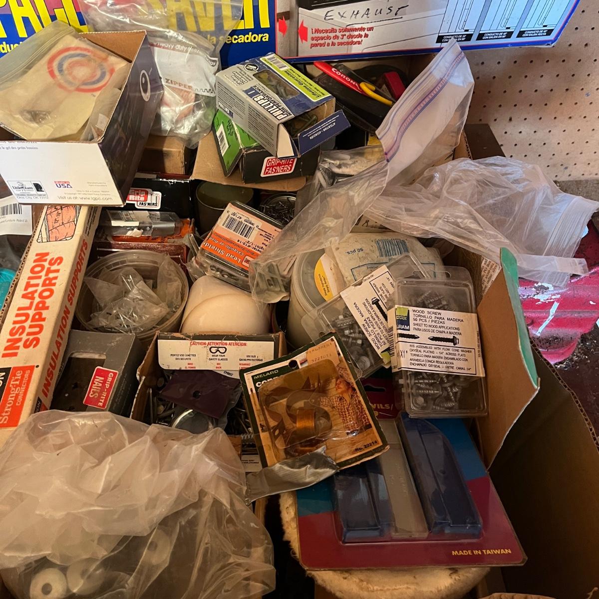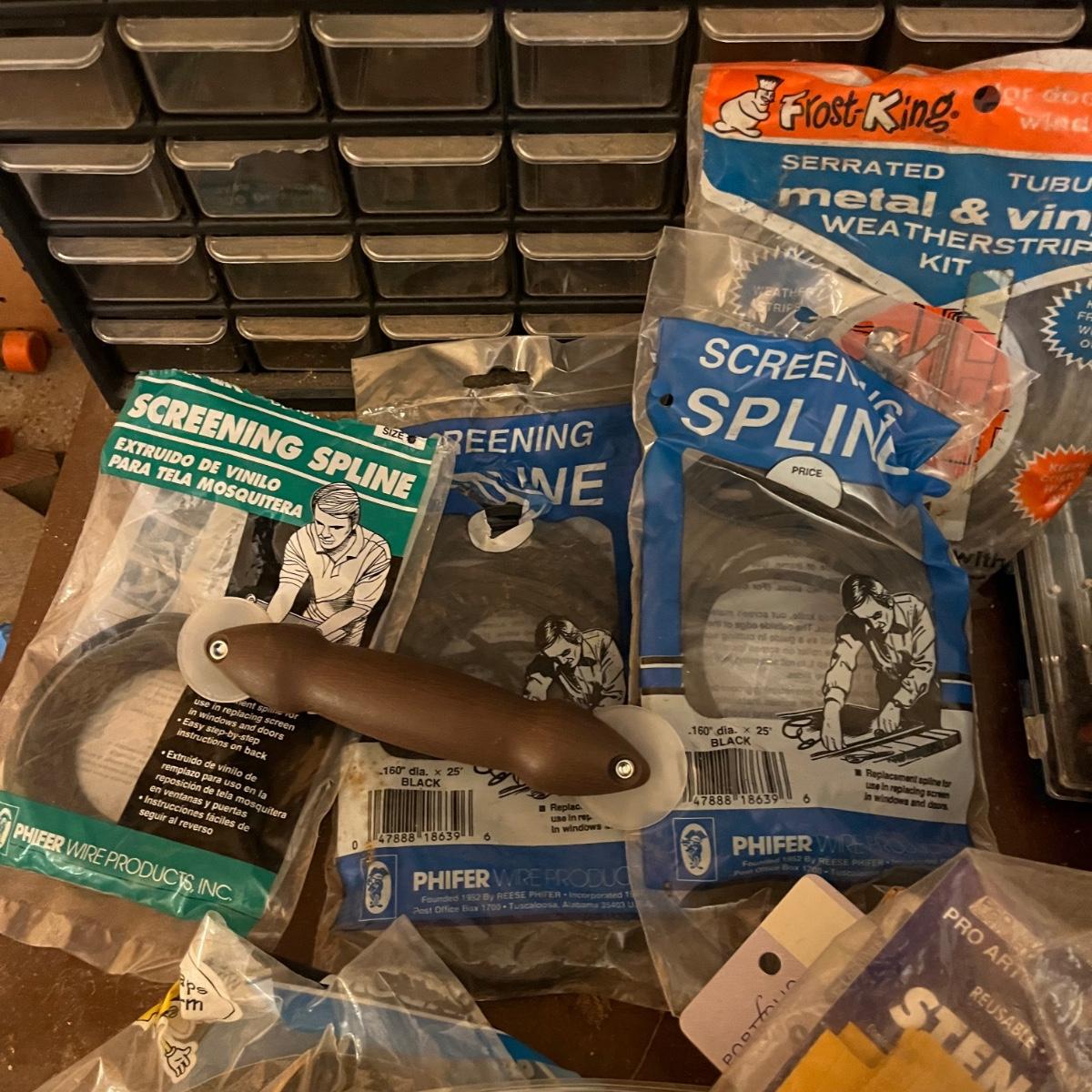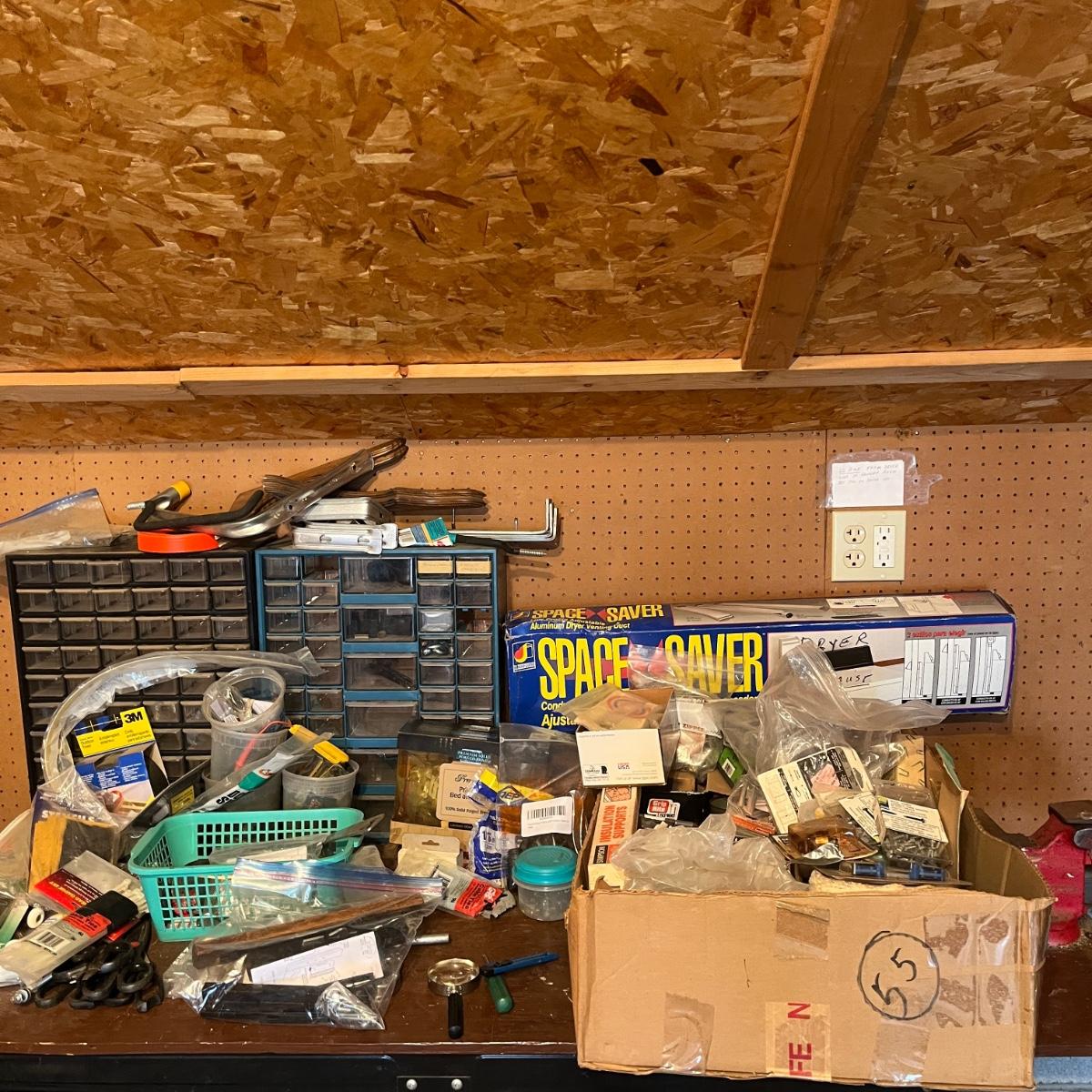 Lot contains a plethora of hardware including miniature storage bins that are empty, screws, nails, scissors screen spline, staples, cable ties and more. Largest storage bin measures 6” x 14” x 18”H.