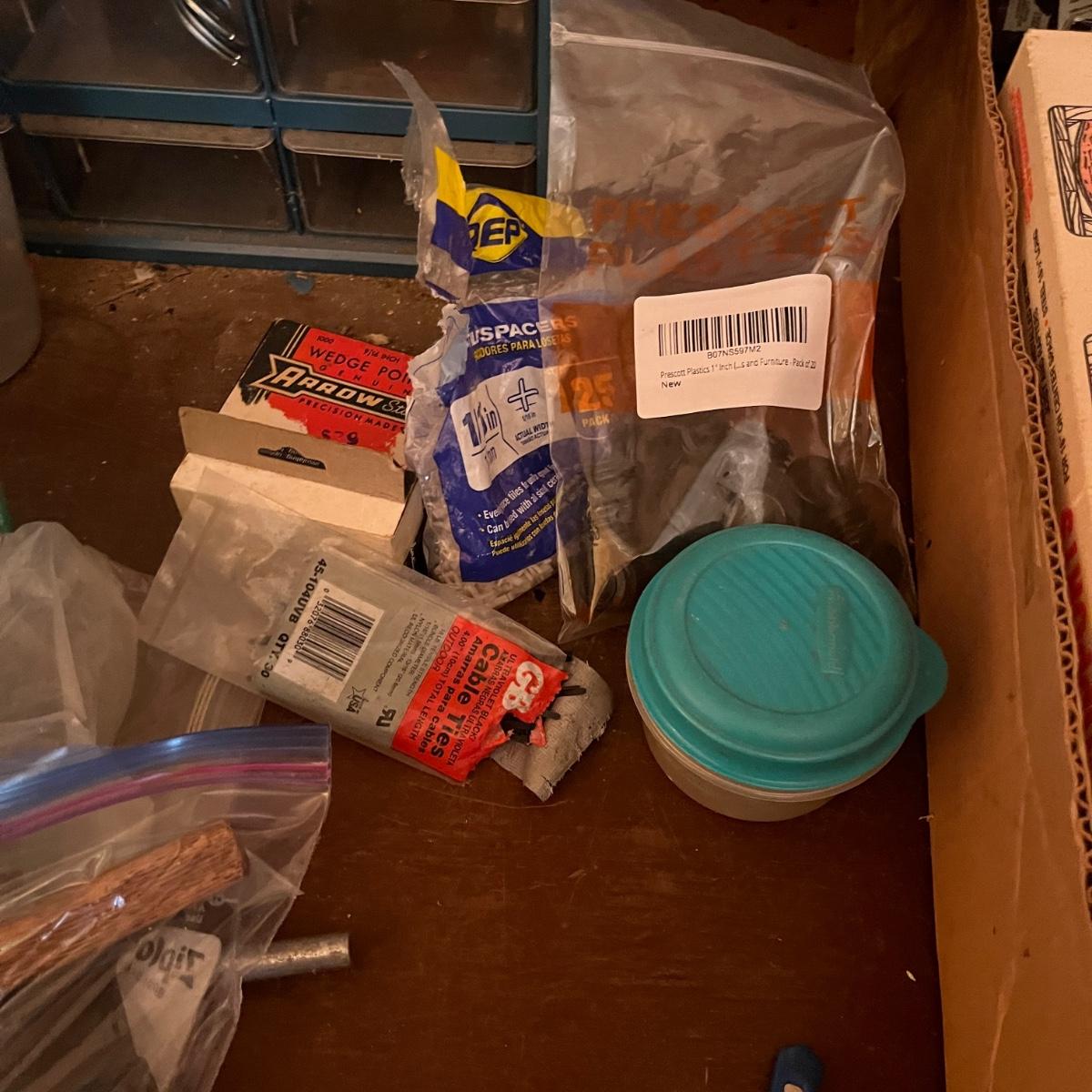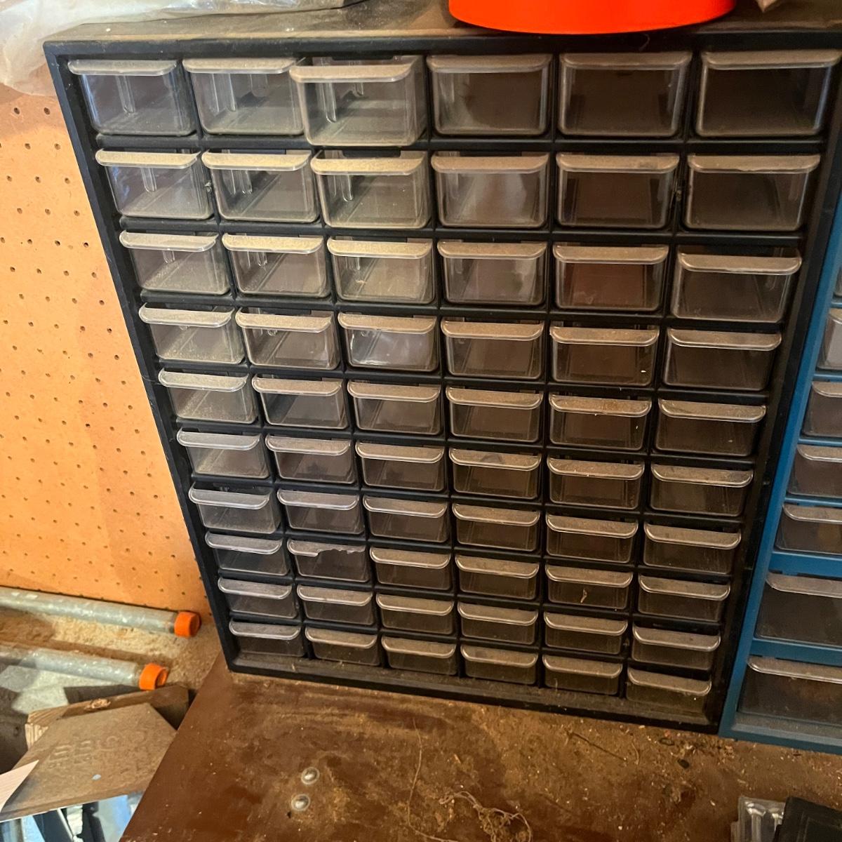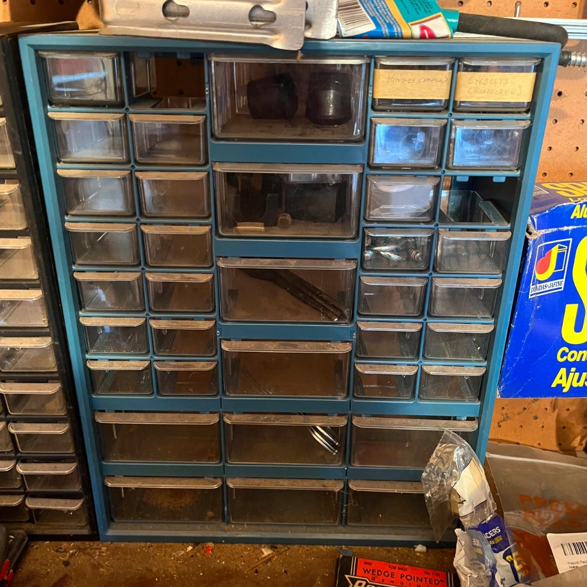 Lot contains a plethora of hardware including miniature storage bins that are empty, screws, nails, scissors screen spline, staples, cable ties and more. Largest storage bin measures 6” x 14” x 18”H.