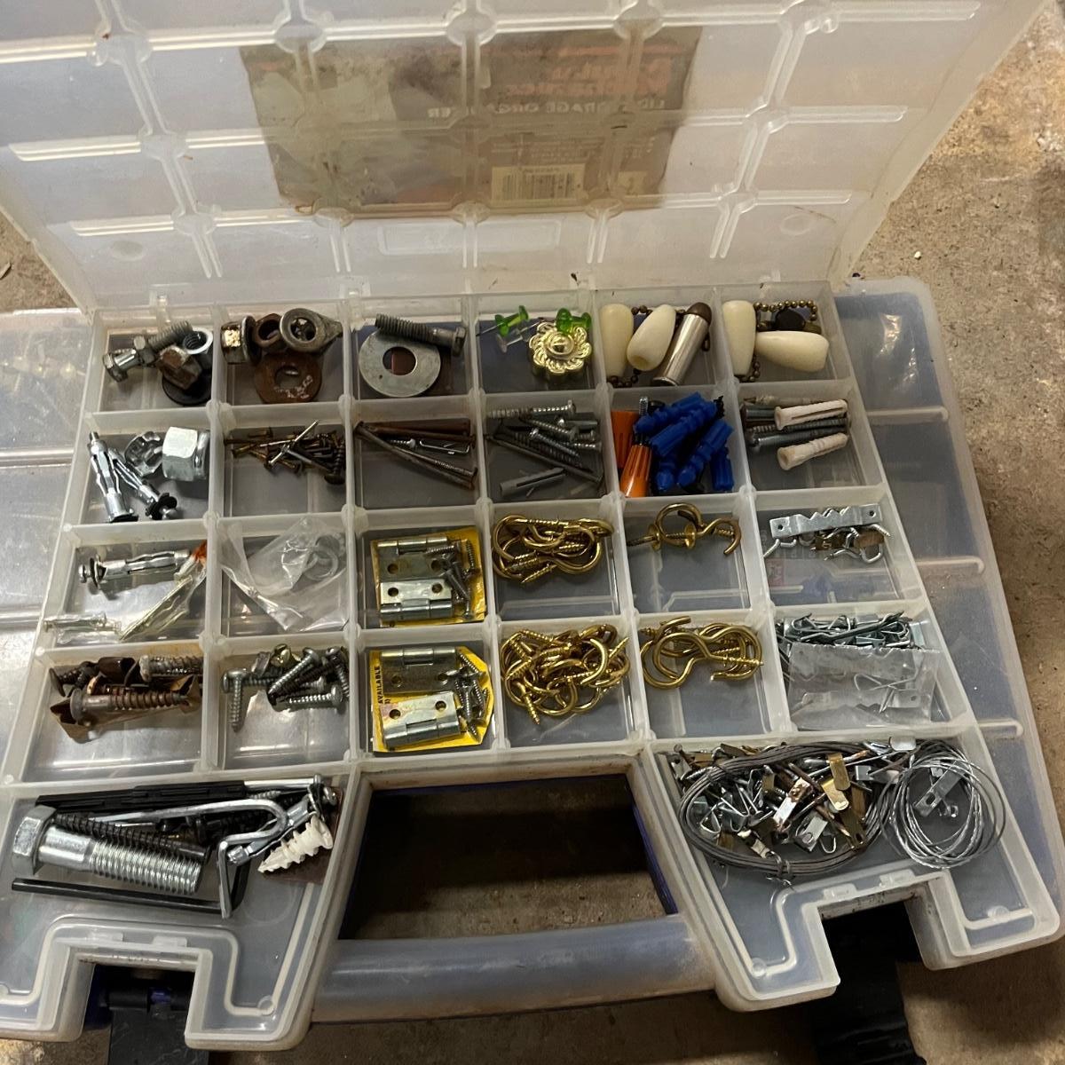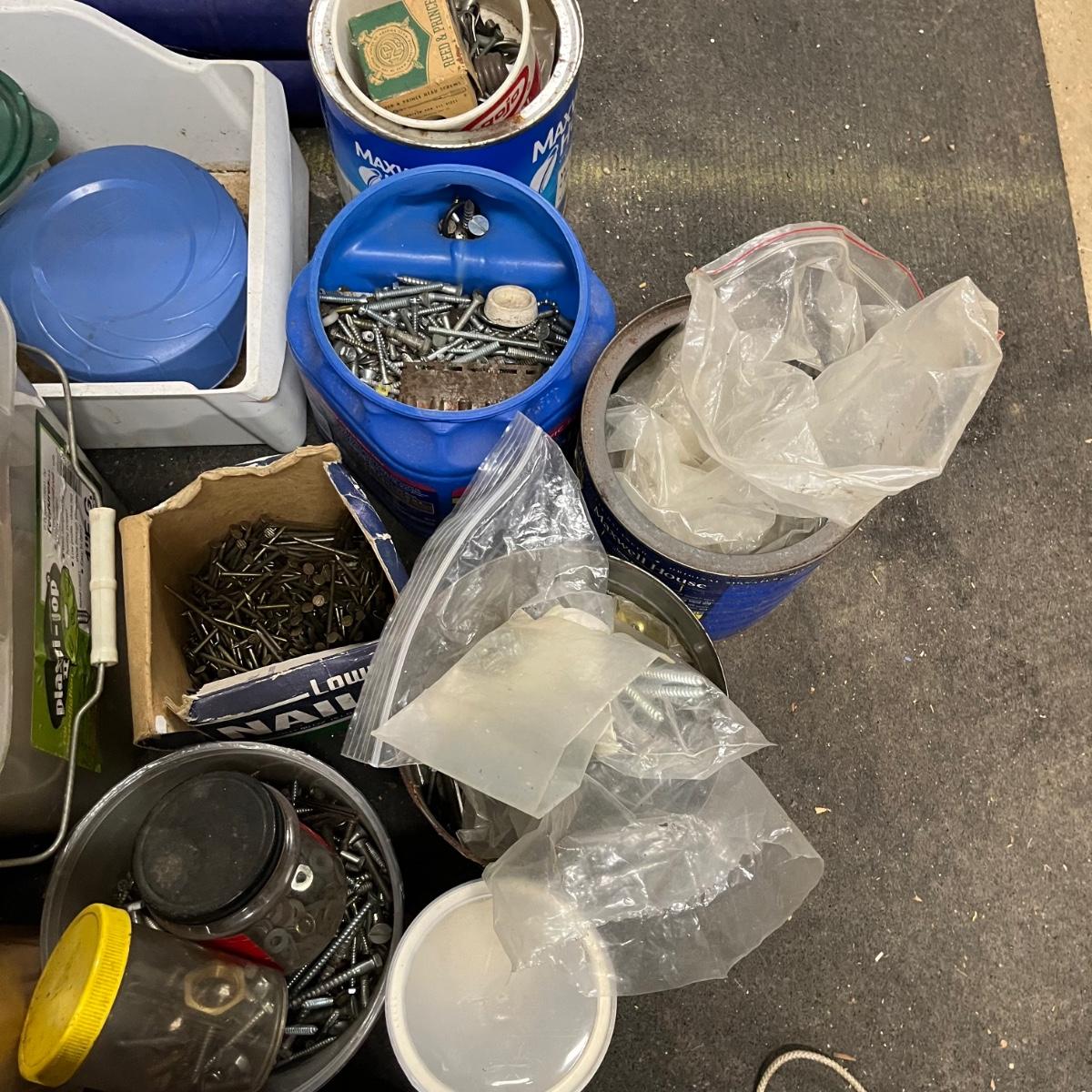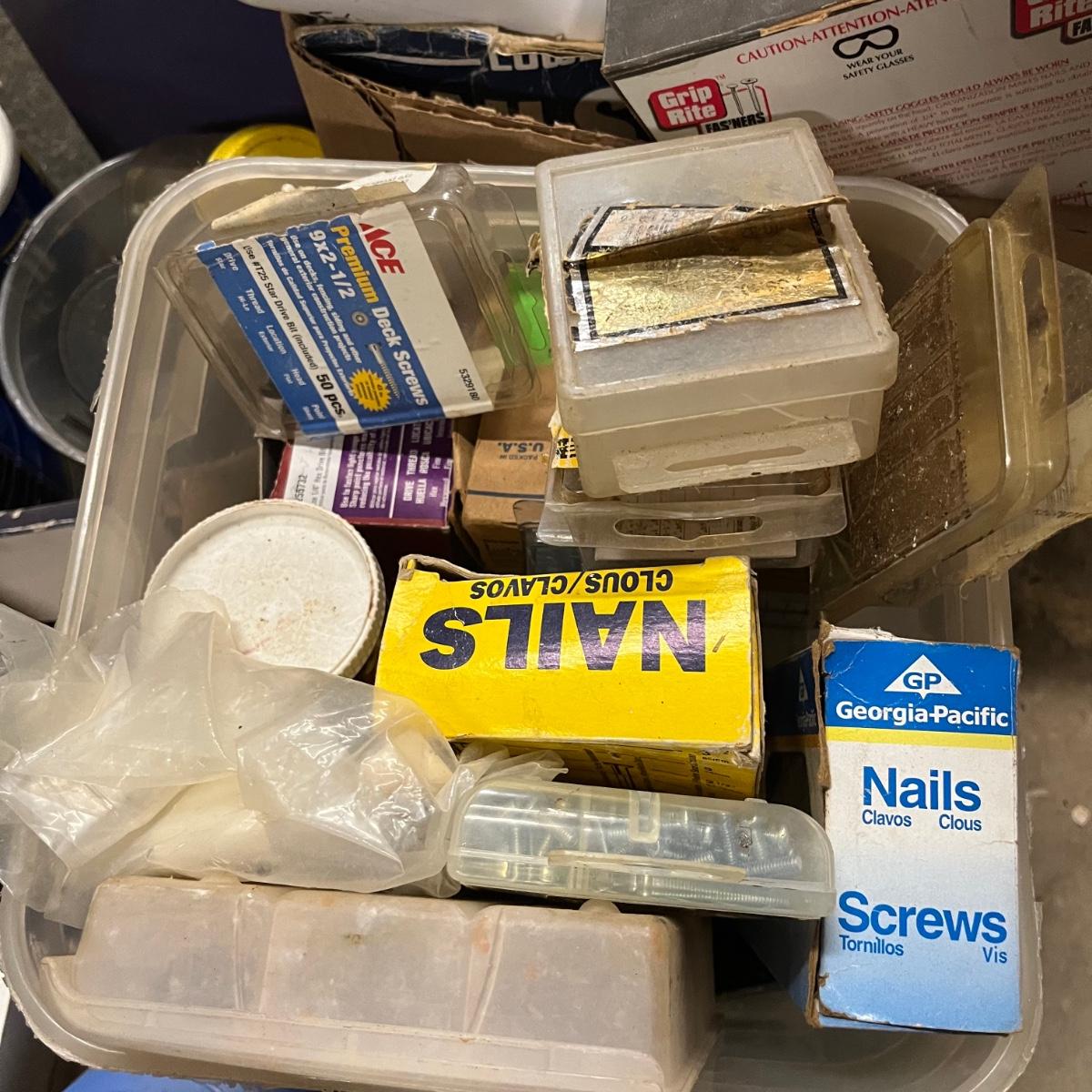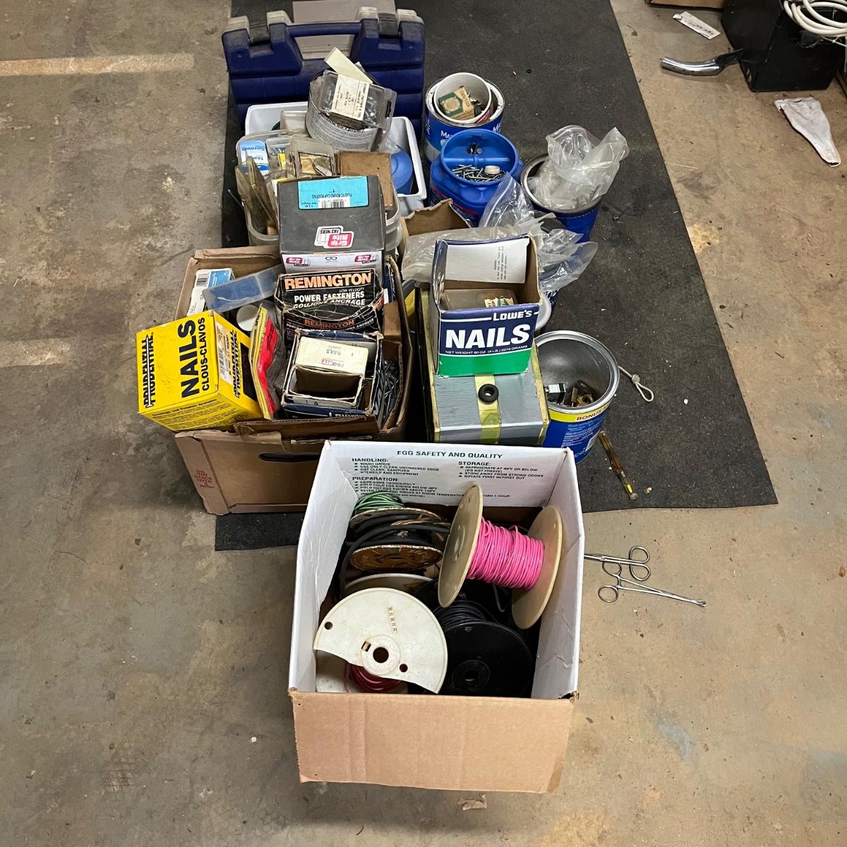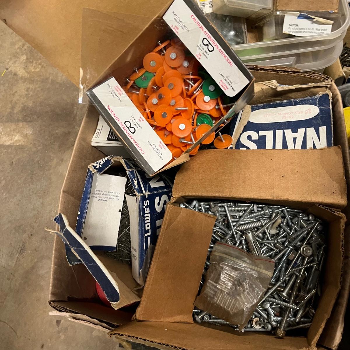 Lot includes a large selection of screws, bolts, nails, wire, box with assortment of hardware and more.