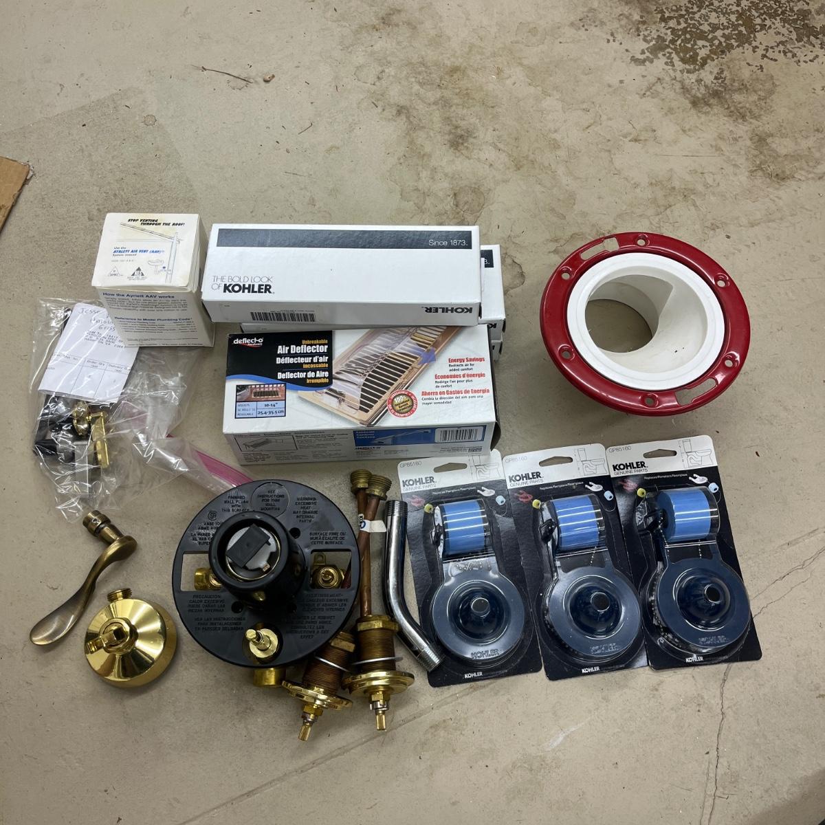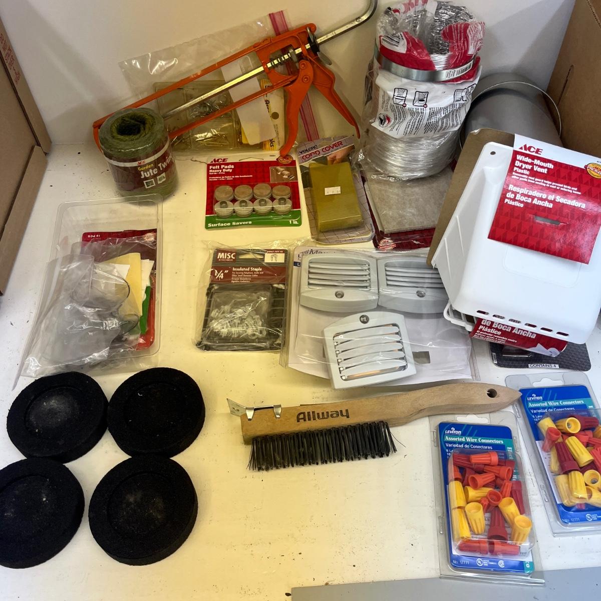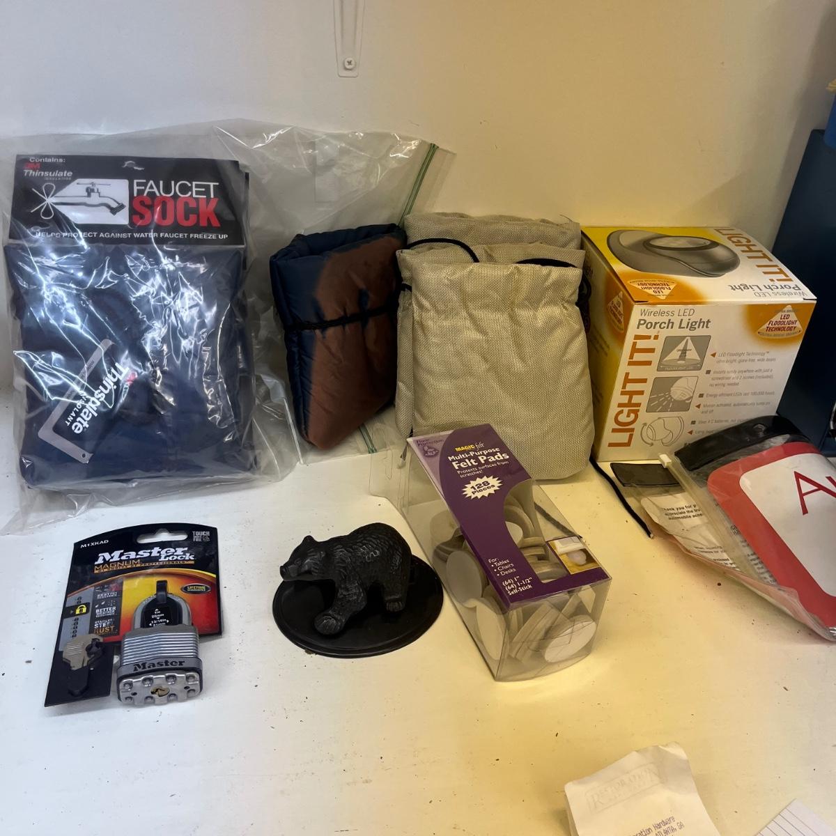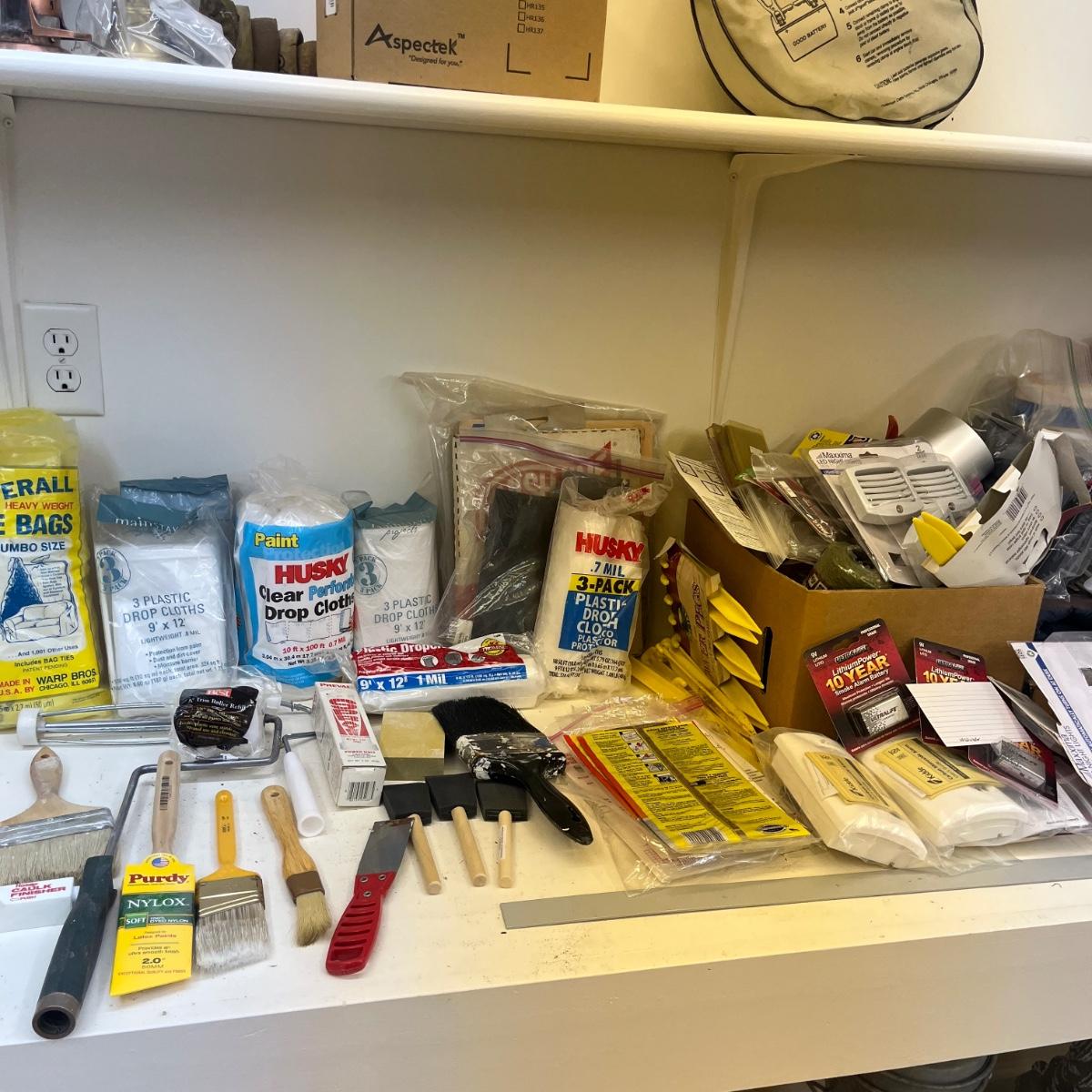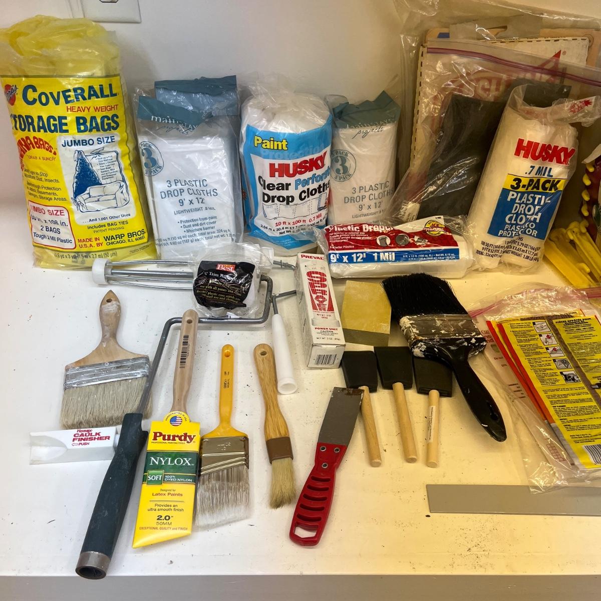 Lot includes a Restoration Hardware bear door knocker, paint brushes and rollers, plastic drop cloths, leather gloves, sandpaper, metal storage bin, faucet socks and more. Also includes plumbing supplies.