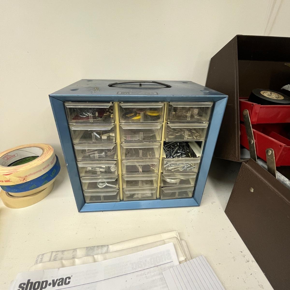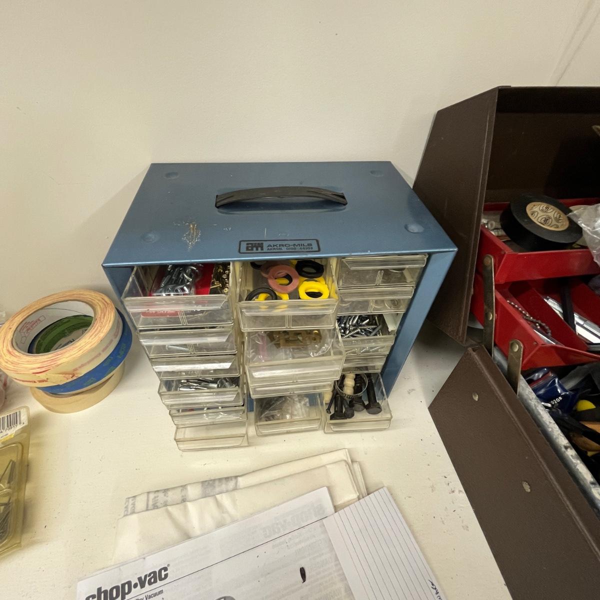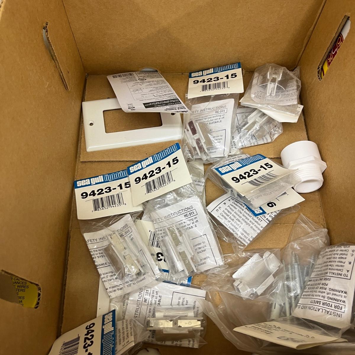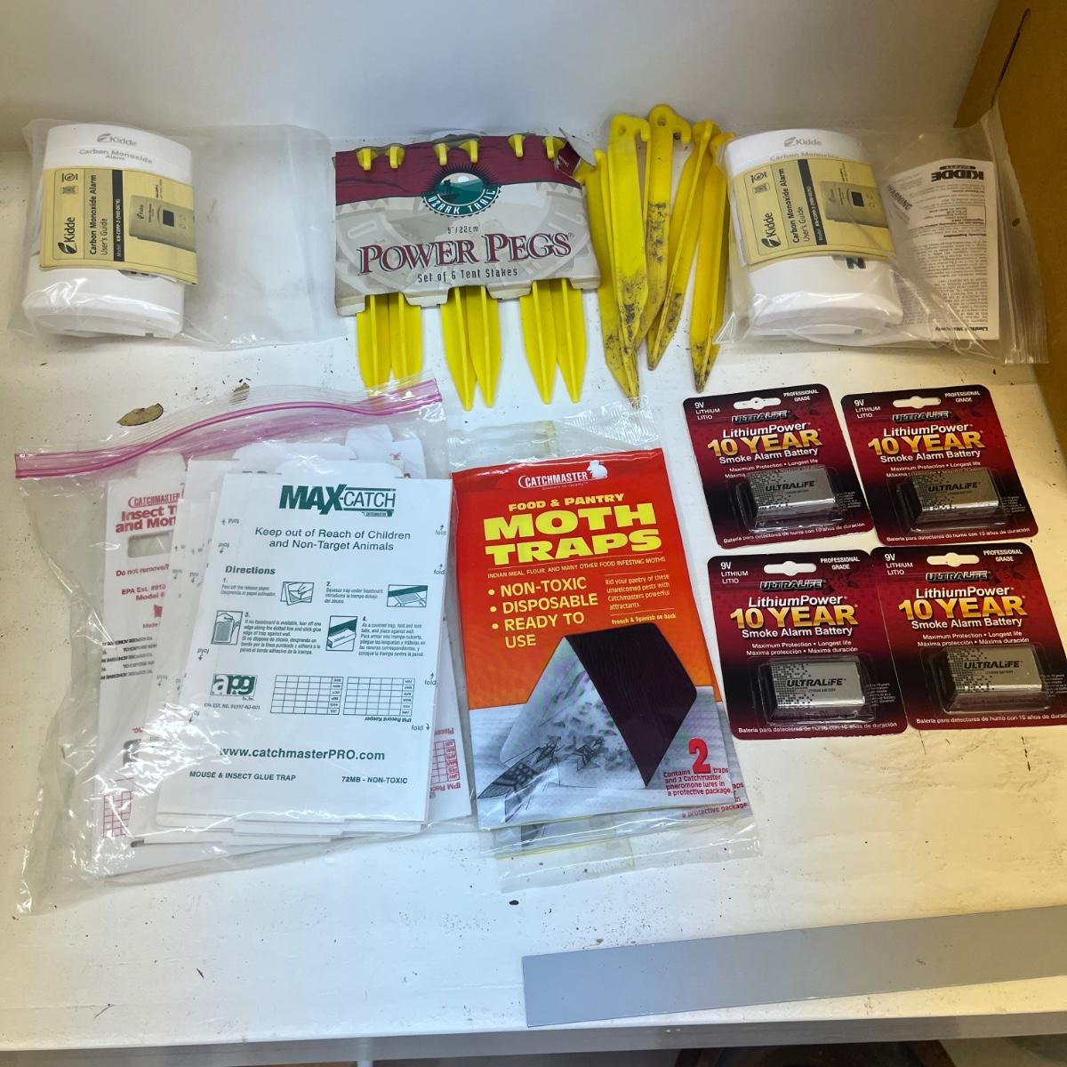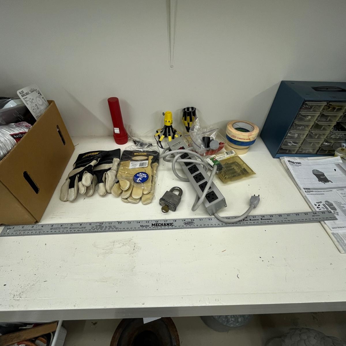 Lot includes a Restoration Hardware bear door knocker, paint brushes and rollers, plastic drop cloths, leather gloves, sandpaper, metal storage bin, faucet socks and more. Also includes plumbing supplies.
