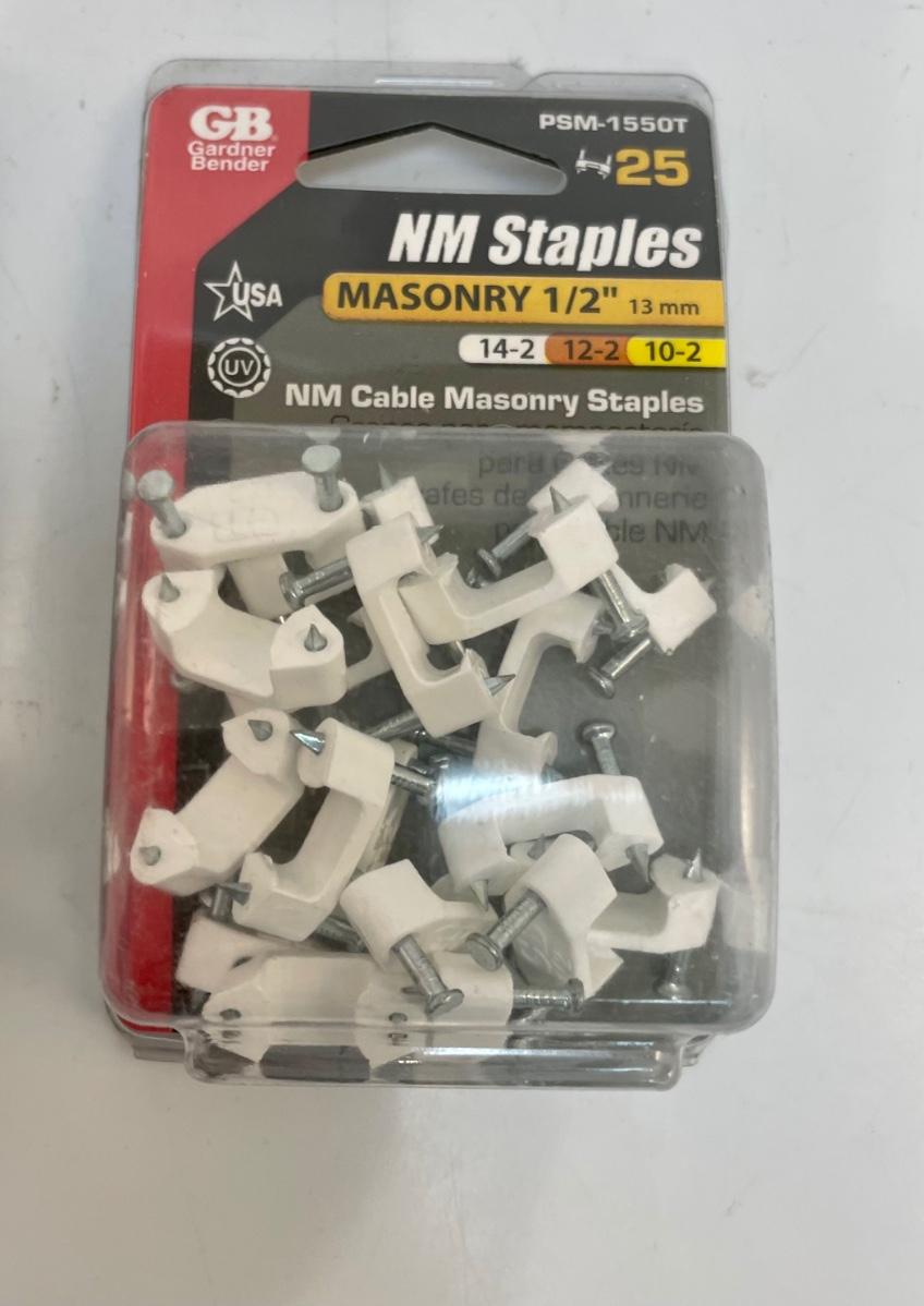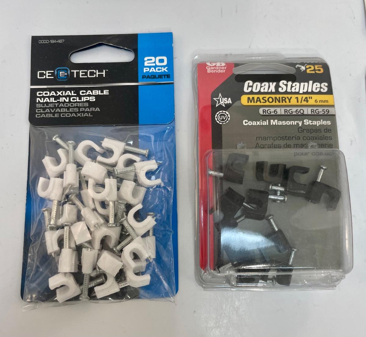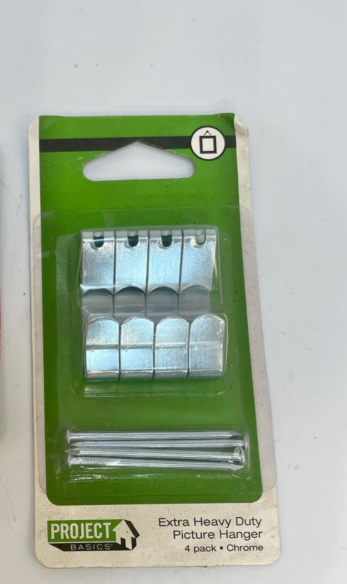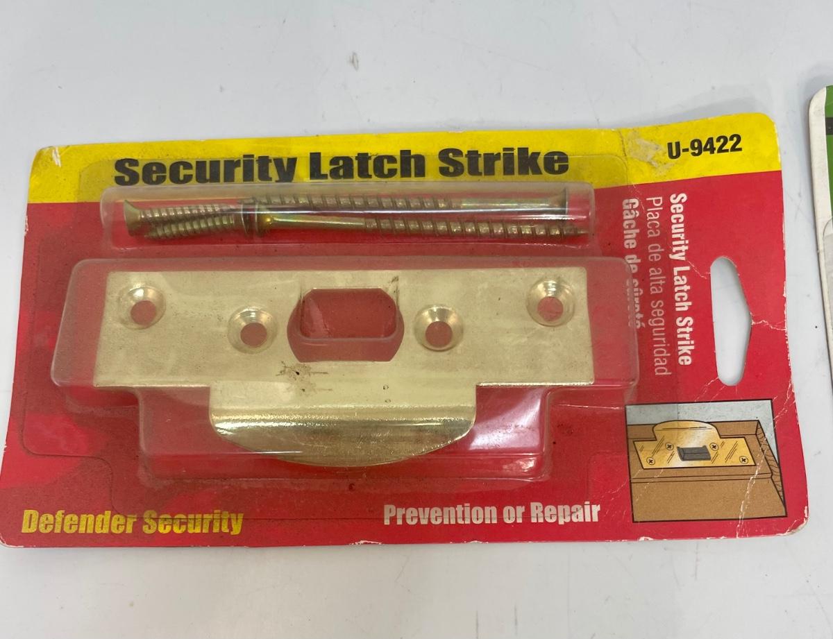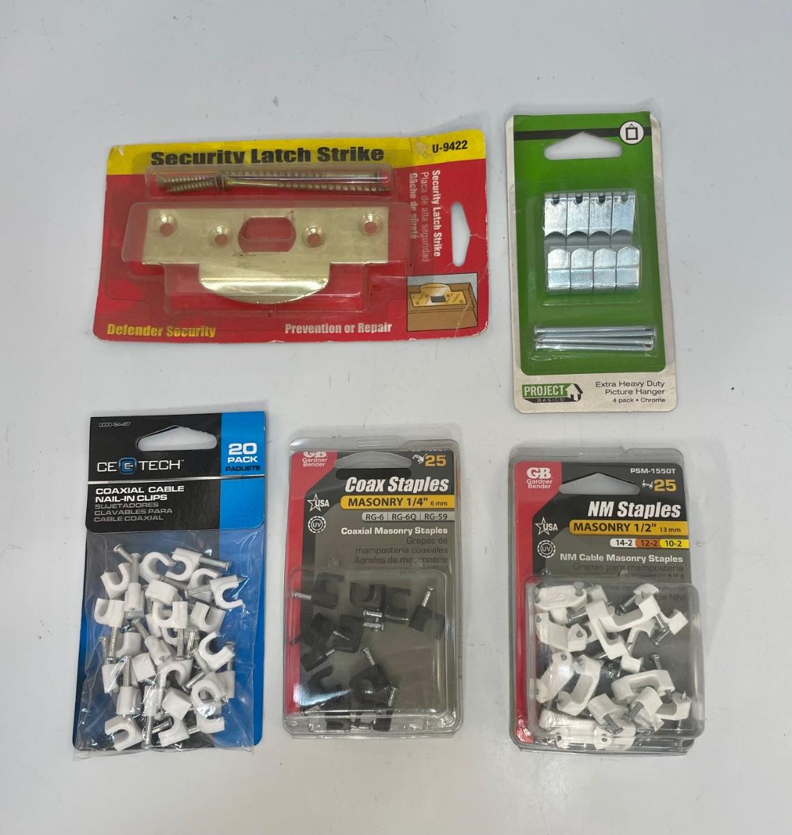 Includes unopened packages: brass security door latch strike, heavy duty picture hangers, and 3 different sizes of coax cable/electrical cable staples.