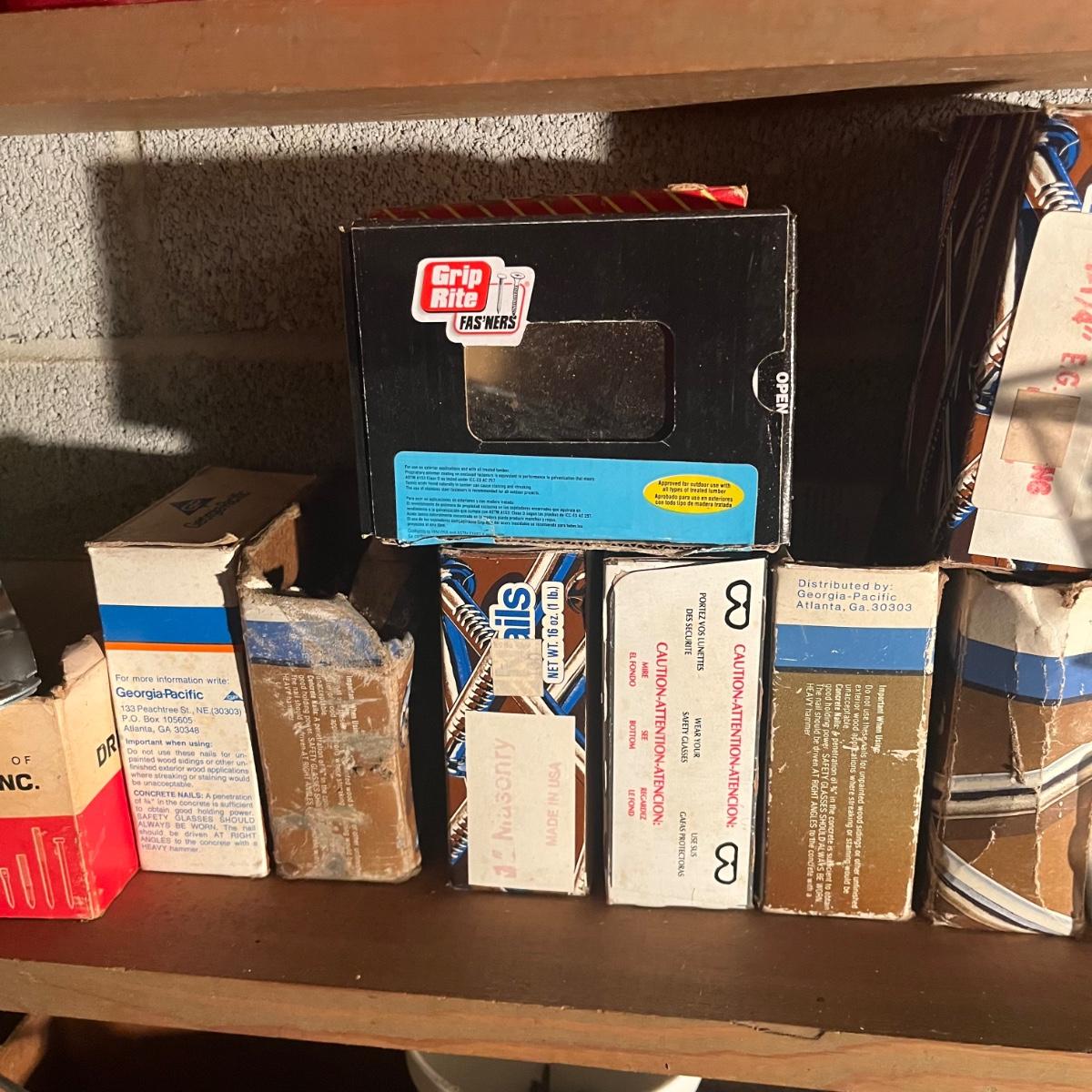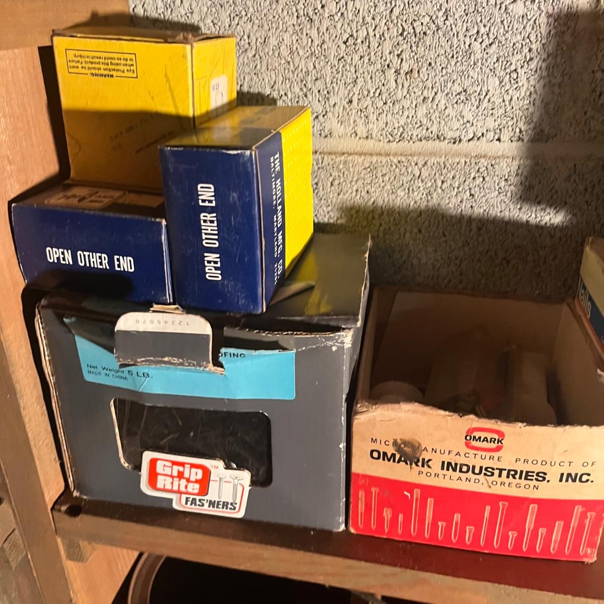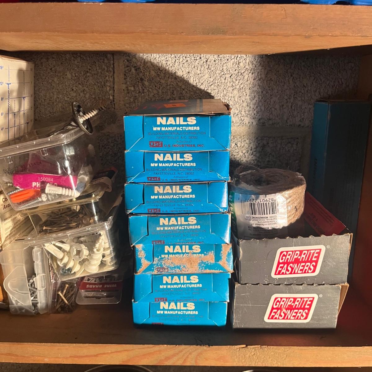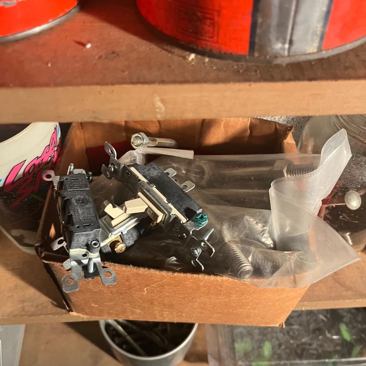 Lot includes a selection of nails, screws, electrical outlets and switches, fuses, assortment of bolts and more.