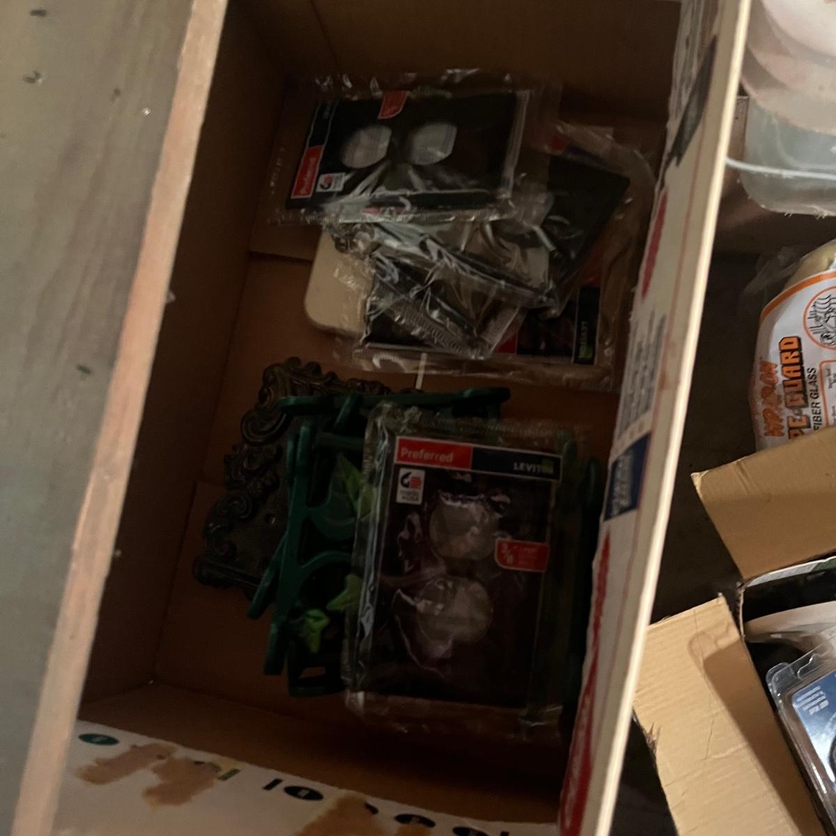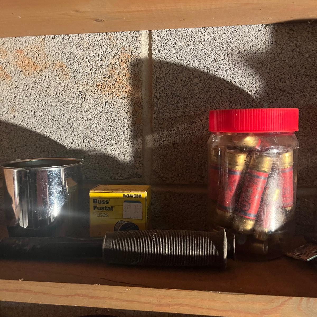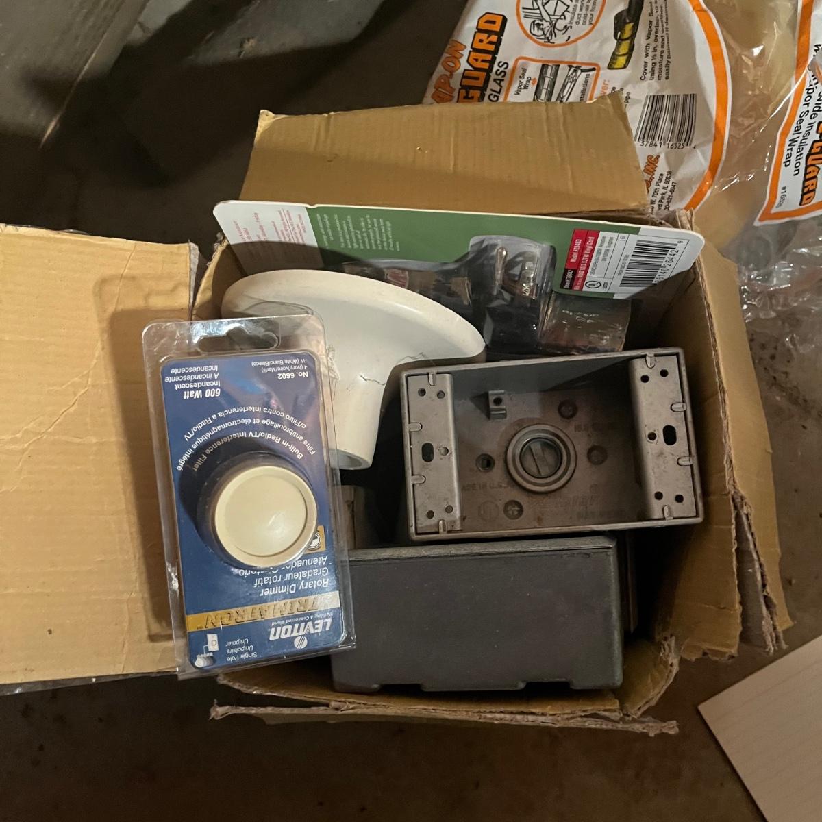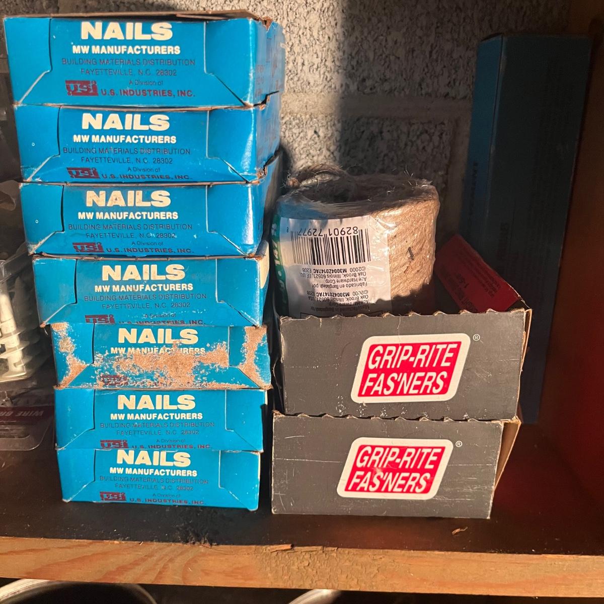 Lot includes a selection of nails, screws, electrical outlets and switches, fuses, assortment of bolts and more.