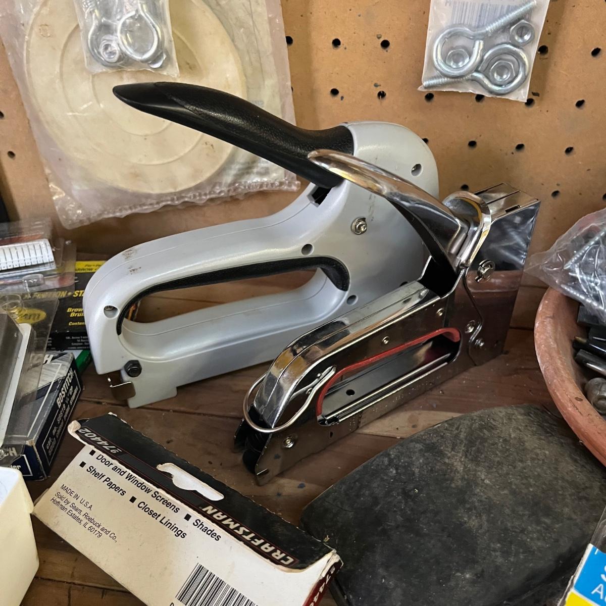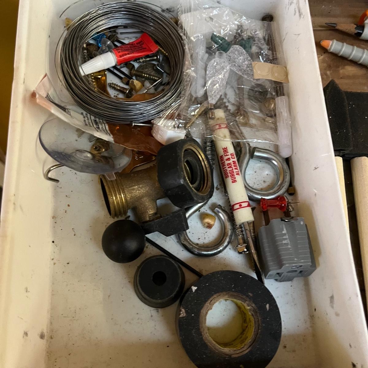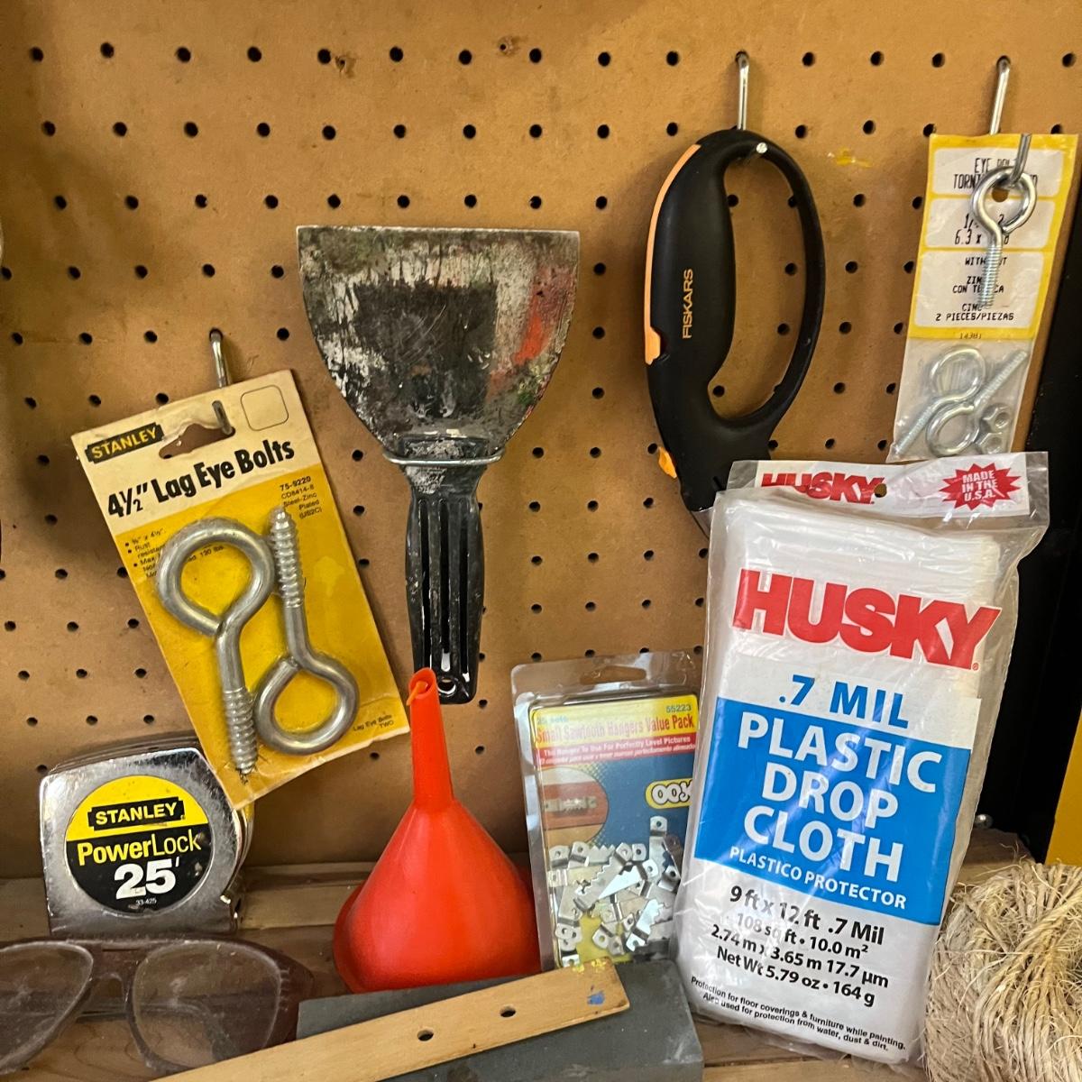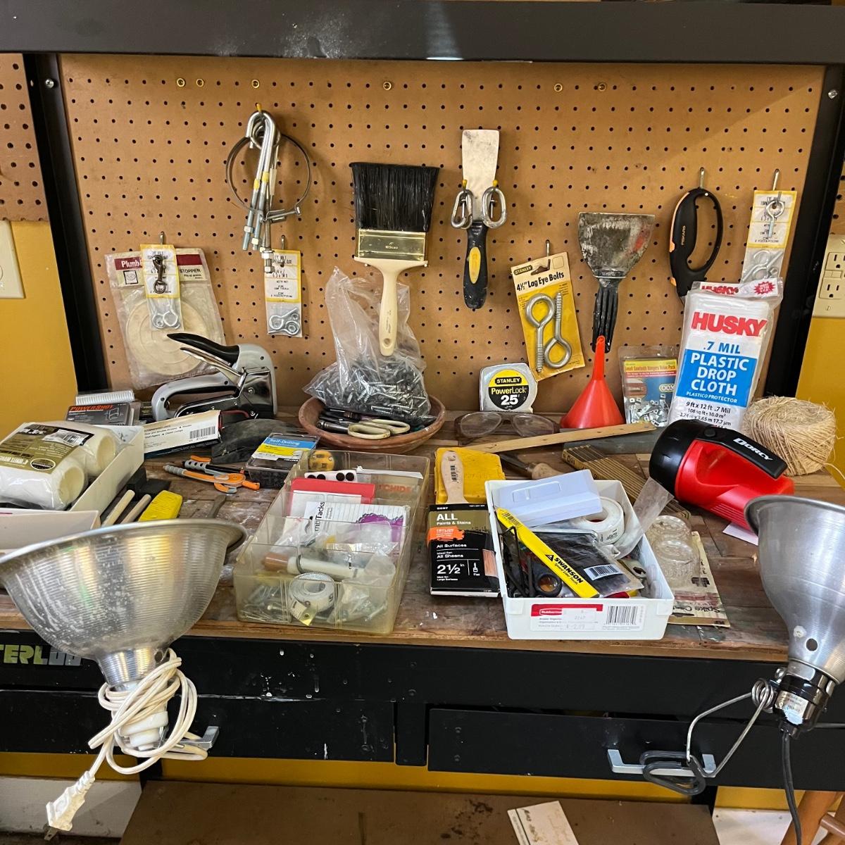 Lot contains a selection of hardware including two clamp lights, flashlights, utility knife, eye bolts, plastic drop cloth, Arrow stapler, Power Shot cable tracker and more. Bench not included.
