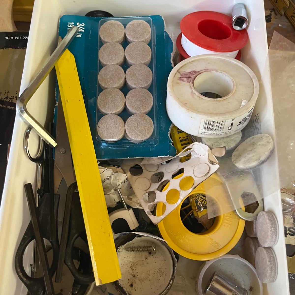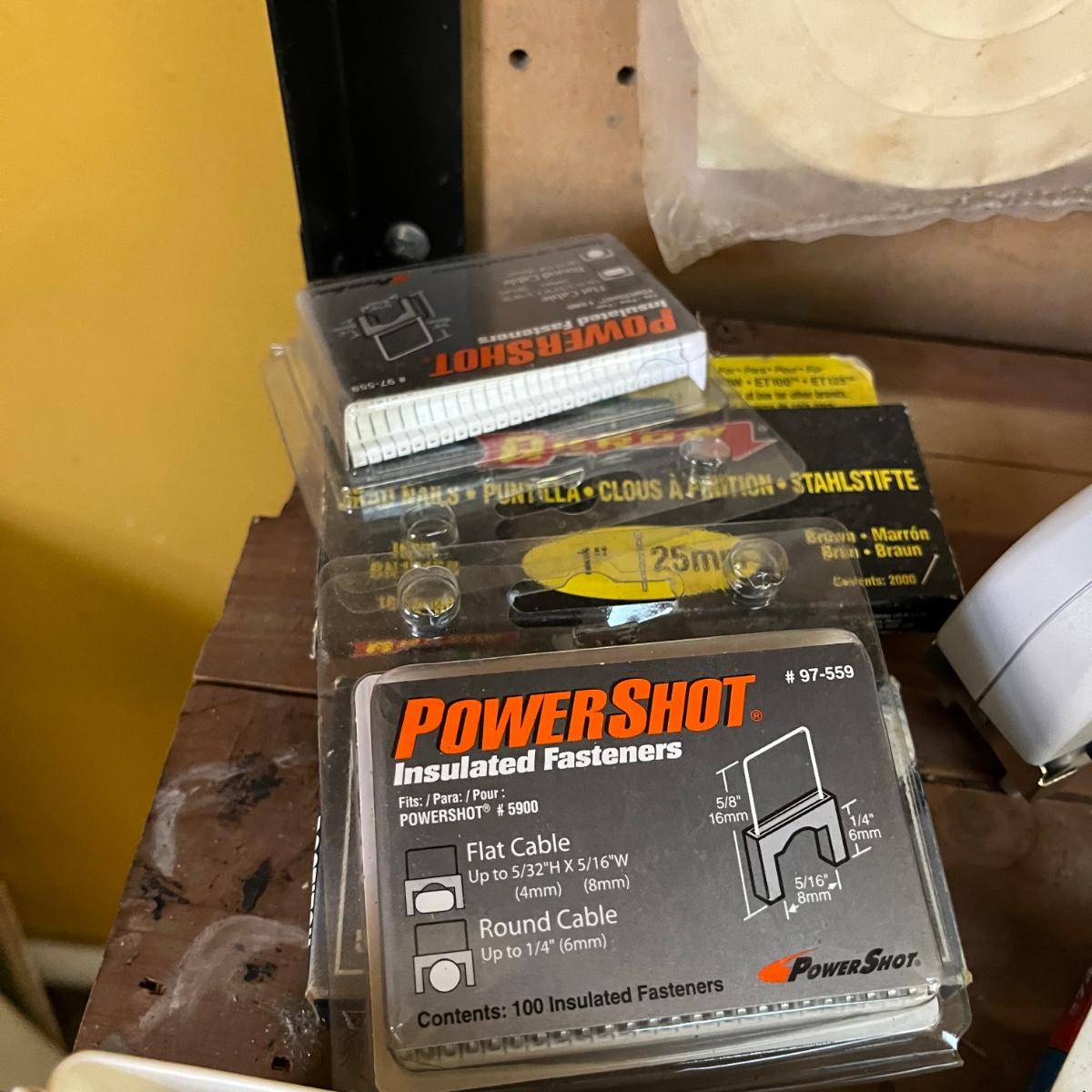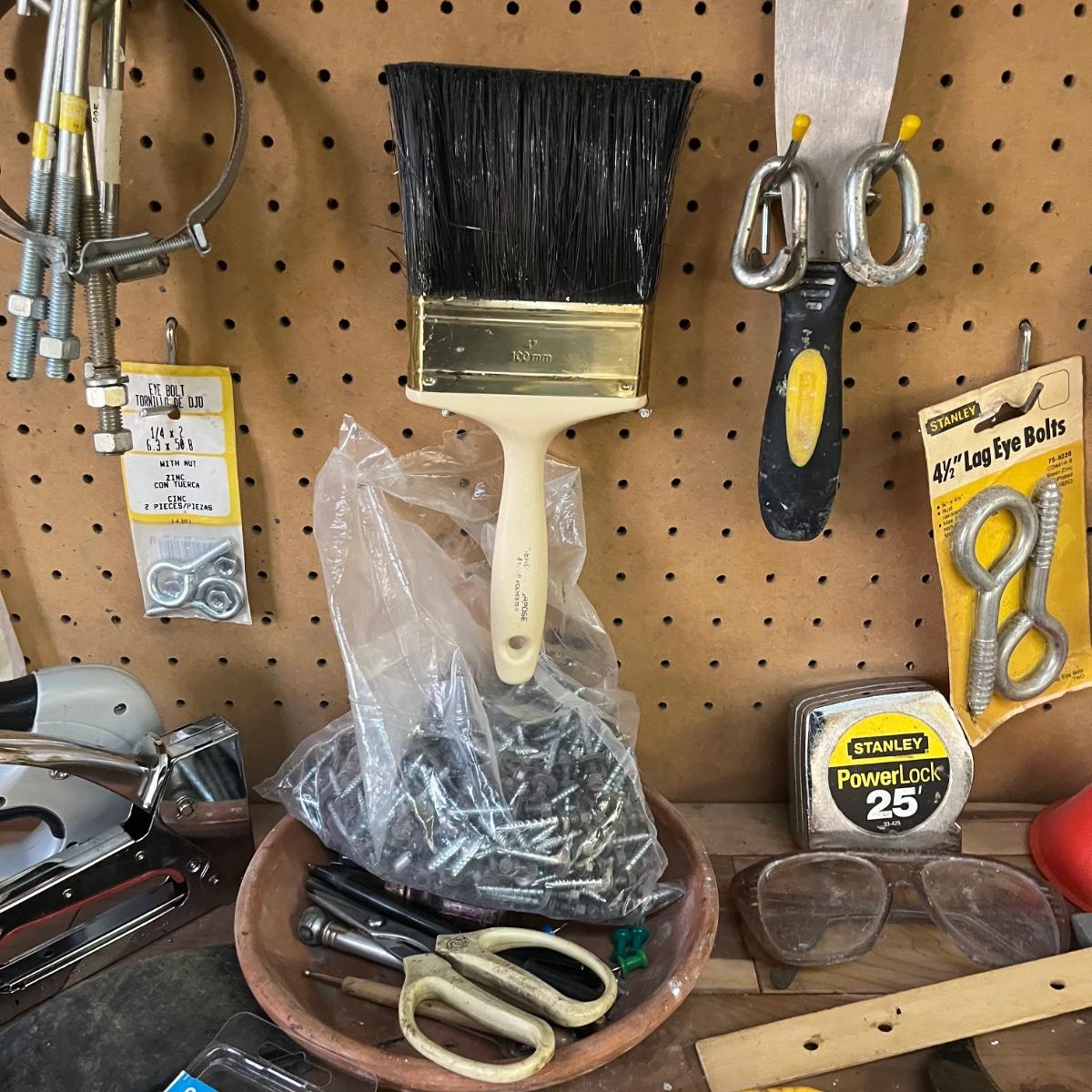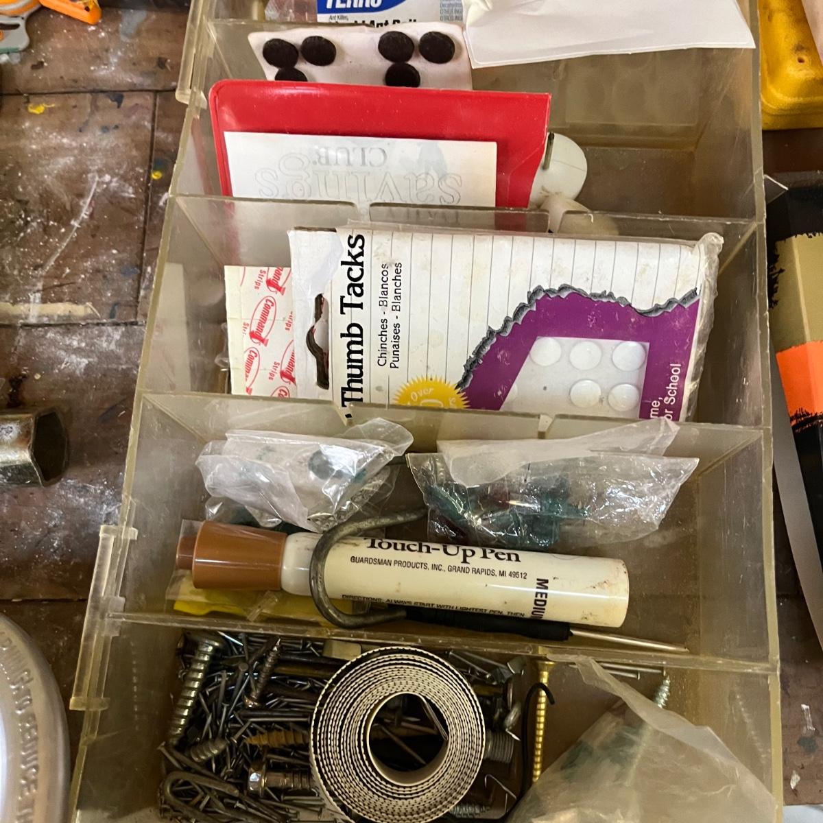 Lot contains a selection of hardware including two clamp lights, flashlights, utility knife, eye bolts, plastic drop cloth, Arrow stapler, Power Shot cable tracker and more. Bench not included.