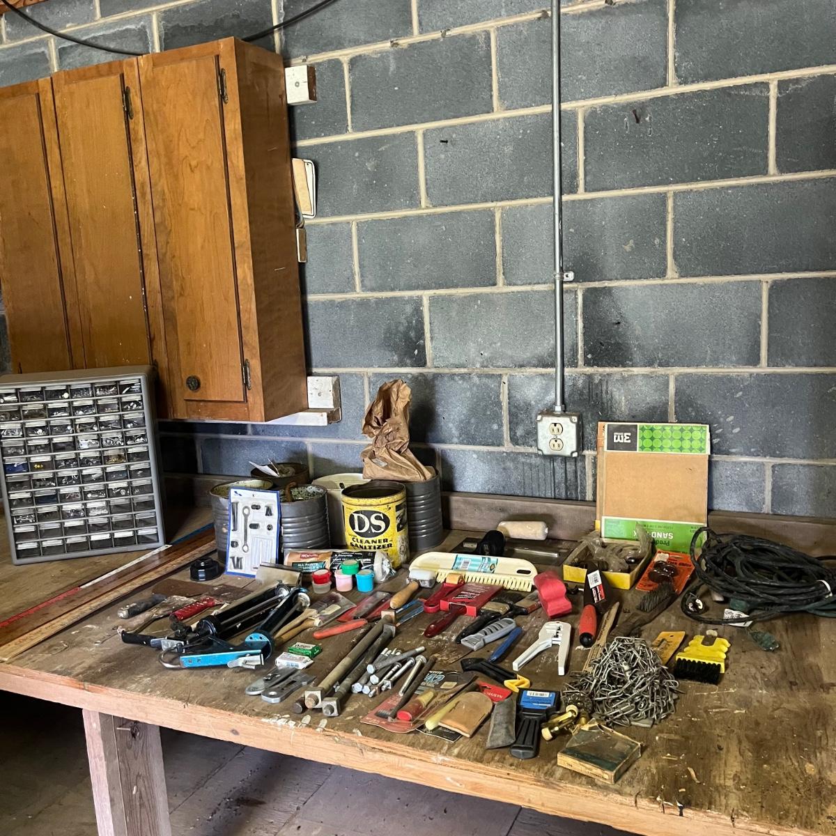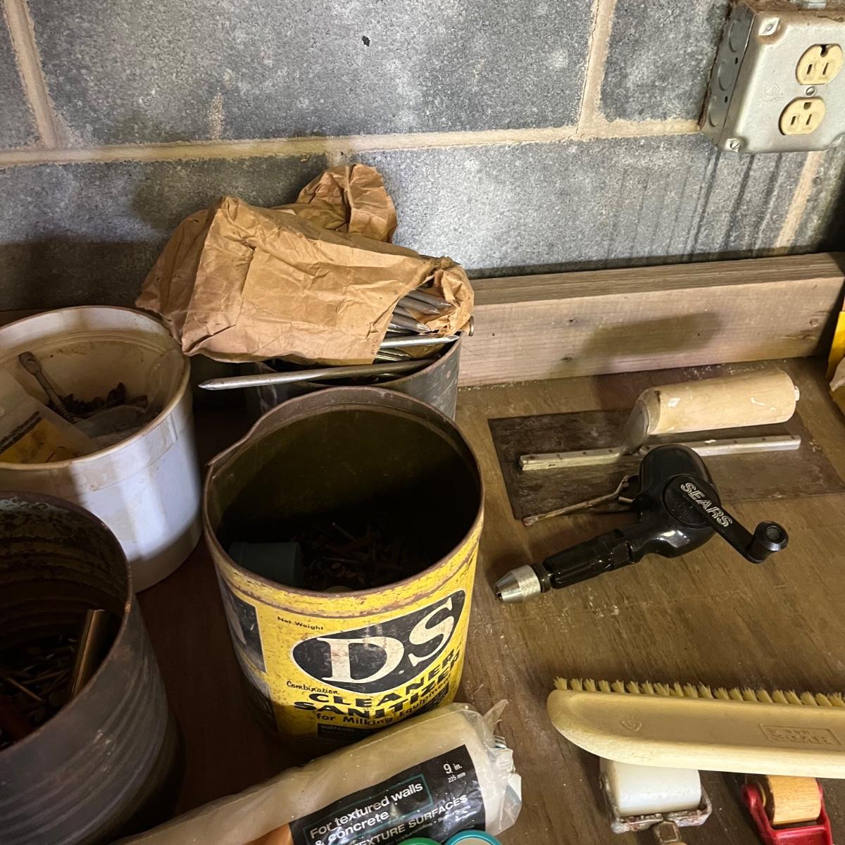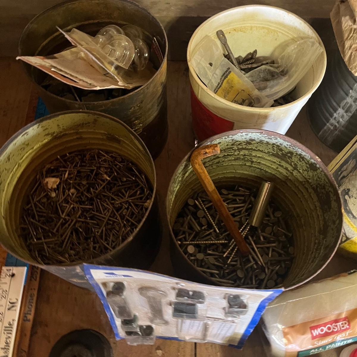 Lot includes a plastic 60 drawer hardware holder, wooden yardsticks, paint brushes, caulking guns, extension cords, scrapers, sandpaper and an assortment of nails and screws in coffee cans.