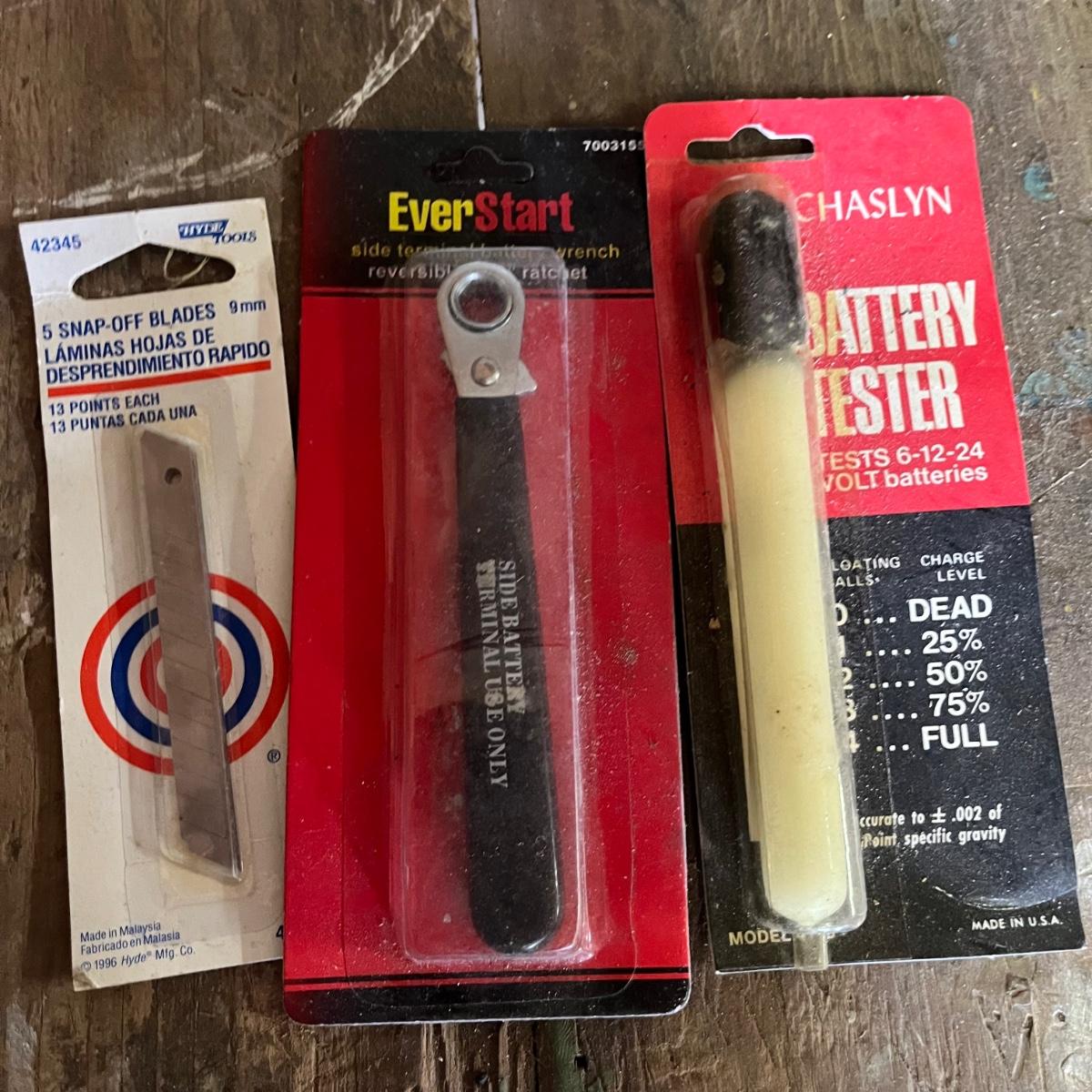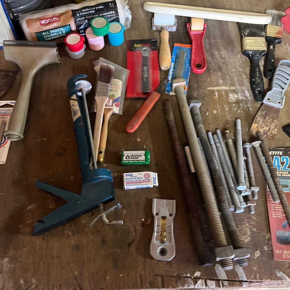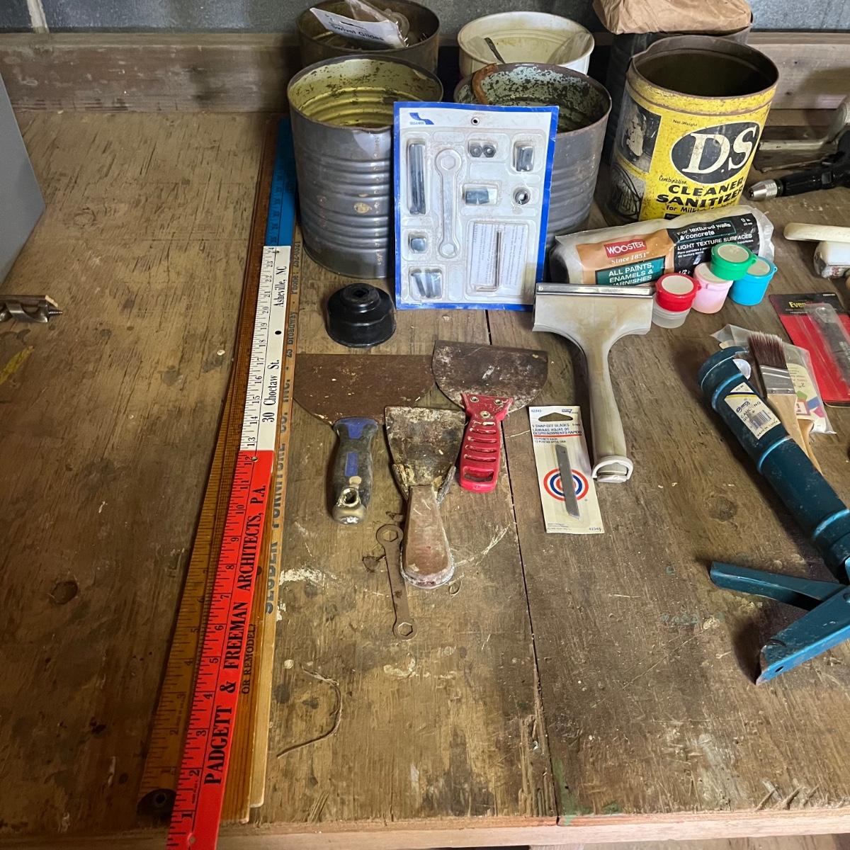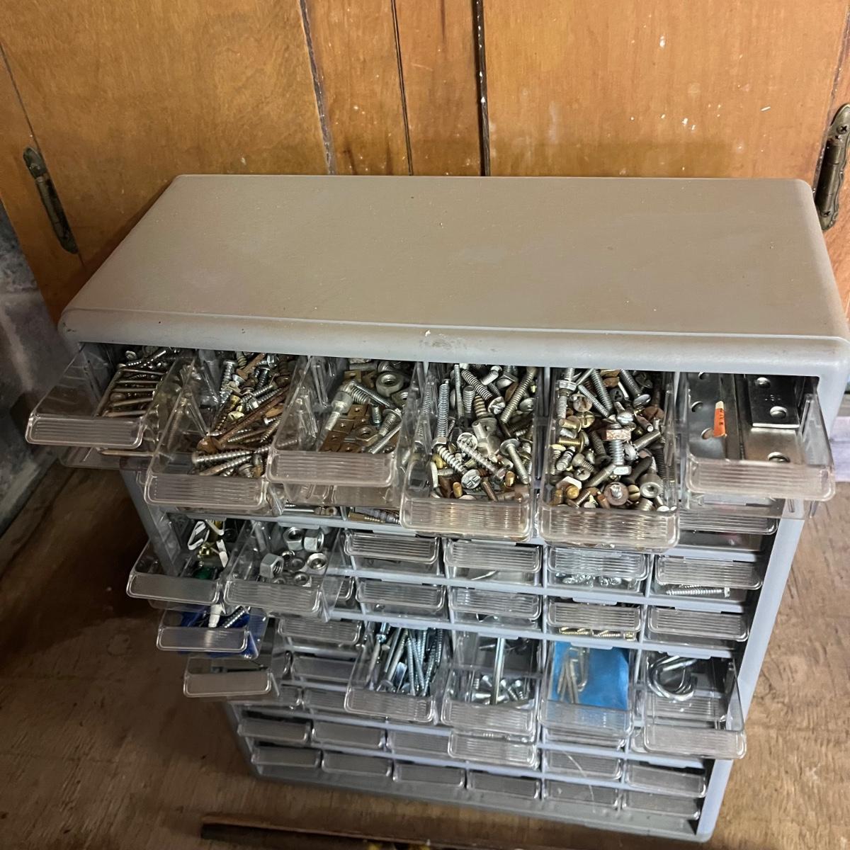 Lot includes a plastic 60 drawer hardware holder, wooden yardsticks, paint brushes, caulking guns, extension cords, scrapers, sandpaper and an assortment of nails and screws in coffee cans.