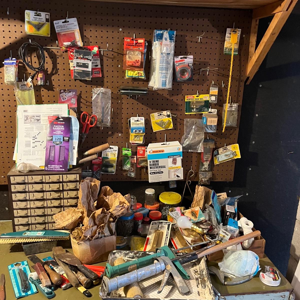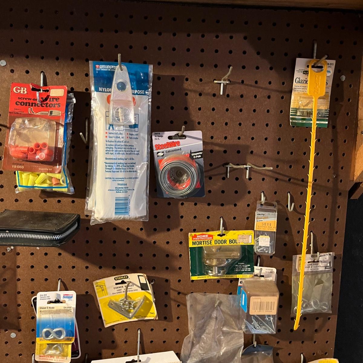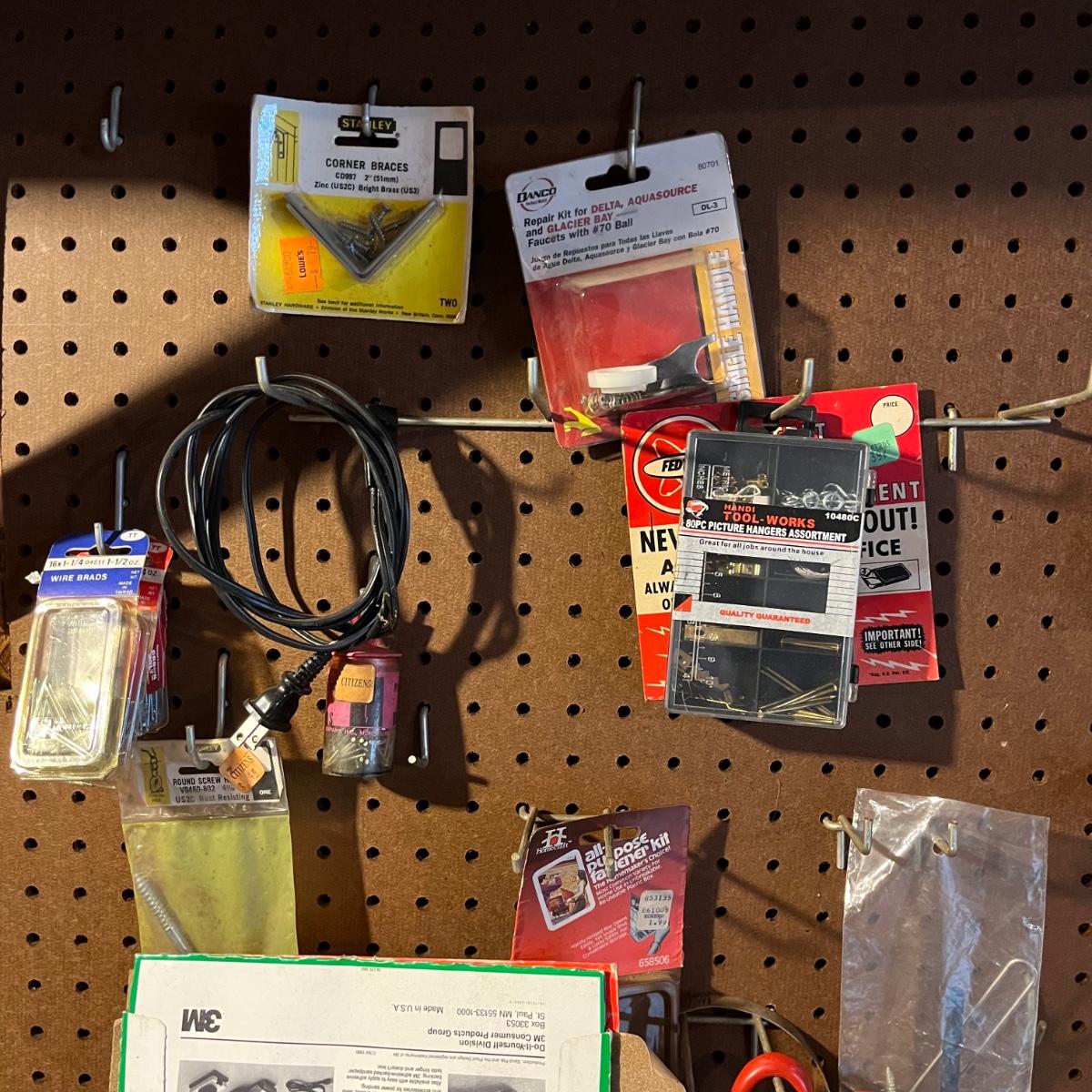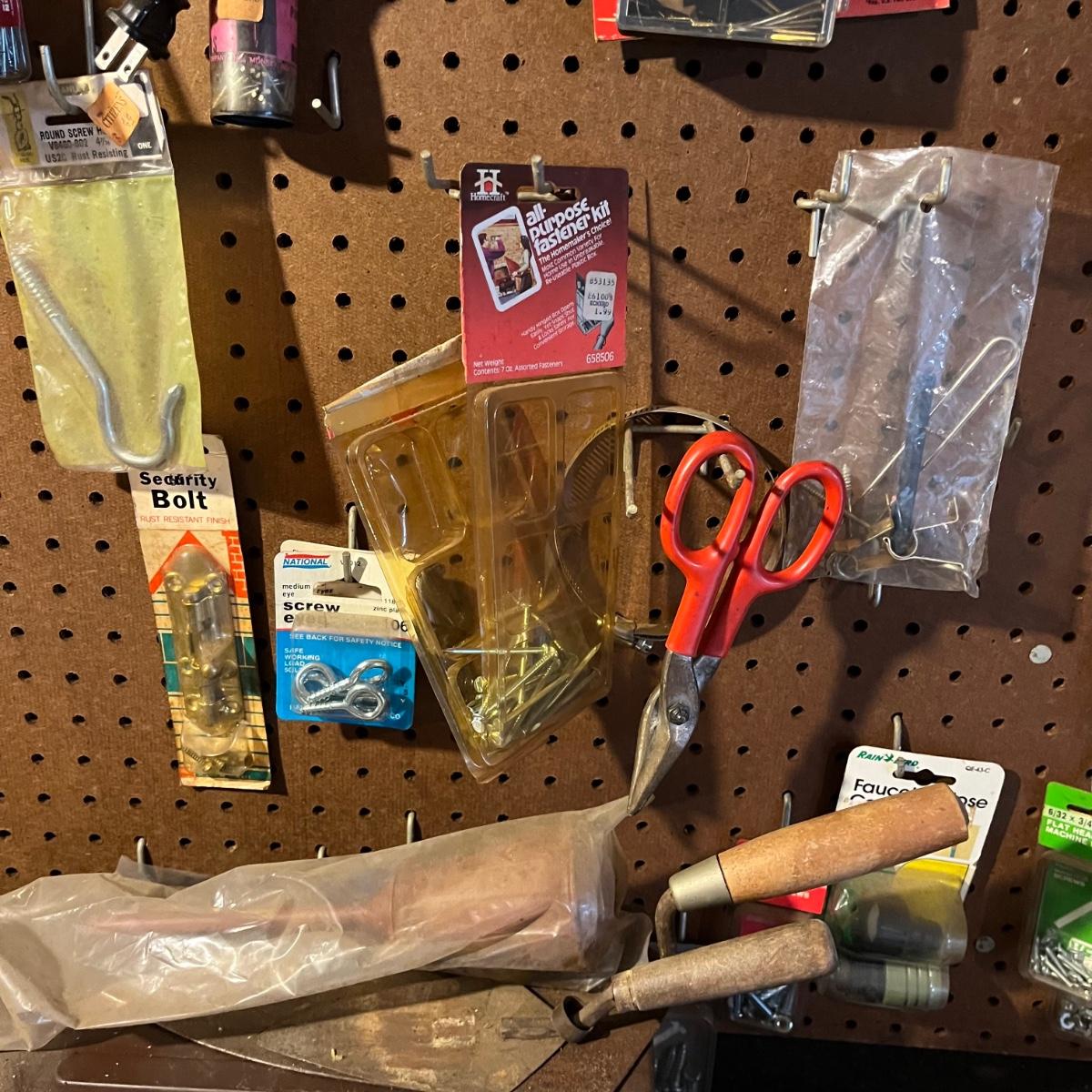Lot contains a large selection of hardware and more including scrapers , paint brushes, roller tray, peg board accessories, bin container with contents, door locks, scissors and much more. The peg board itself is not included however the pegboard holders are included.