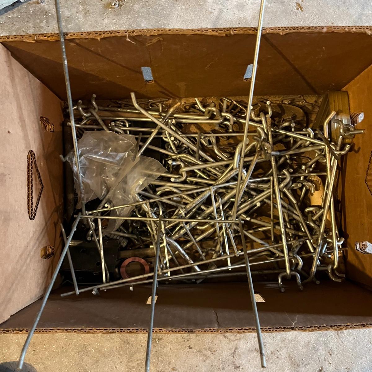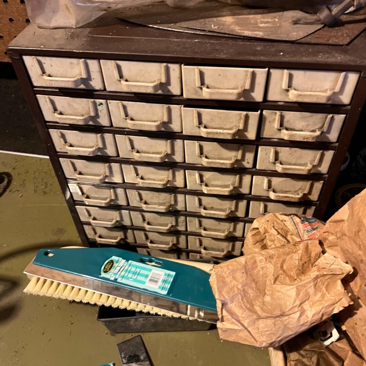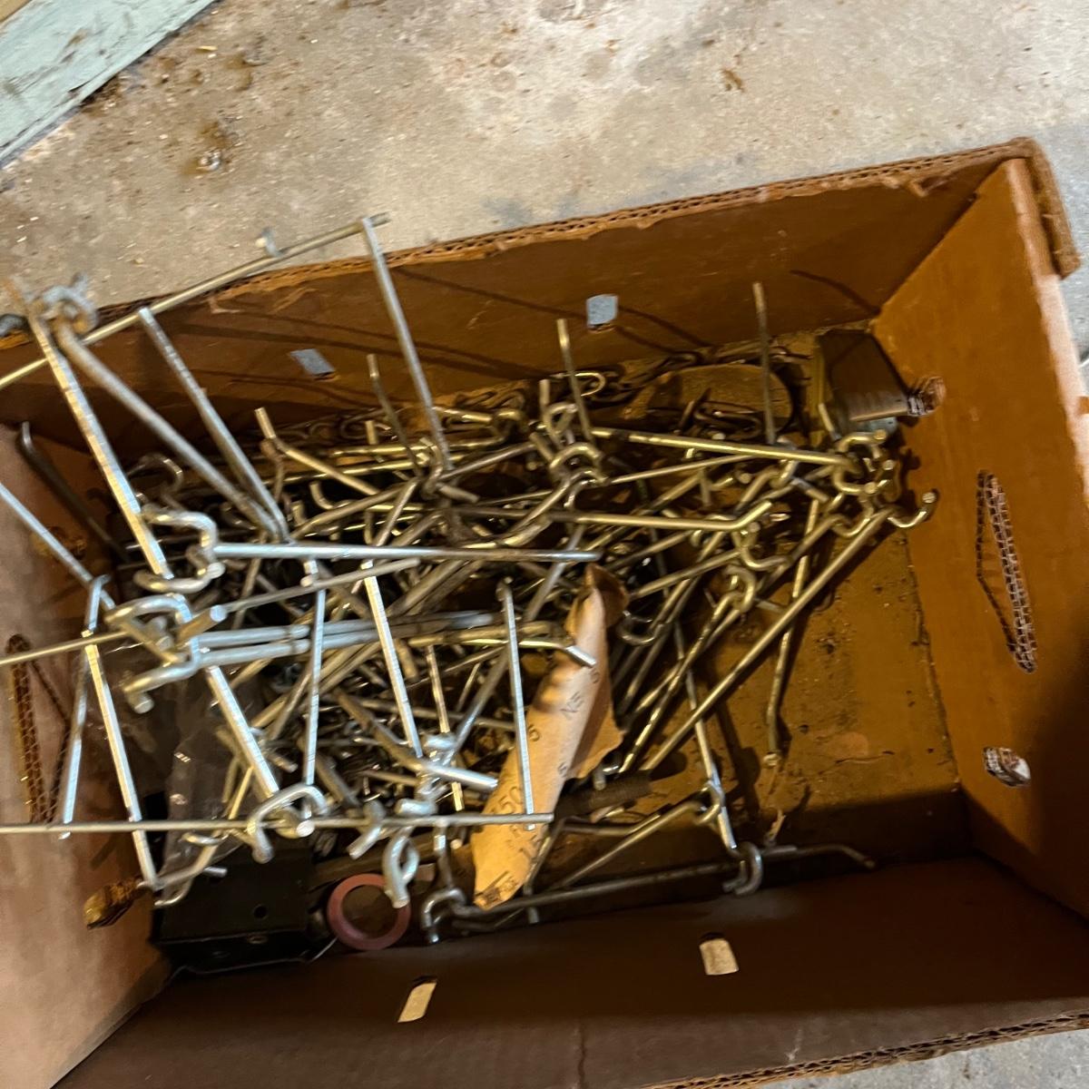 Lot contains a large selection of hardware and more including scrapers , paint brushes, roller tray, peg board accessories, bin container with contents, door locks, scissors and much more. The peg board itself is not included however the pegboard holders are included.