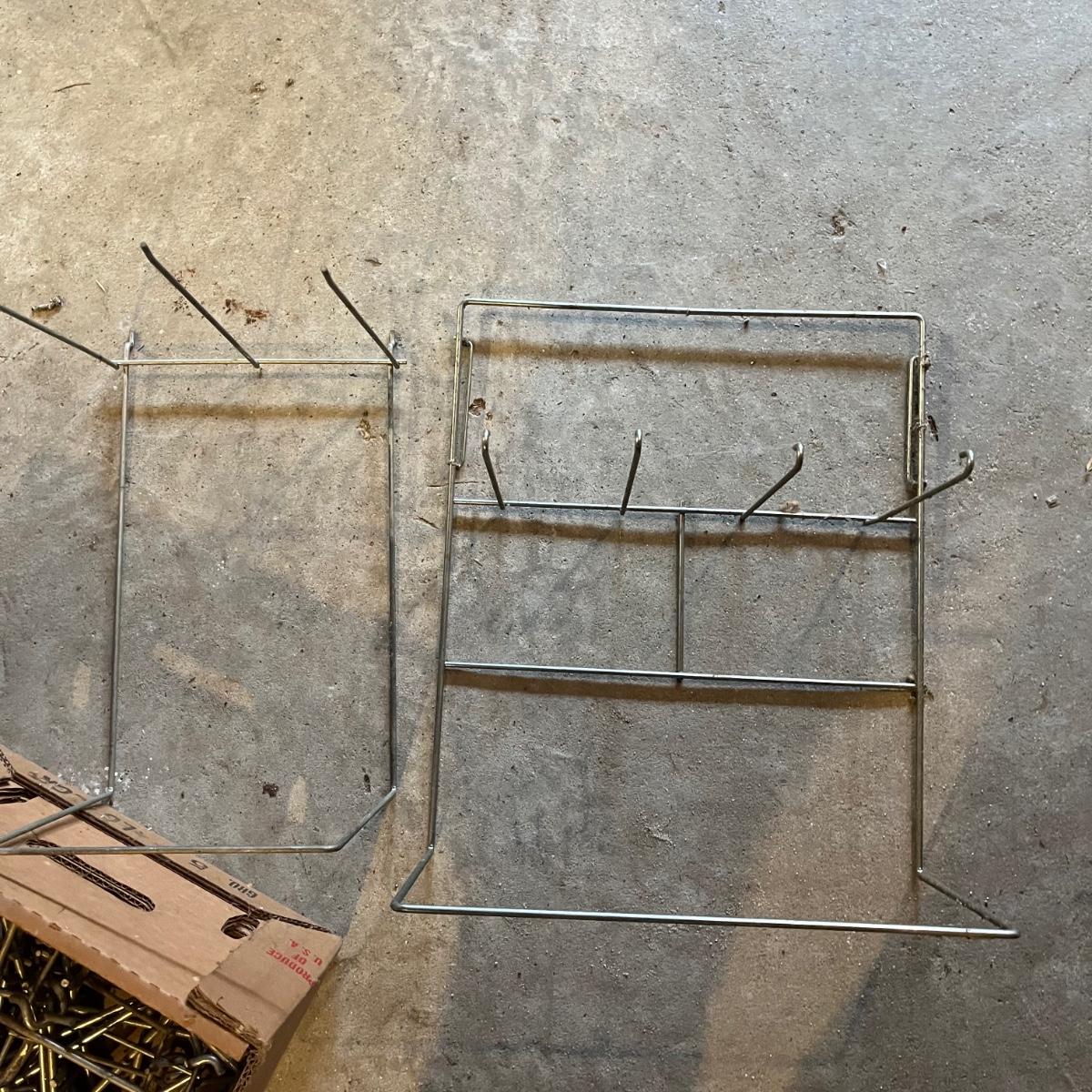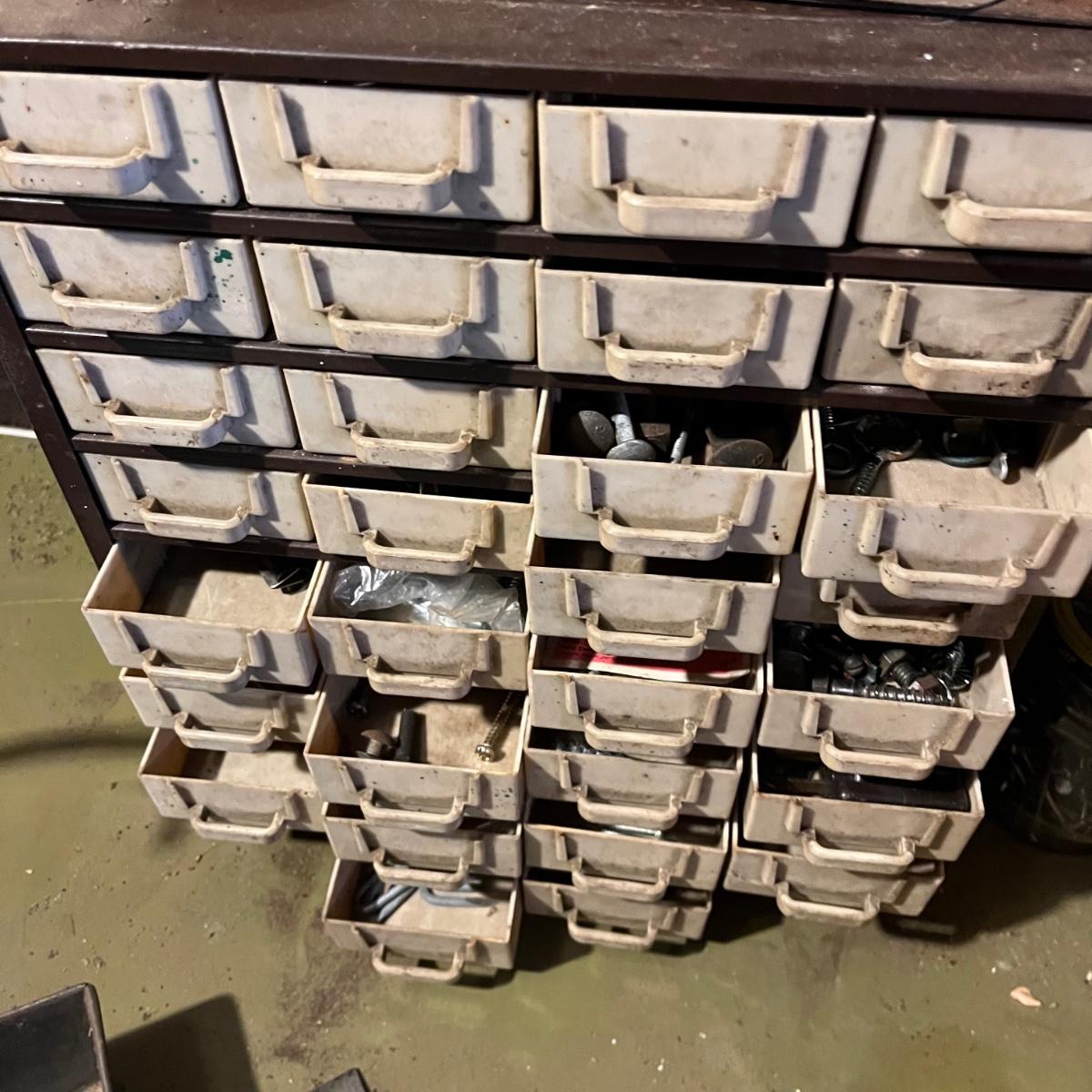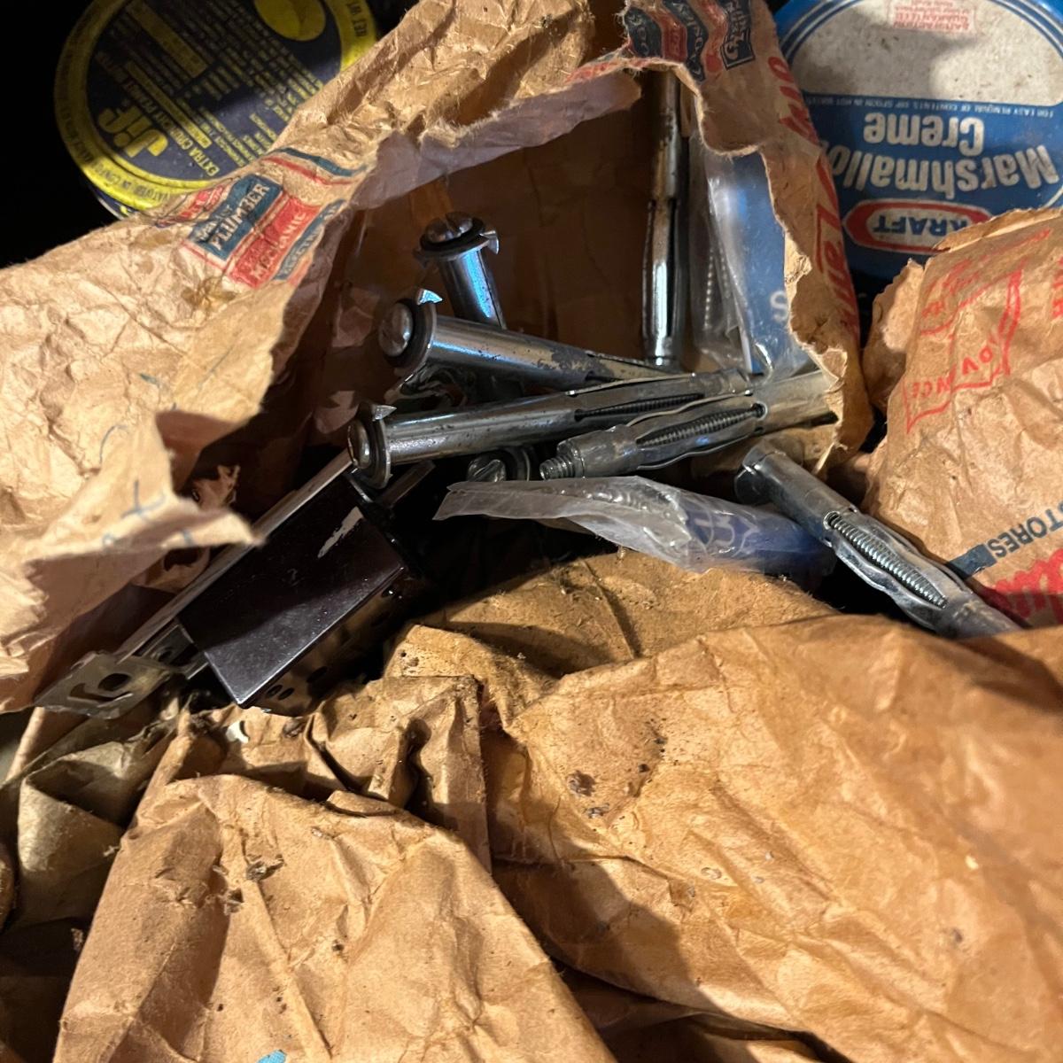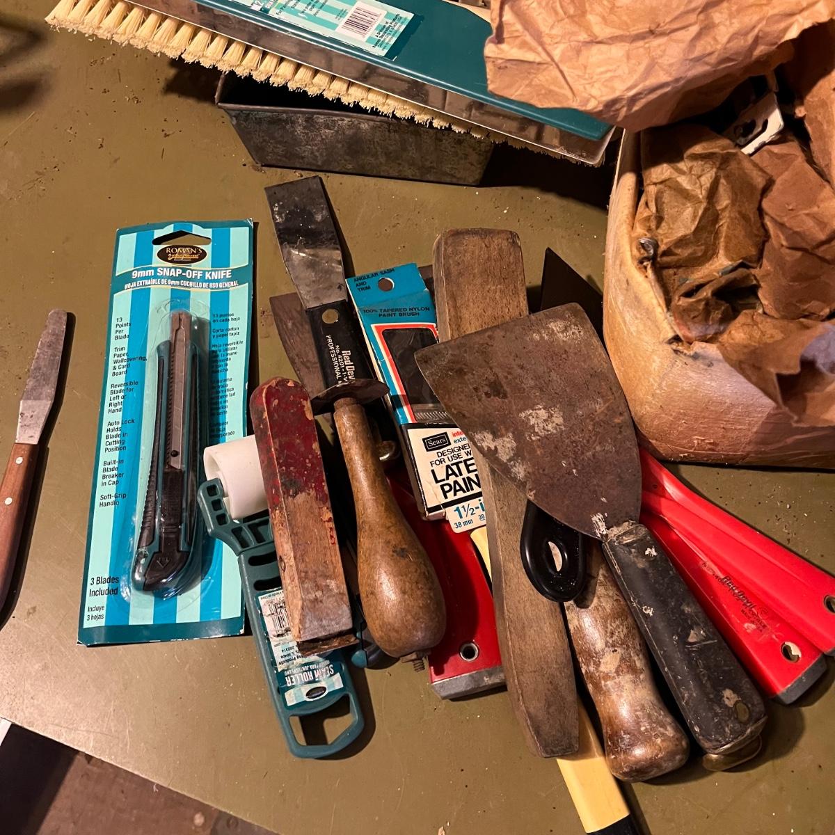 Lot contains a large selection of hardware and more including scrapers , paint brushes, roller tray, peg board accessories, bin container with contents, door locks, scissors and much more. The peg board itself is not included however the pegboard holders are included.