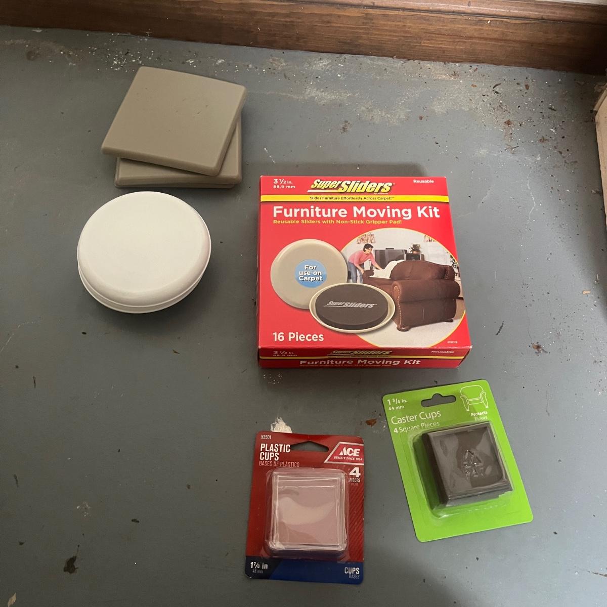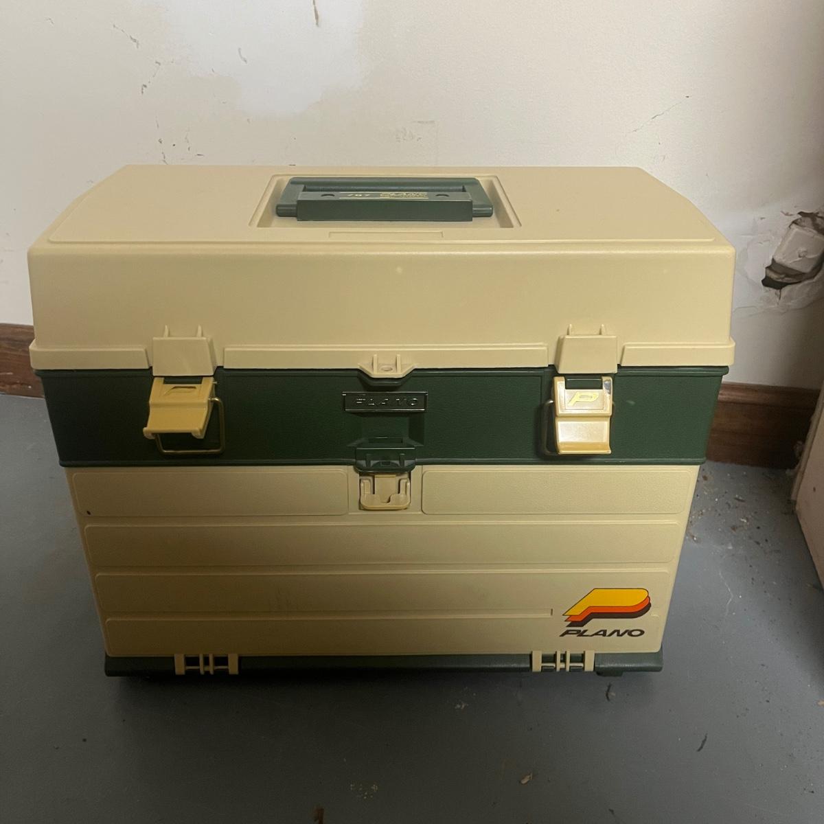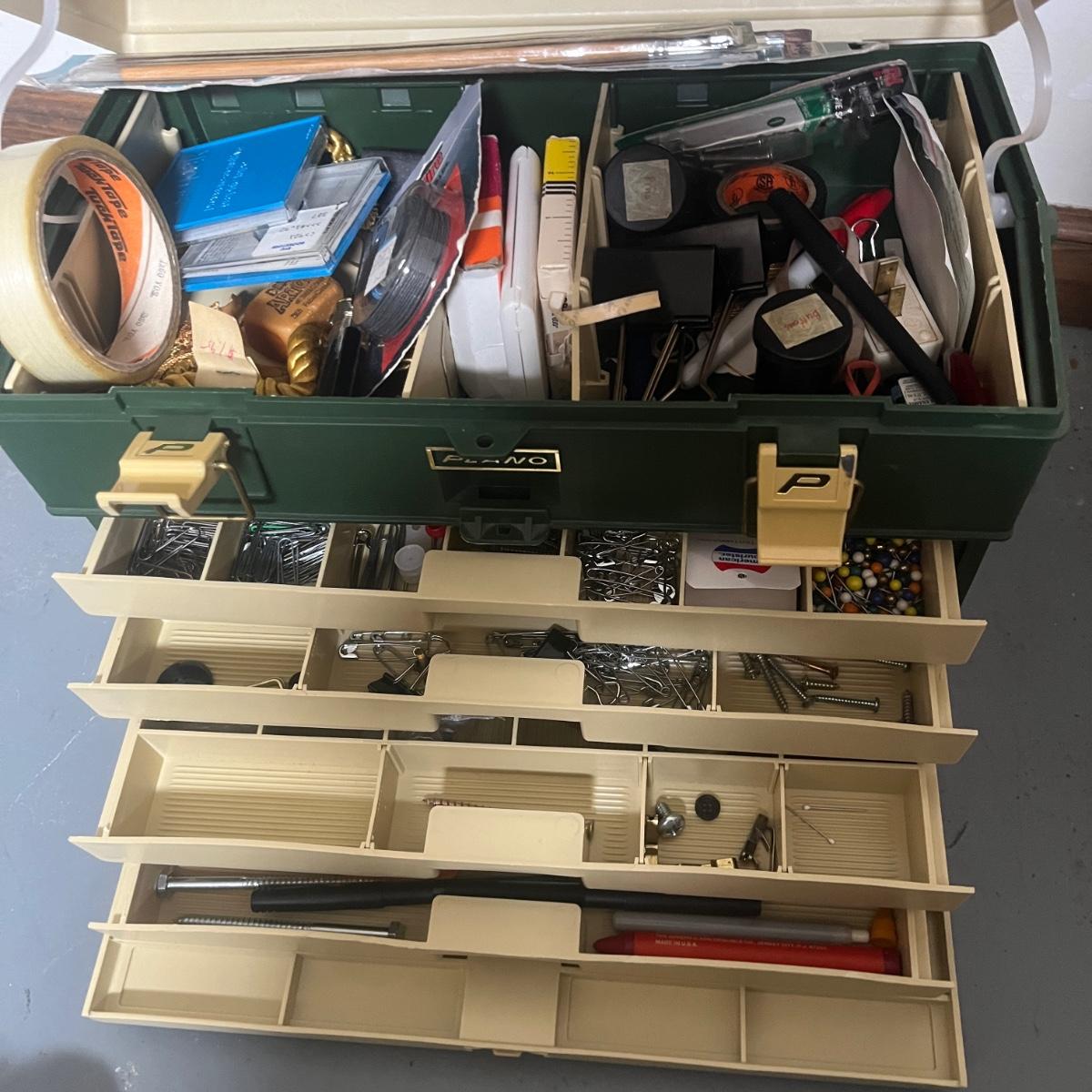 Lot includes a Plano tackle box filled with hardware and more, hard hat, furniture sliders. Bungee cords, flashlights, nuts and bolts and more. Plano box measures 8” x 15” x 12”H.