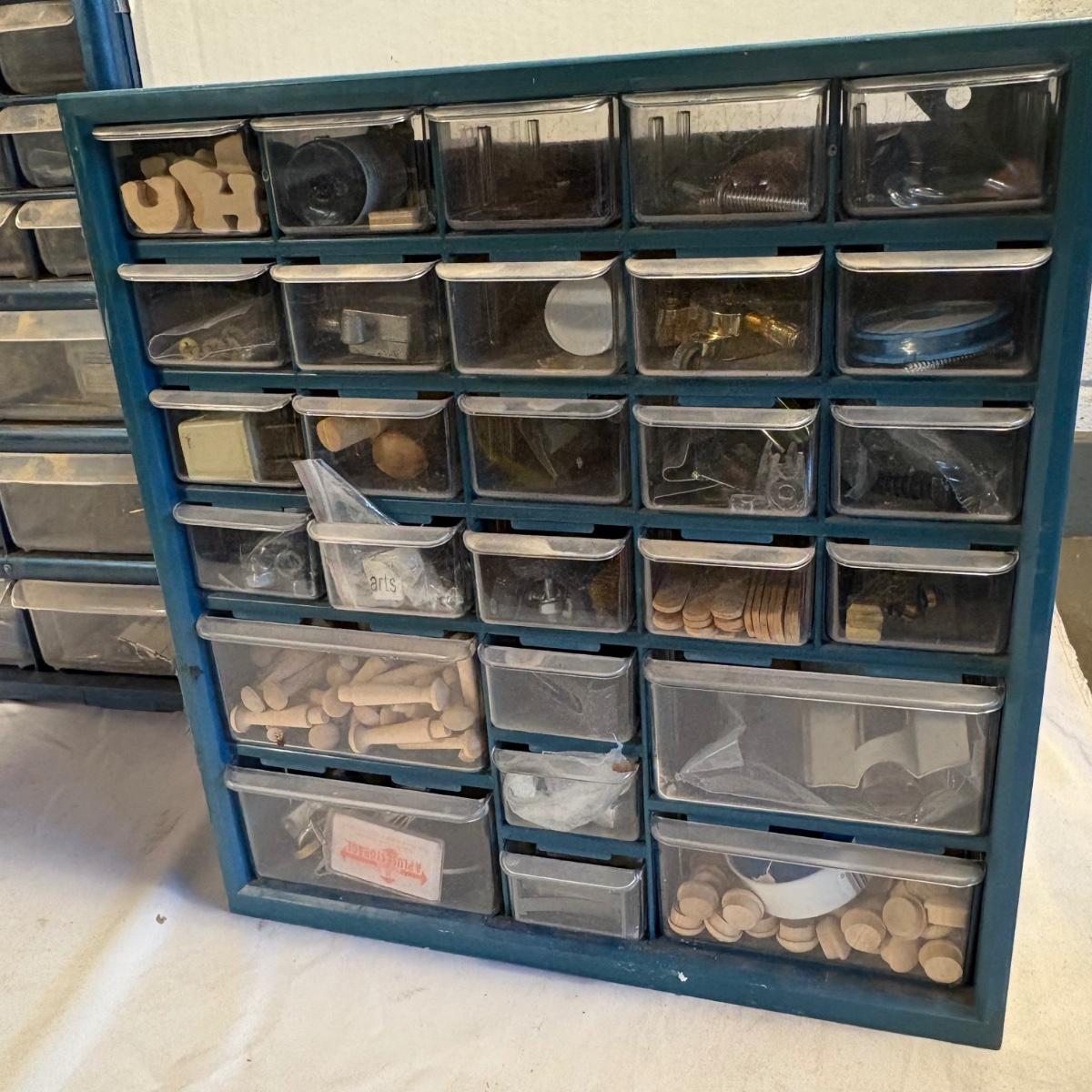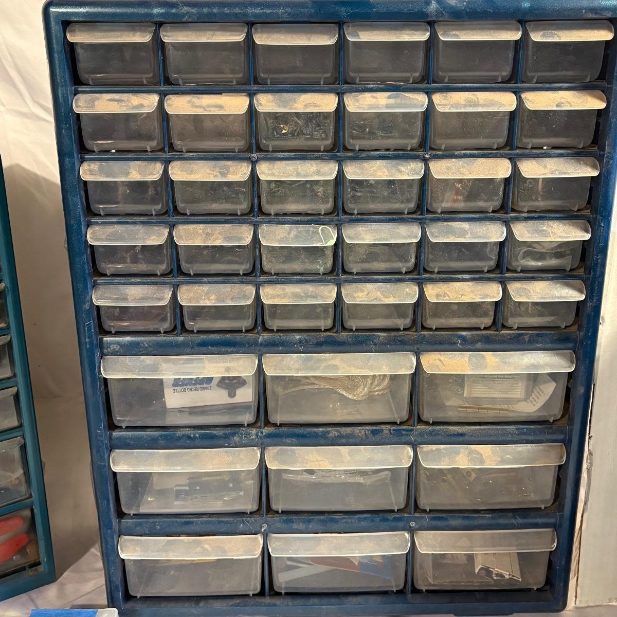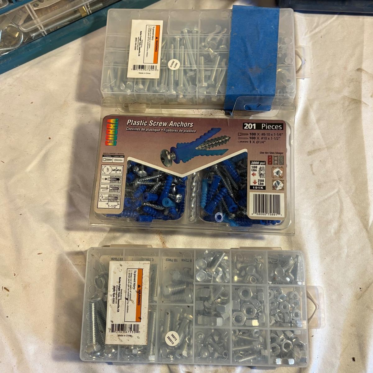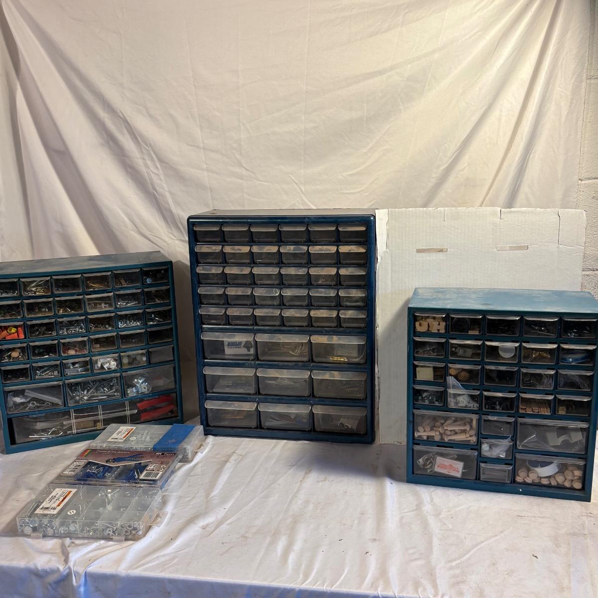 Three plastic hardware organizers plus three boxes of screws, nuts & bolts, and screw anchors. Organizers all have taped cardboard backs and measure 12” x 6.25” x 13”H (smallest), 14.25” x 7” x 14.5”H, and 14.75” x 6.5” x 18.5”H (largest). Most drawers full of misc. hardware items that includes anchors, screws, wood plugs, nails, tape and more. Plastic blue tub included.
