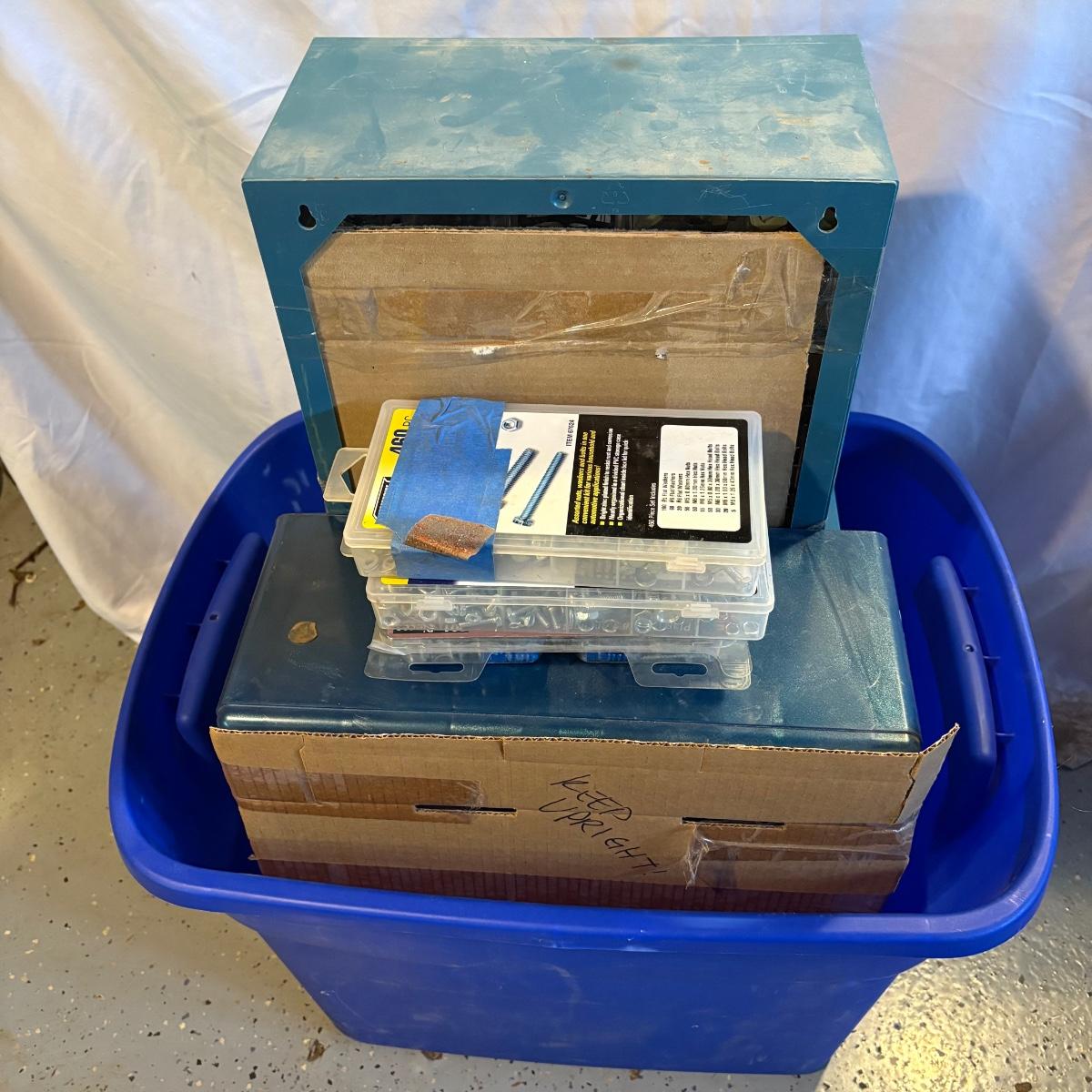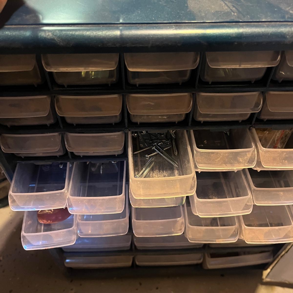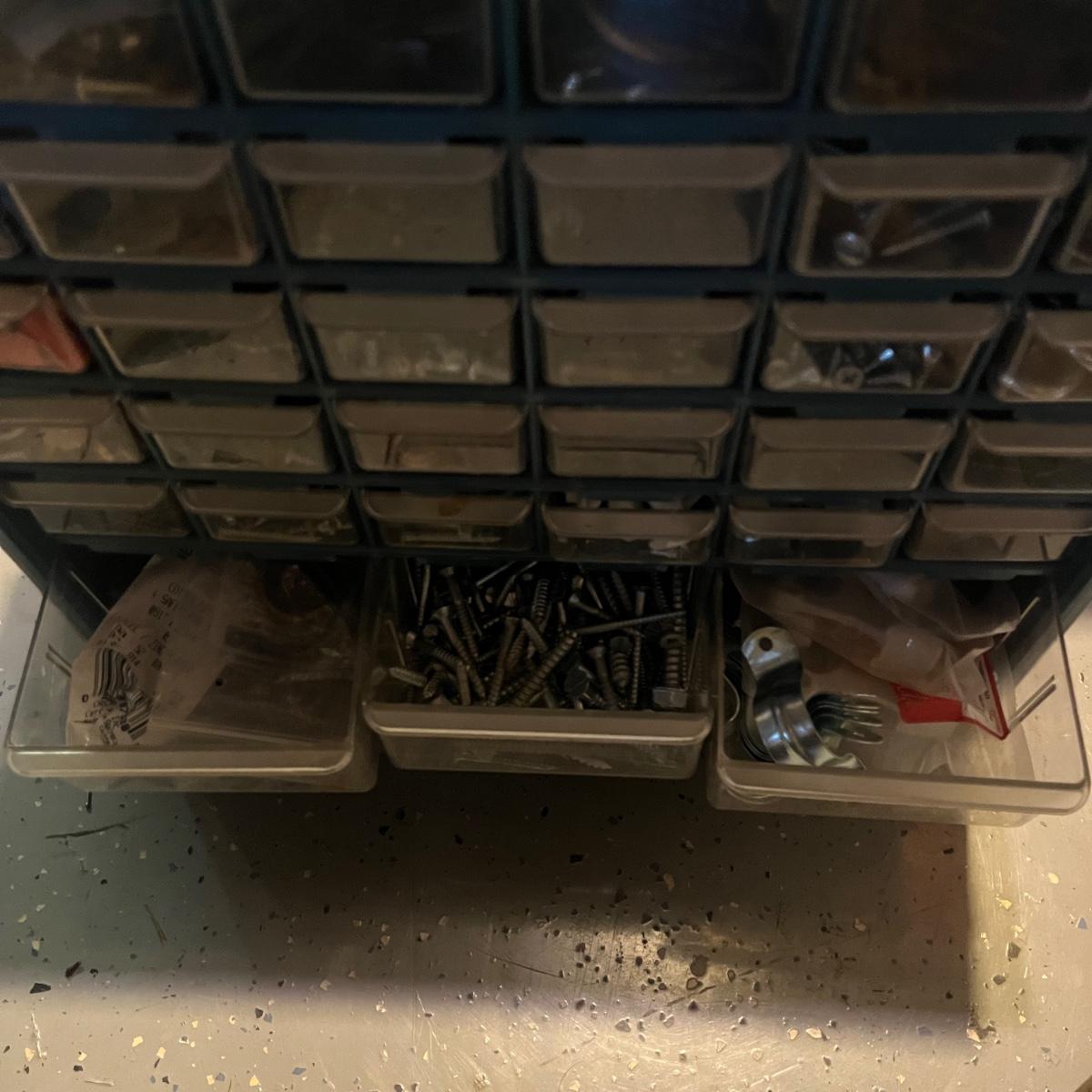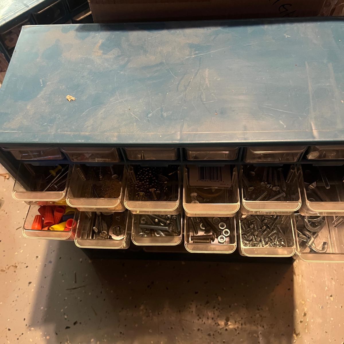 Three plastic hardware organizers plus three boxes of screws, nuts & bolts, and screw anchors. Organizers all have taped cardboard backs and measure 12” x 6.25” x 13”H (smallest), 14.25” x 7” x 14.5”H, and 14.75” x 6.5” x 18.5”H (largest). Most drawers full of misc. hardware items that includes anchors, screws, wood plugs, nails, tape and more. Plastic blue tub included.