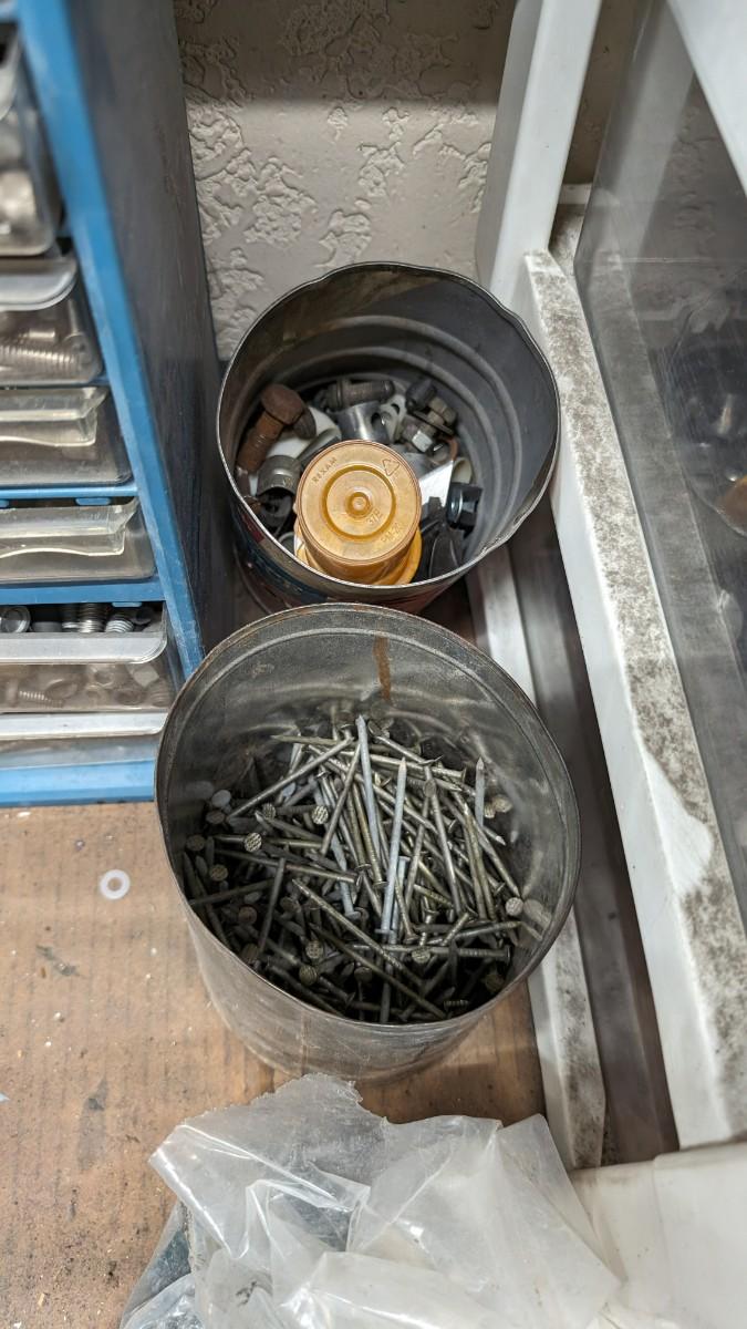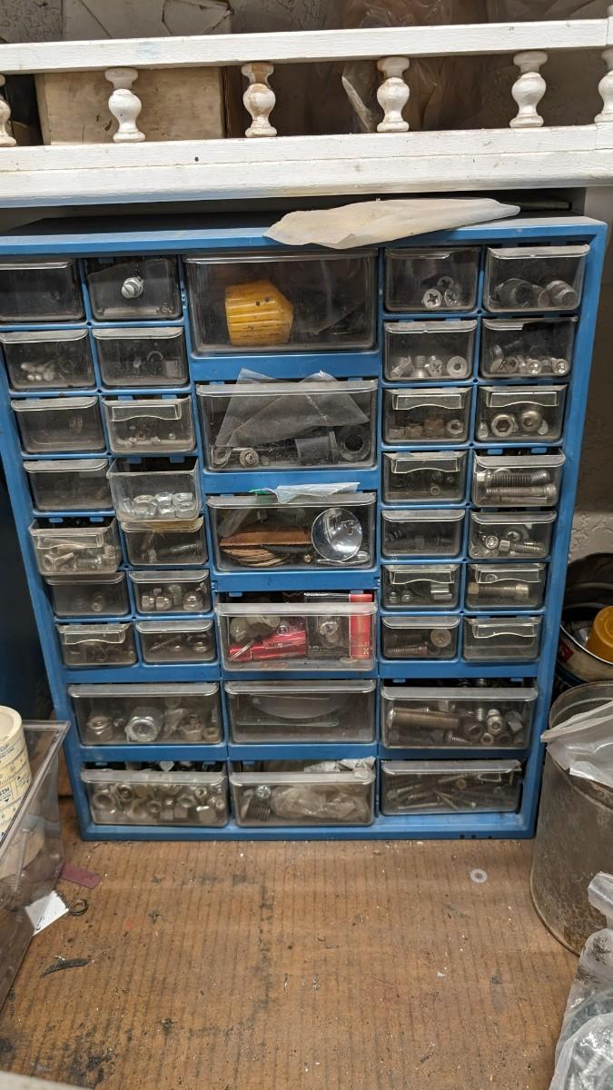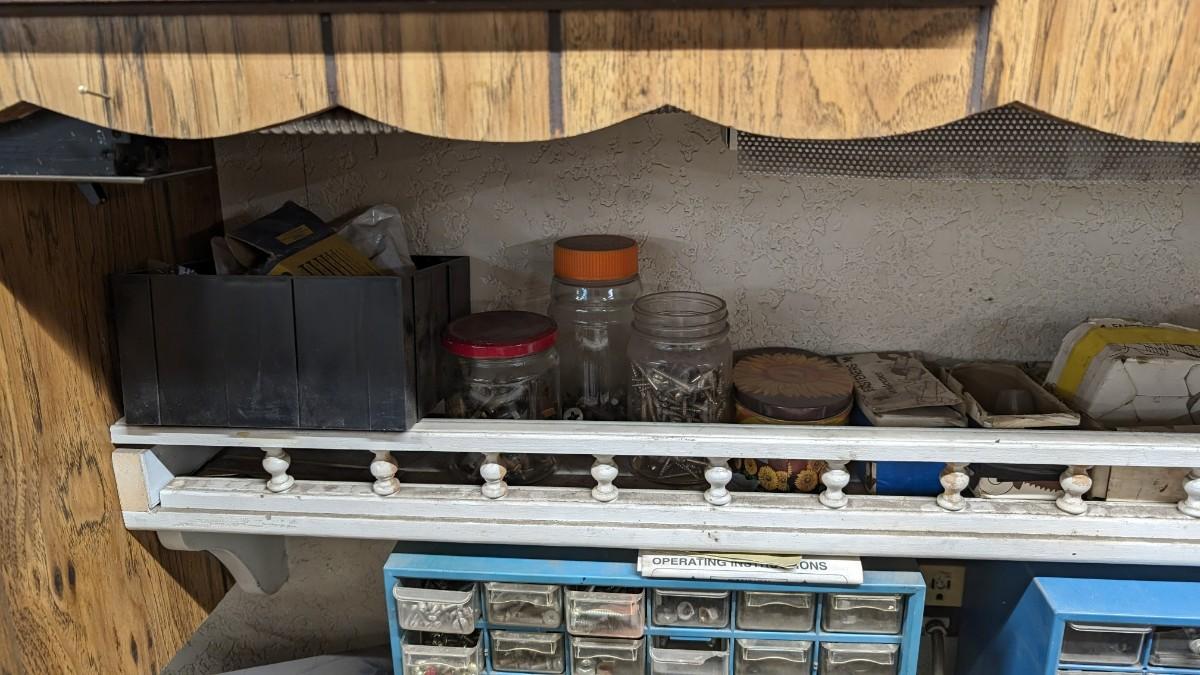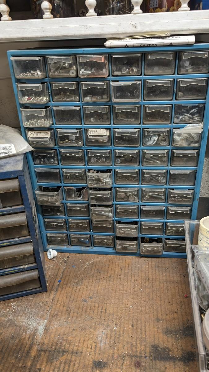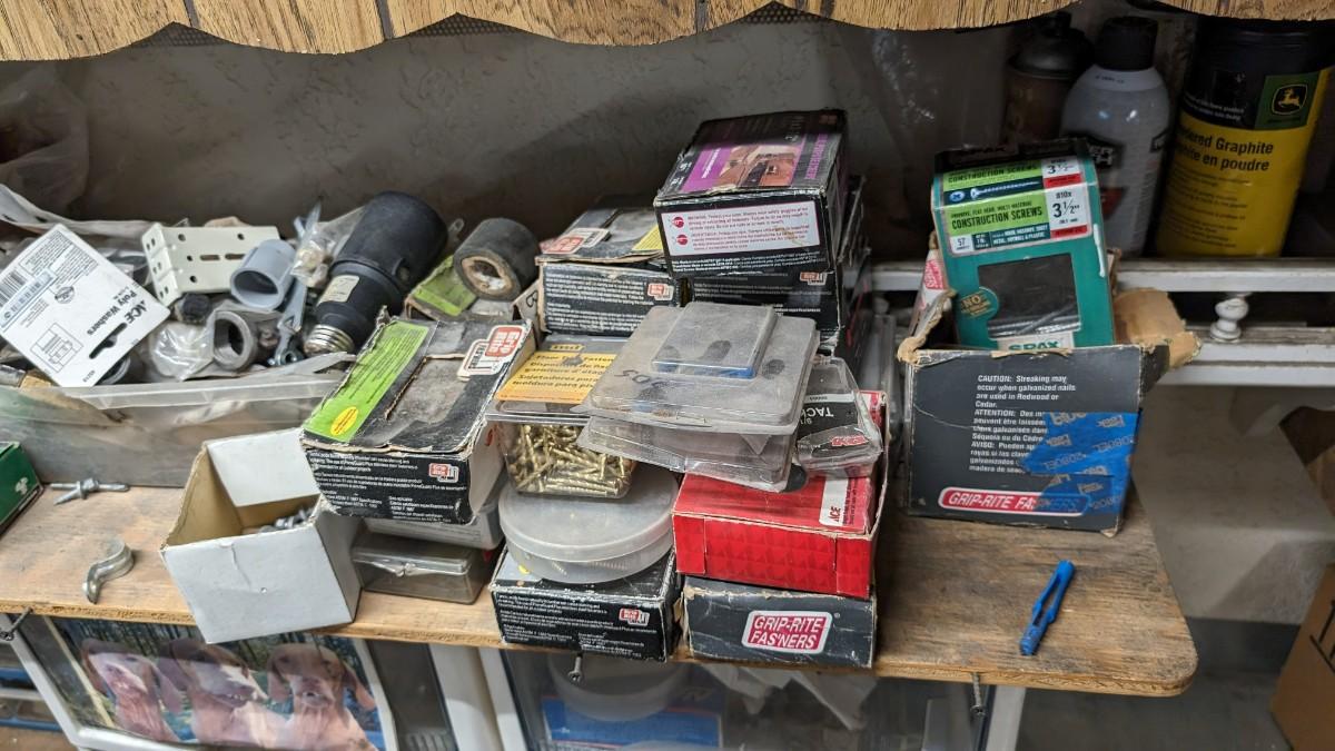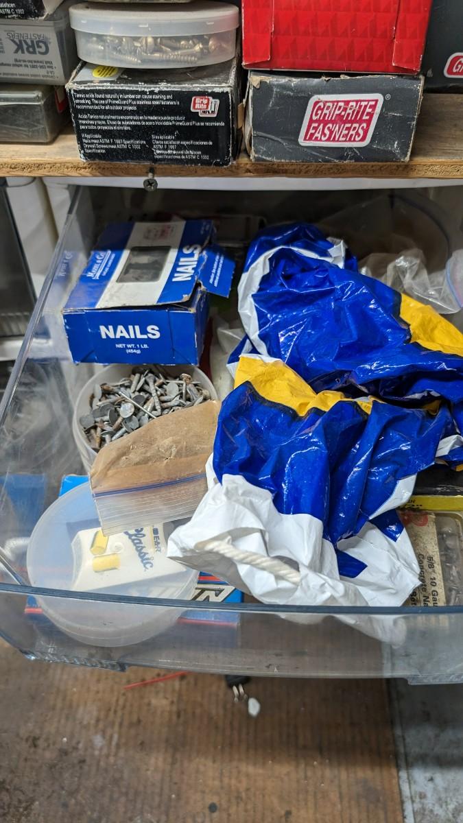 a MASSIVE amount of every darn screw, nail, nut, and bolt ever made (or so it seems). Includes organizers photographed including a neat NAPA one the 3 drawer white ones on the right. Includes hardware on the shelf behind everything as well. Winning bidder responsible for removal of all items photographed. No shipping
