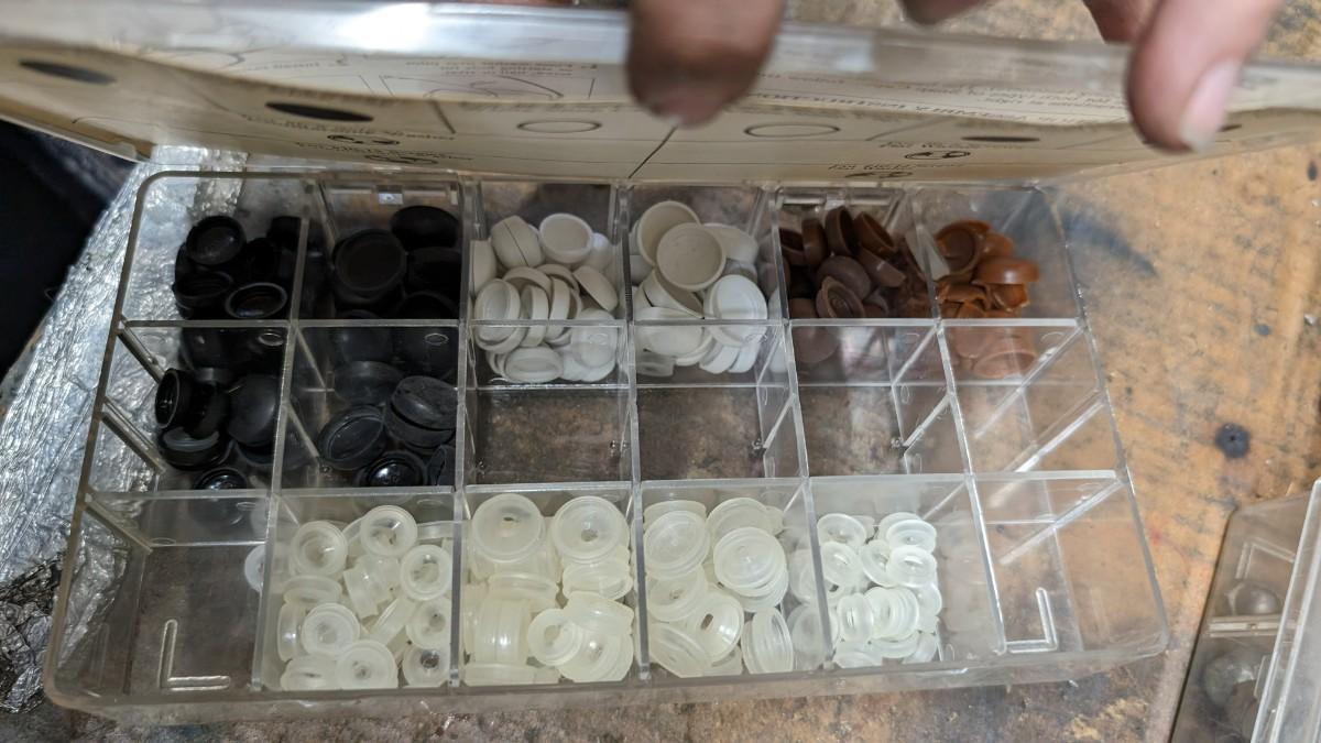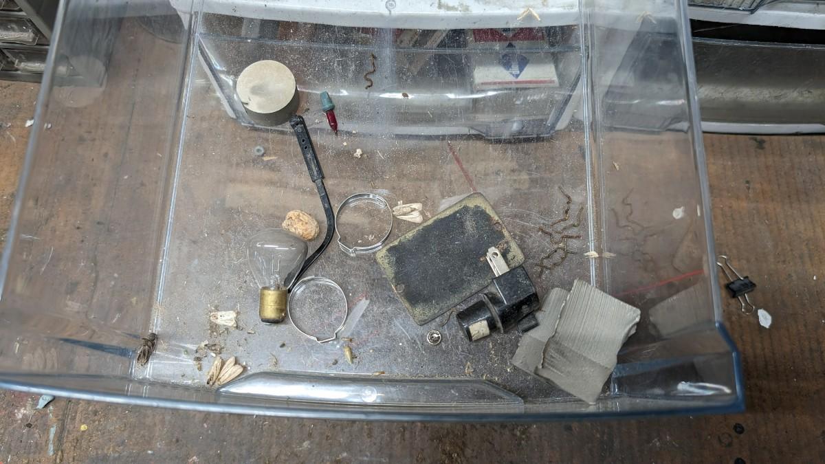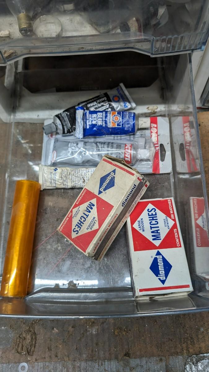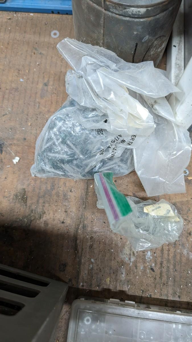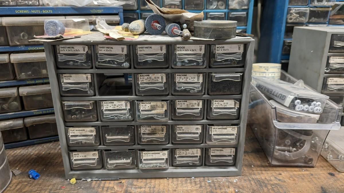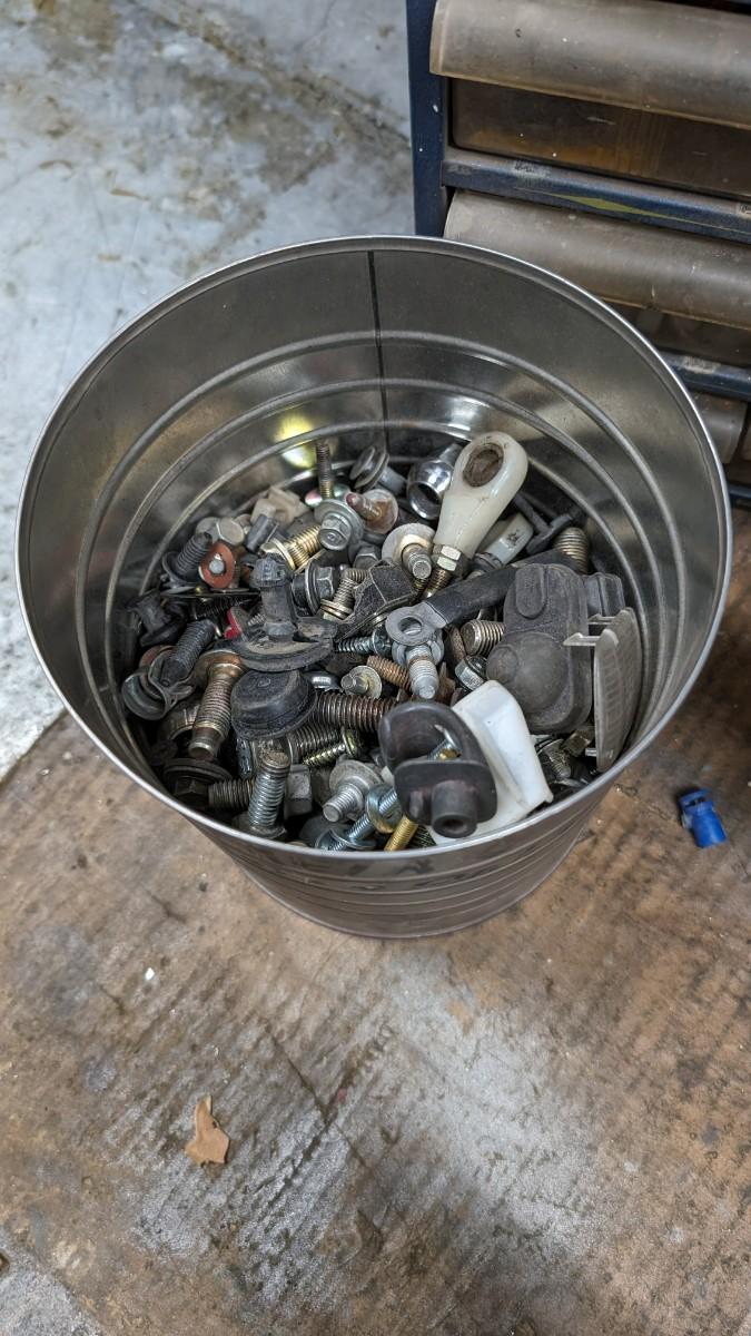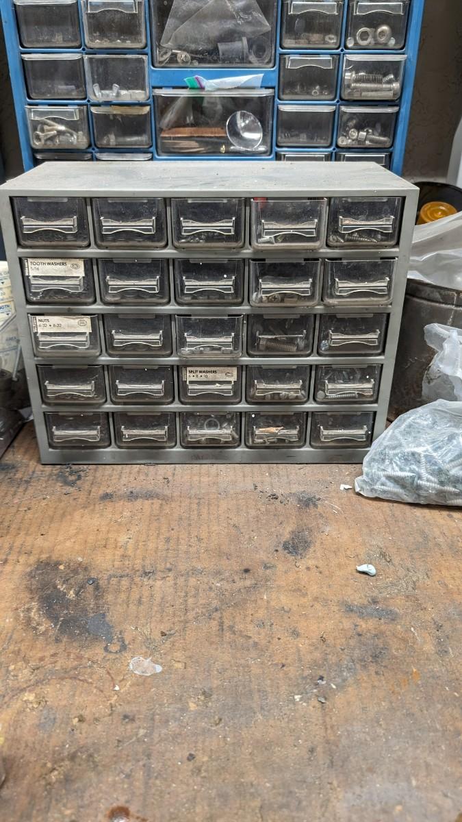 a MASSIVE amount of every darn screw, nail, nut, and bolt ever made (or so it seems). Includes organizers photographed including a neat NAPA one the 3 drawer white ones on the right. Includes hardware on the shelf behind everything as well. Winning bidder responsible for removal of all items photographed. No shipping
