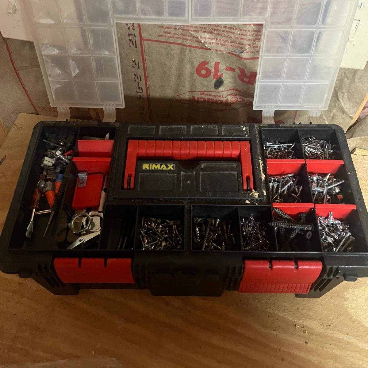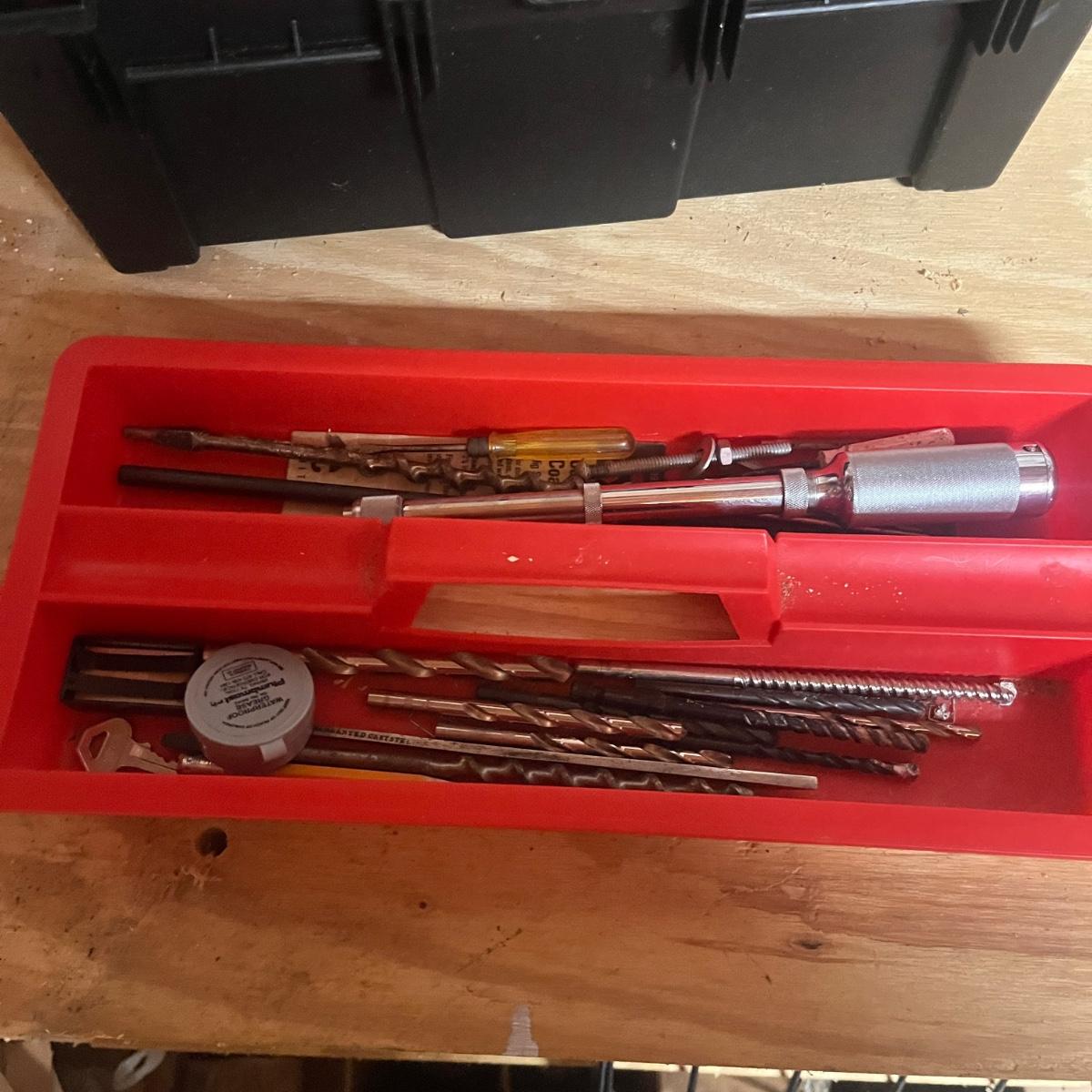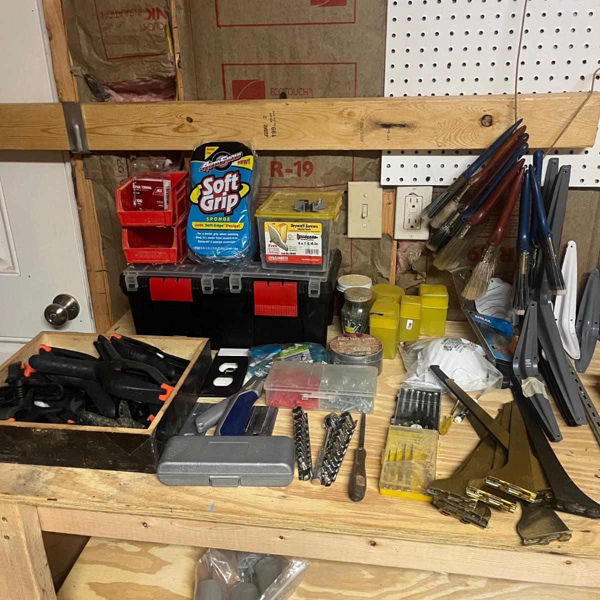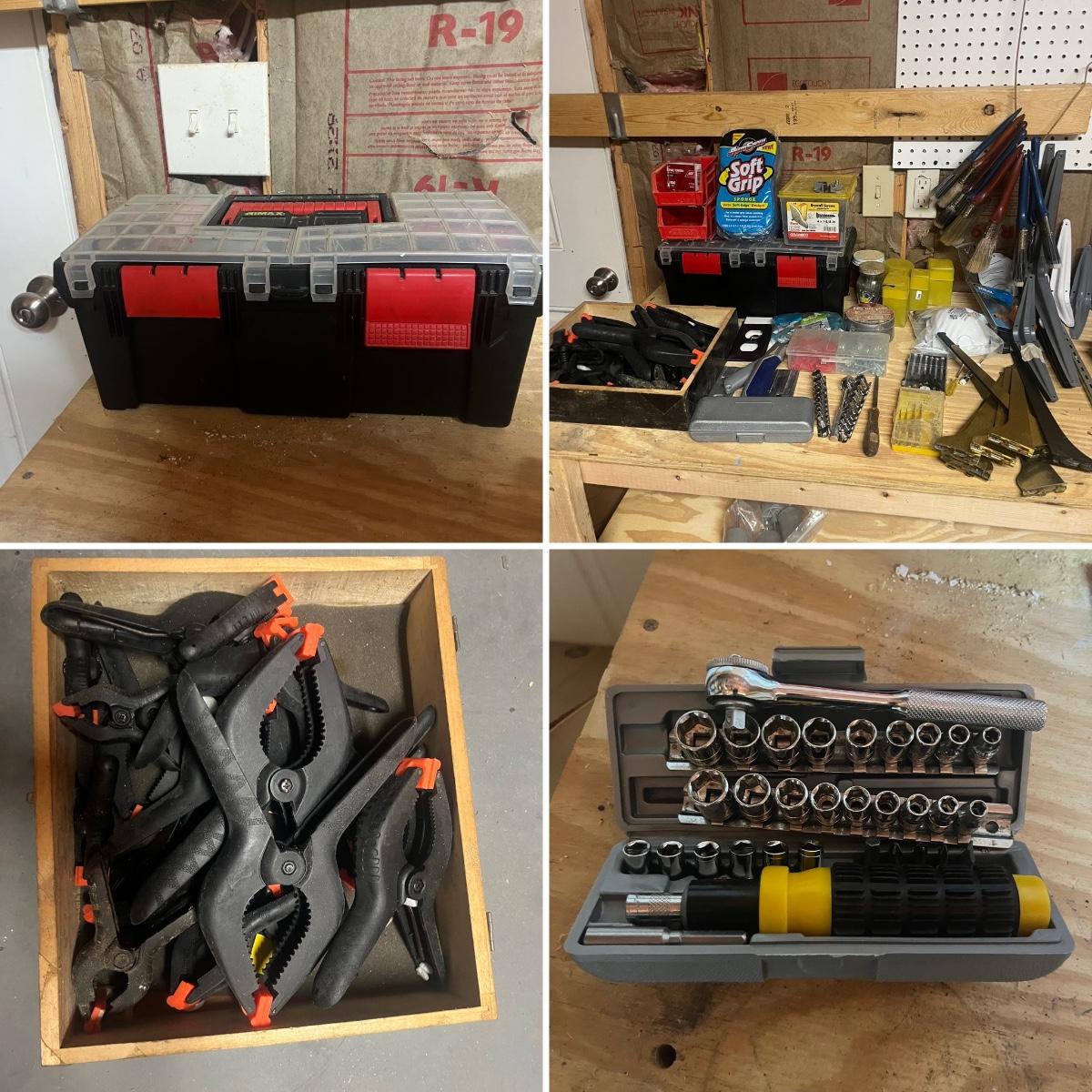 Lot contains Rimax plastic toolbox with contents that include hammers, drill bits, and more. Also includes Forstner bits, shelf brackets, screws, paint brushes, plastic clamps, 1/4” ratchet and sockets and more. Toolbox measures 16” x 8” x 7”H.