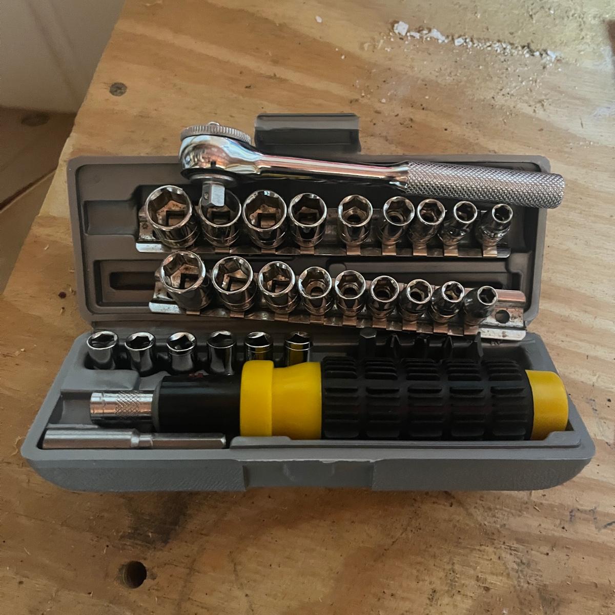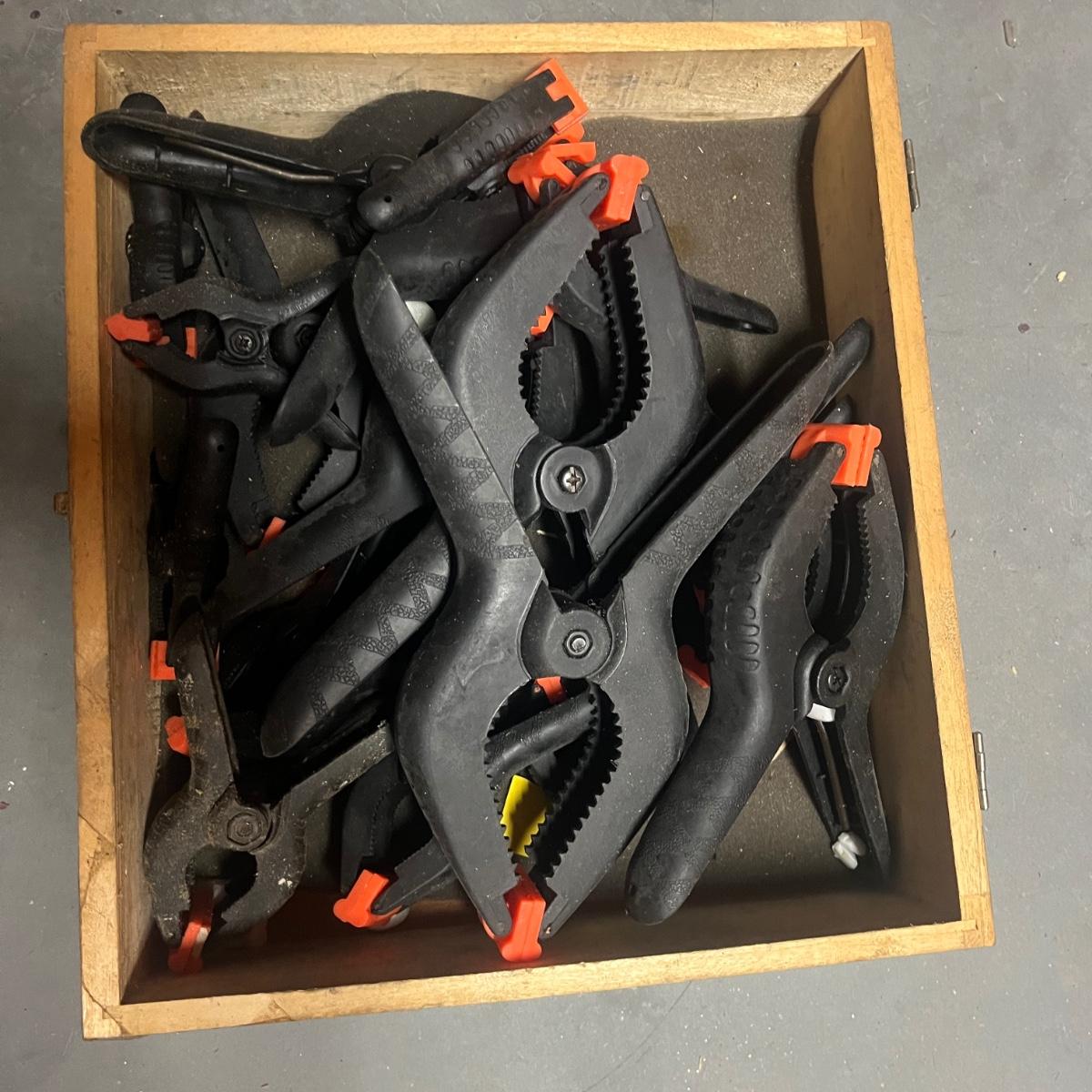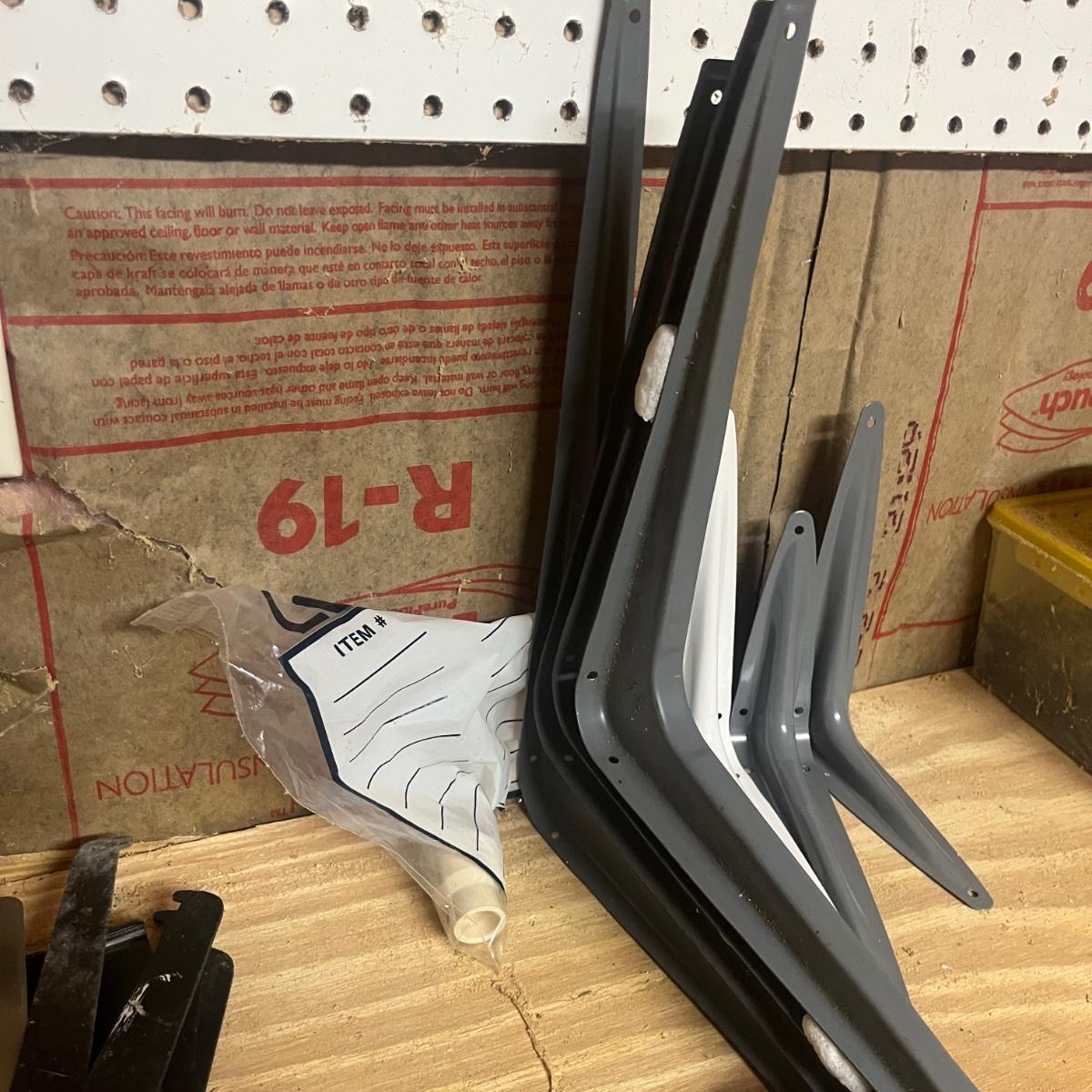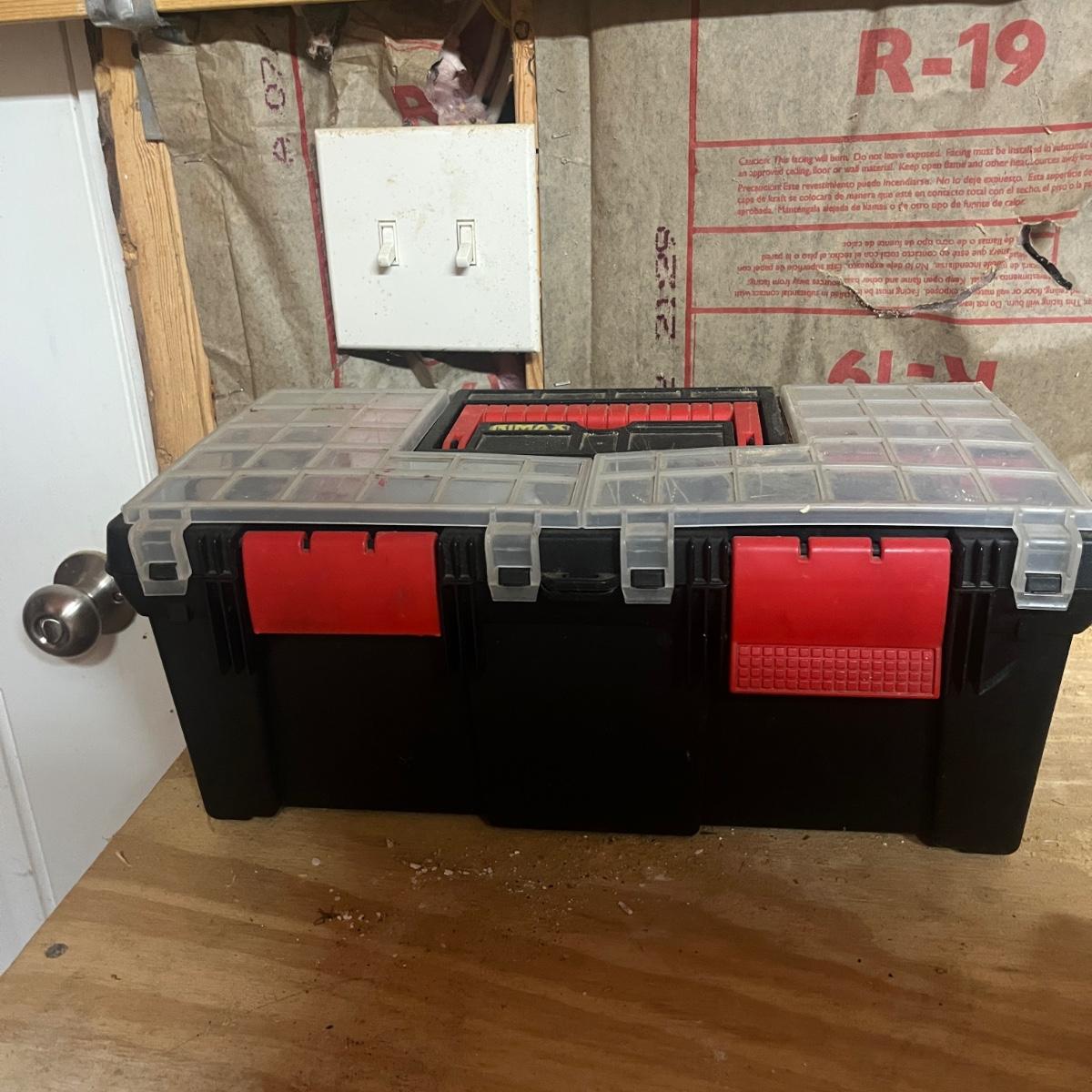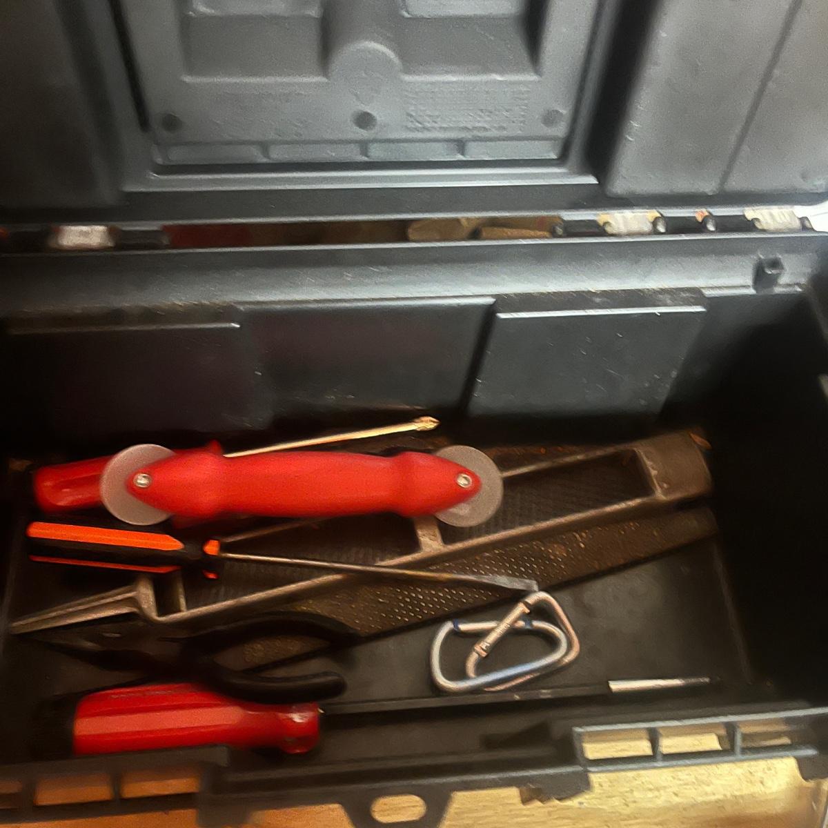 Lot contains Rimax plastic toolbox with contents that include hammers, drill bits, and more. Also includes Forstner bits, shelf brackets, screws, paint brushes, plastic clamps, 1/4” ratchet and sockets and more. Toolbox measures 16” x 8” x 7”H.