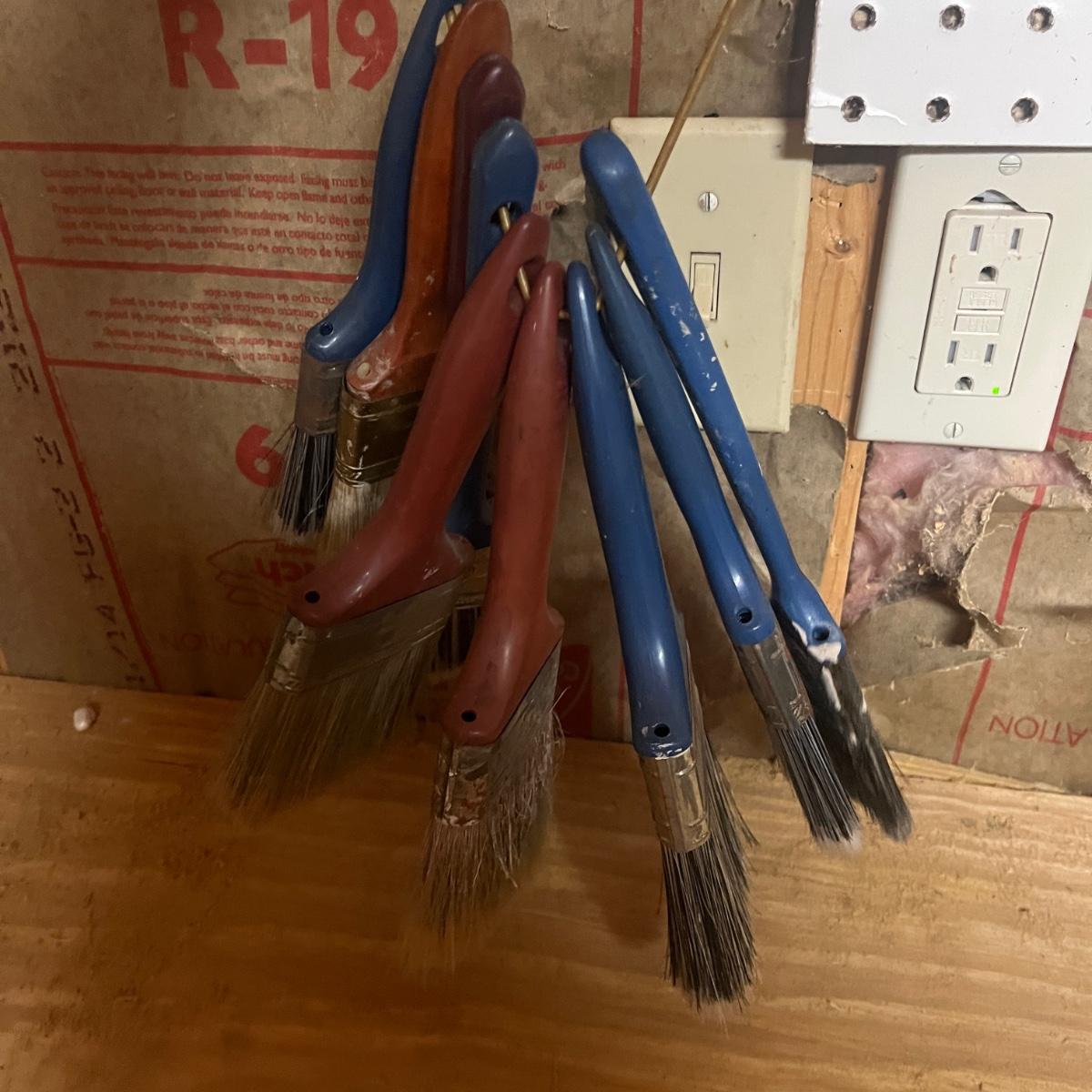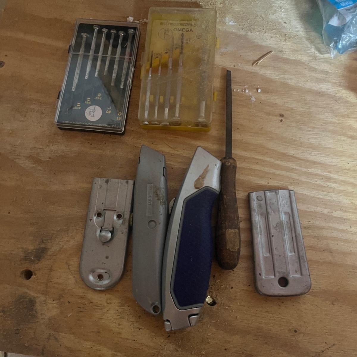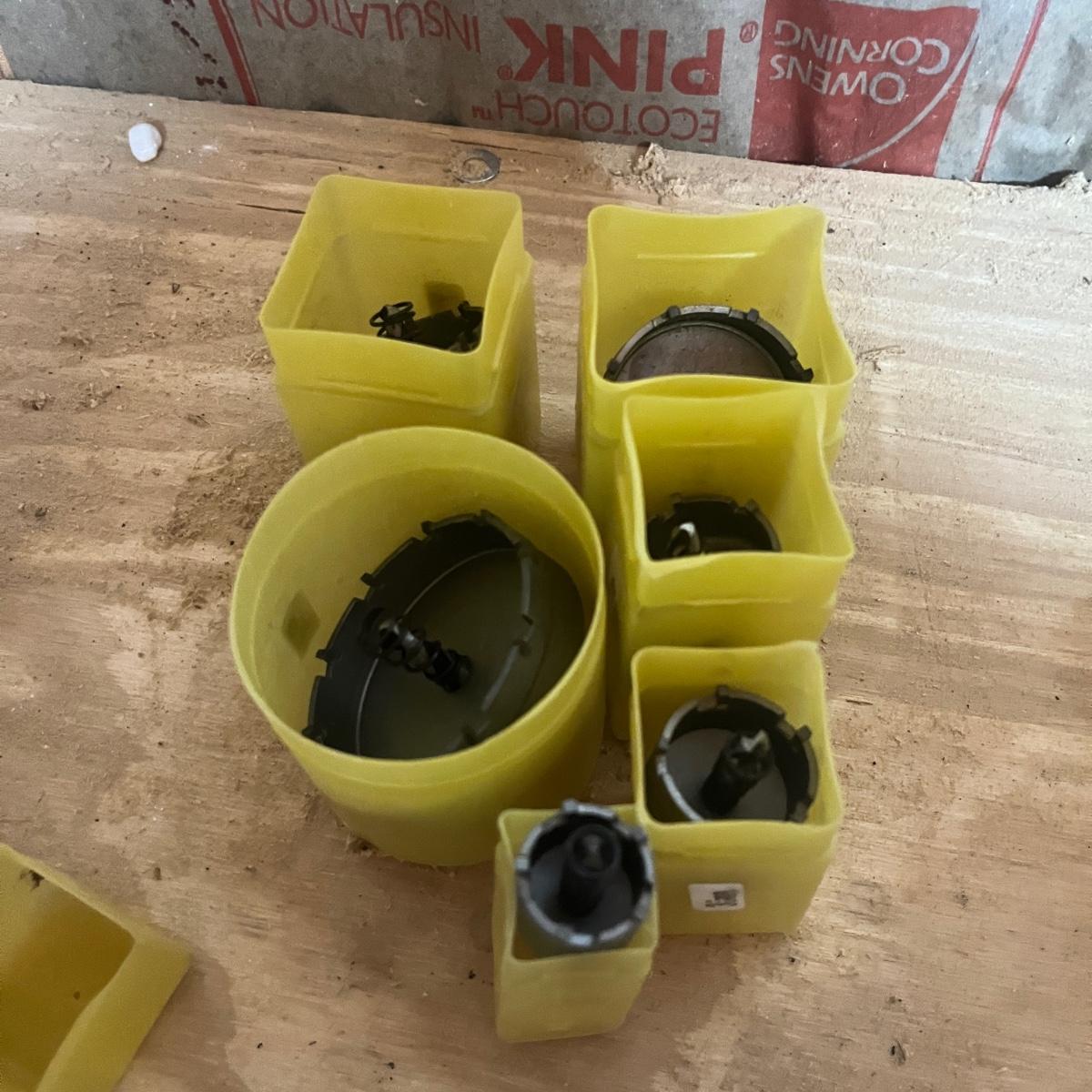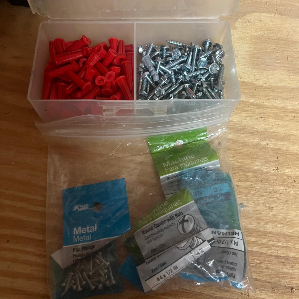 Lot contains Rimax plastic toolbox with contents that include hammers, drill bits, and more. Also includes Forstner bits, shelf brackets, screws, paint brushes, plastic clamps, 1/4” ratchet and sockets and more. Toolbox measures 16” x 8” x 7”H.