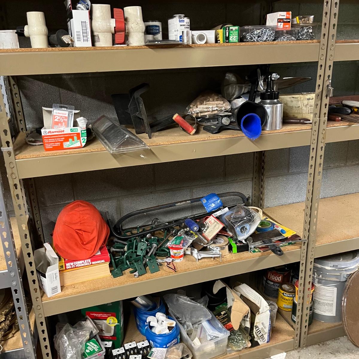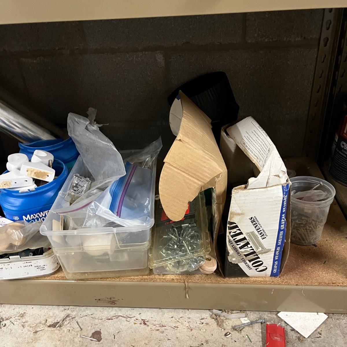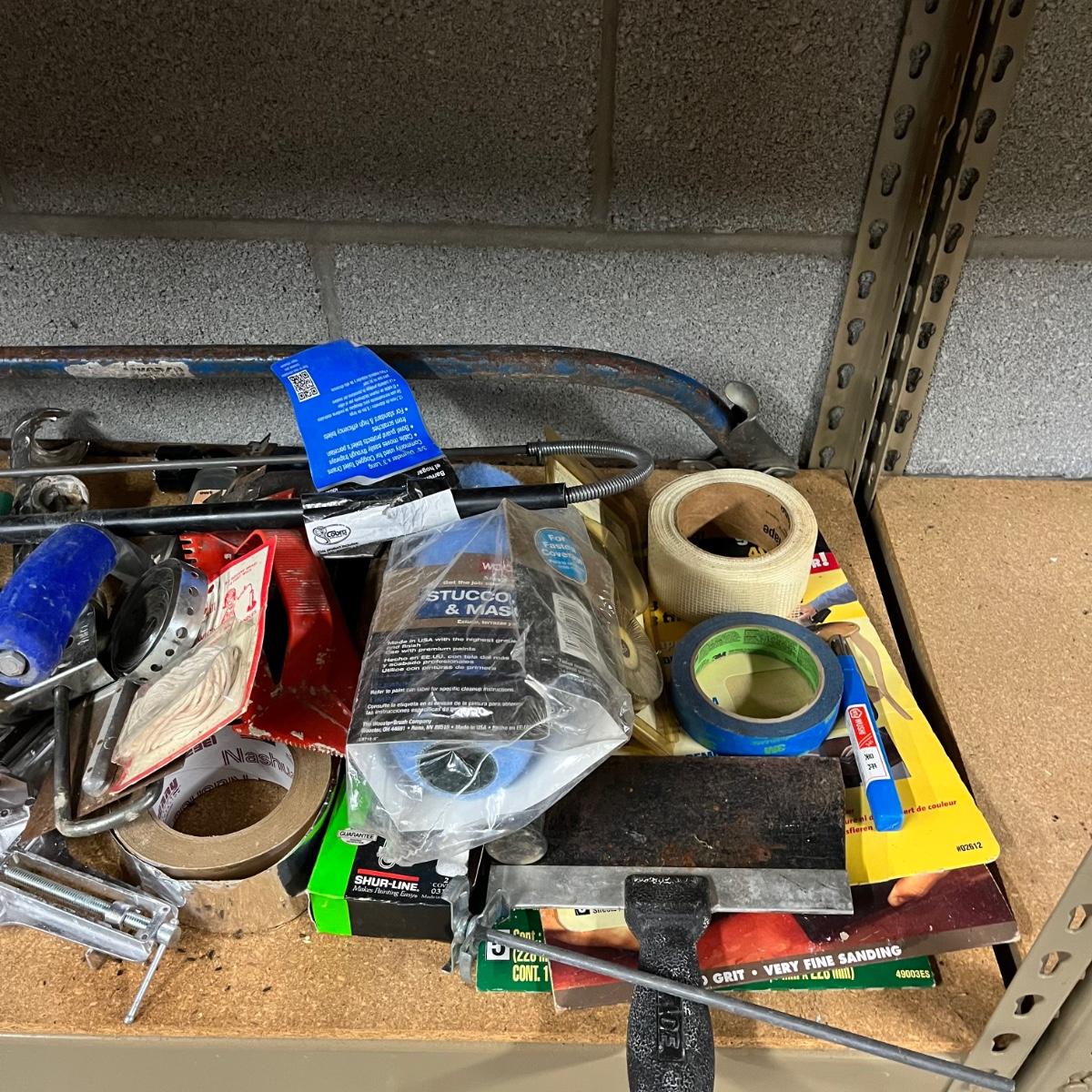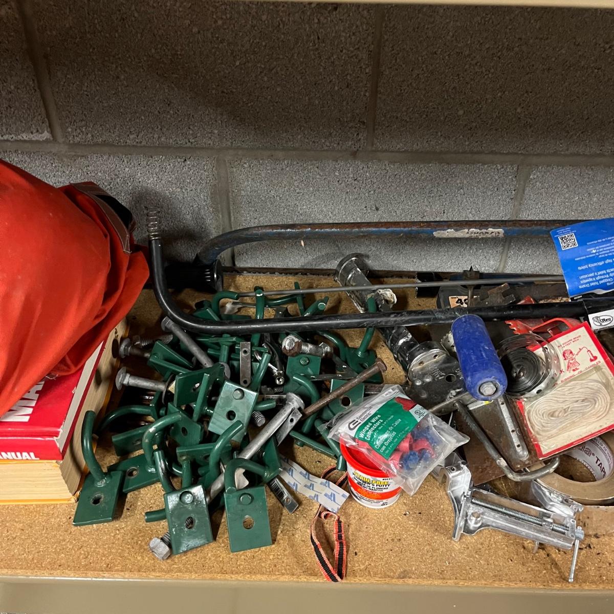 Lot contains a plethora of hardware including paint gun, chains, wall hooks, electric receptacles, roller, PVC valves, saw blades, peg hooks, sandpaper, trowel and more. Shelving unit not included but available in another lot in this auction.
