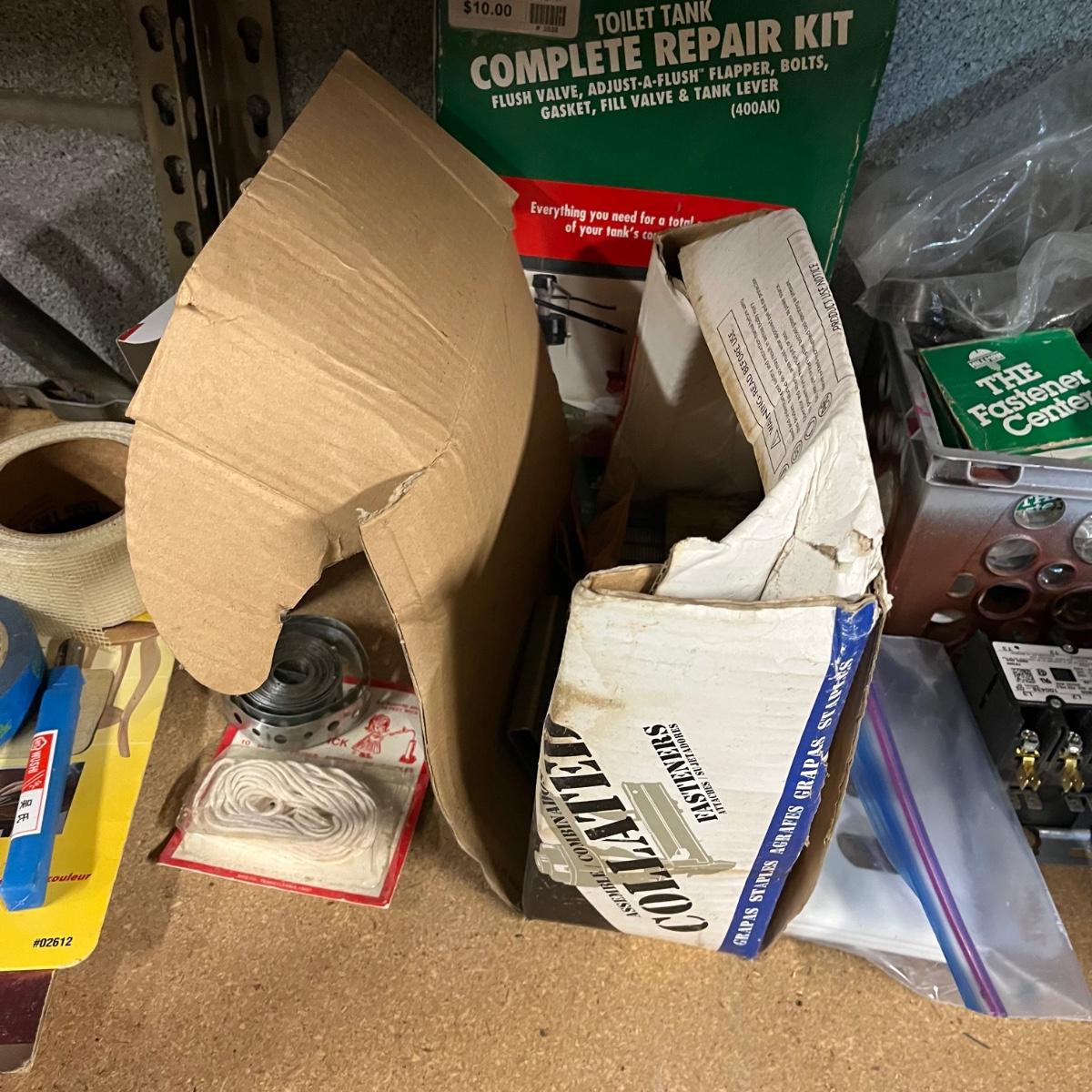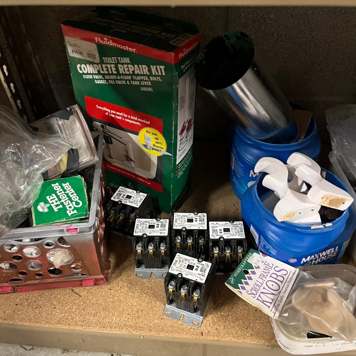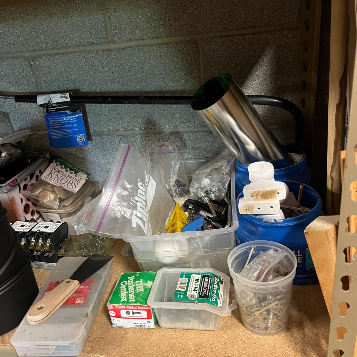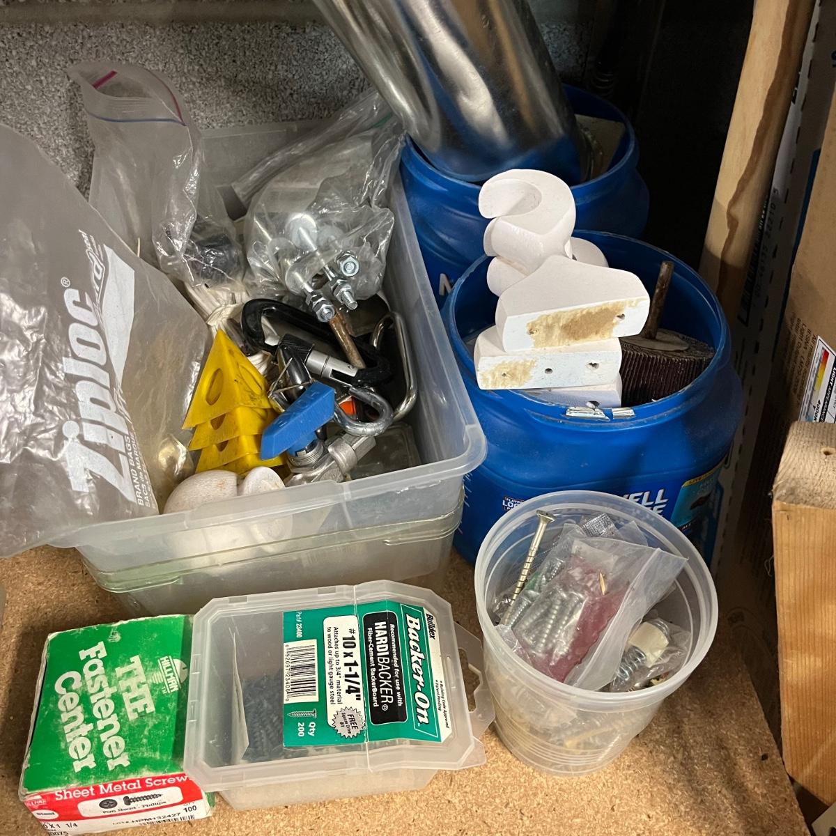 Lot contains a plethora of hardware including paint gun, chains, wall hooks, electric receptacles, roller, PVC valves, saw blades, peg hooks, sandpaper, trowel and more. Shelving unit not included but available in another lot in this auction.