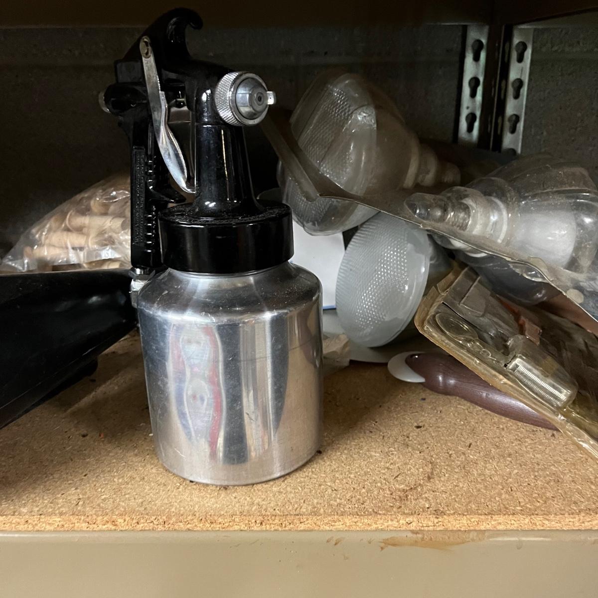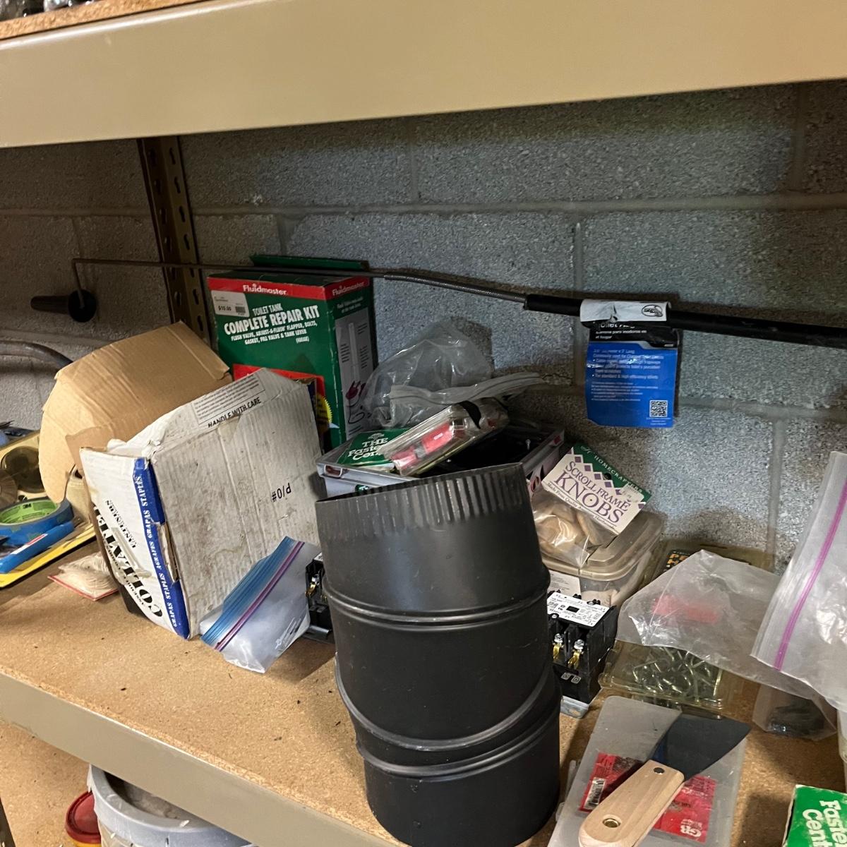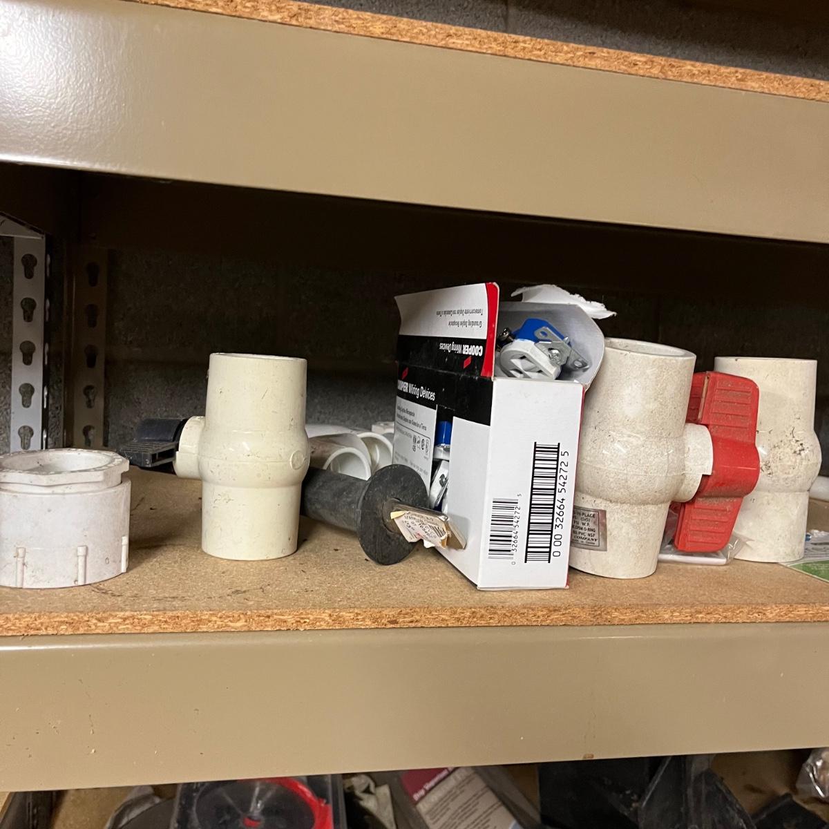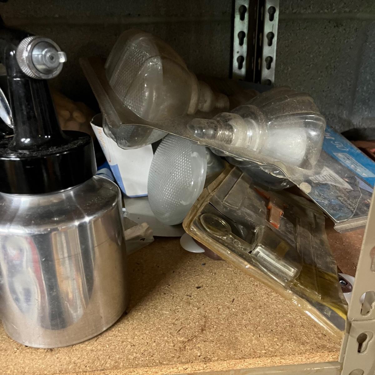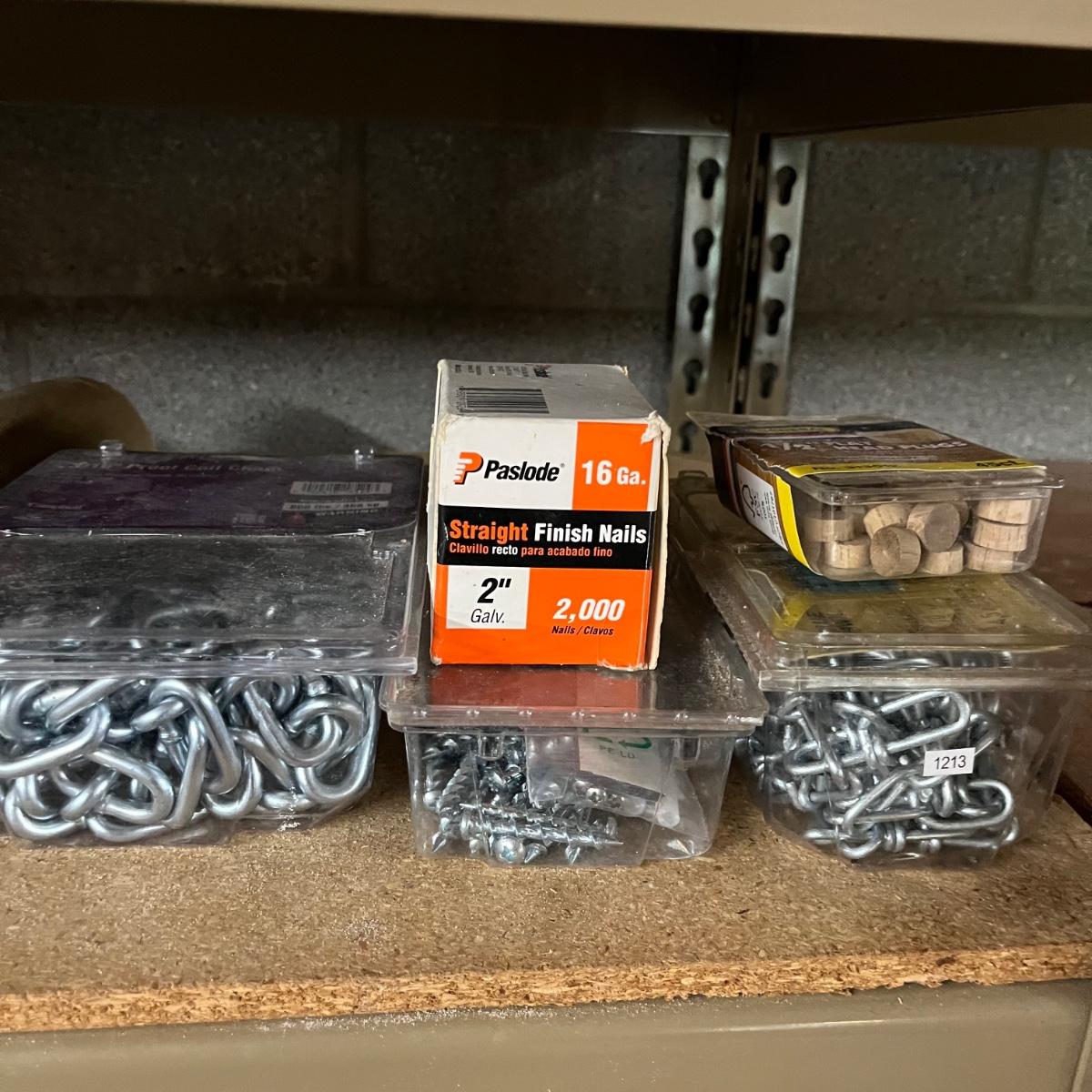 Lot contains a plethora of hardware including paint gun, chains, wall hooks, electric receptacles, roller, PVC valves, saw blades, peg hooks, sandpaper, trowel and more. Shelving unit not included but available in another lot in this auction.