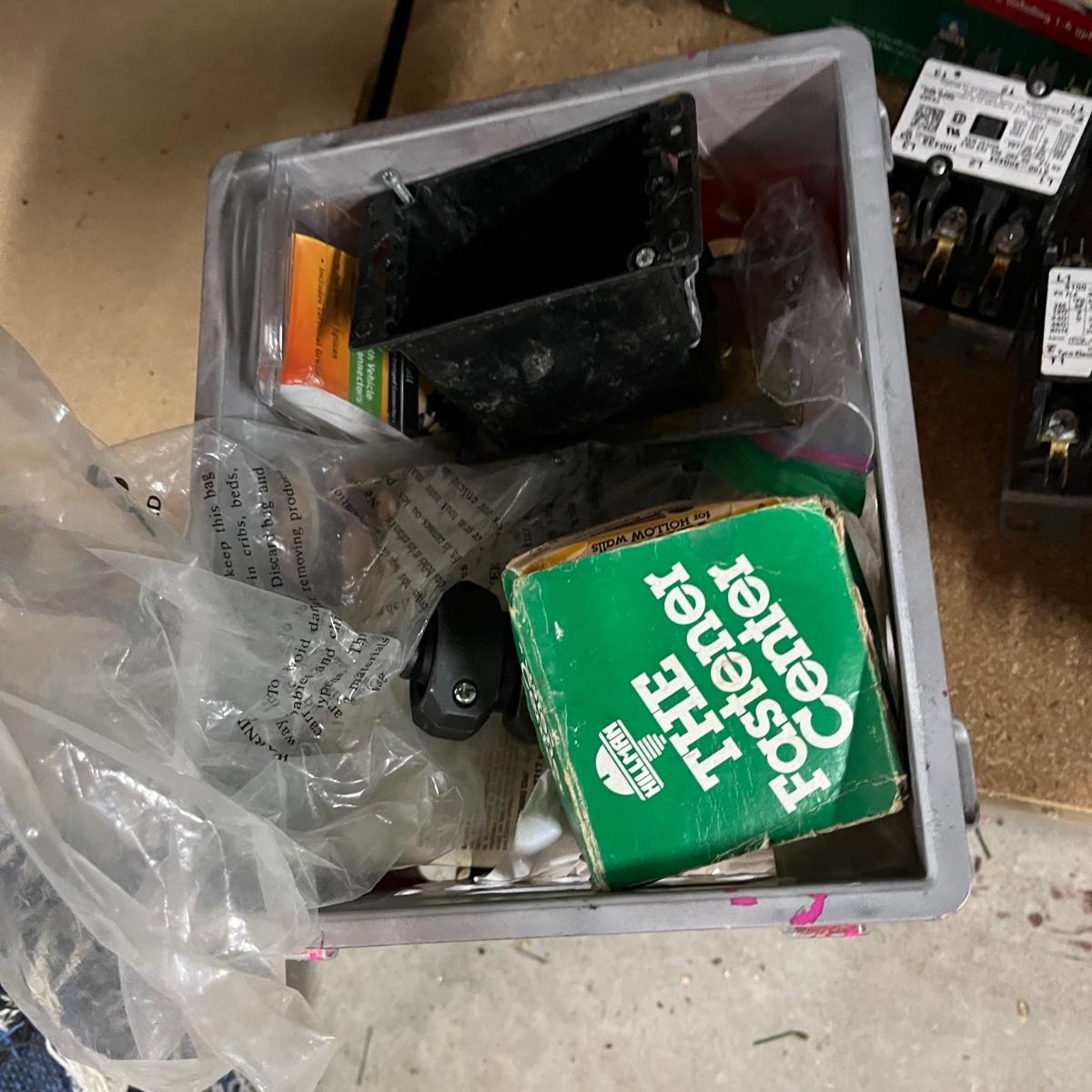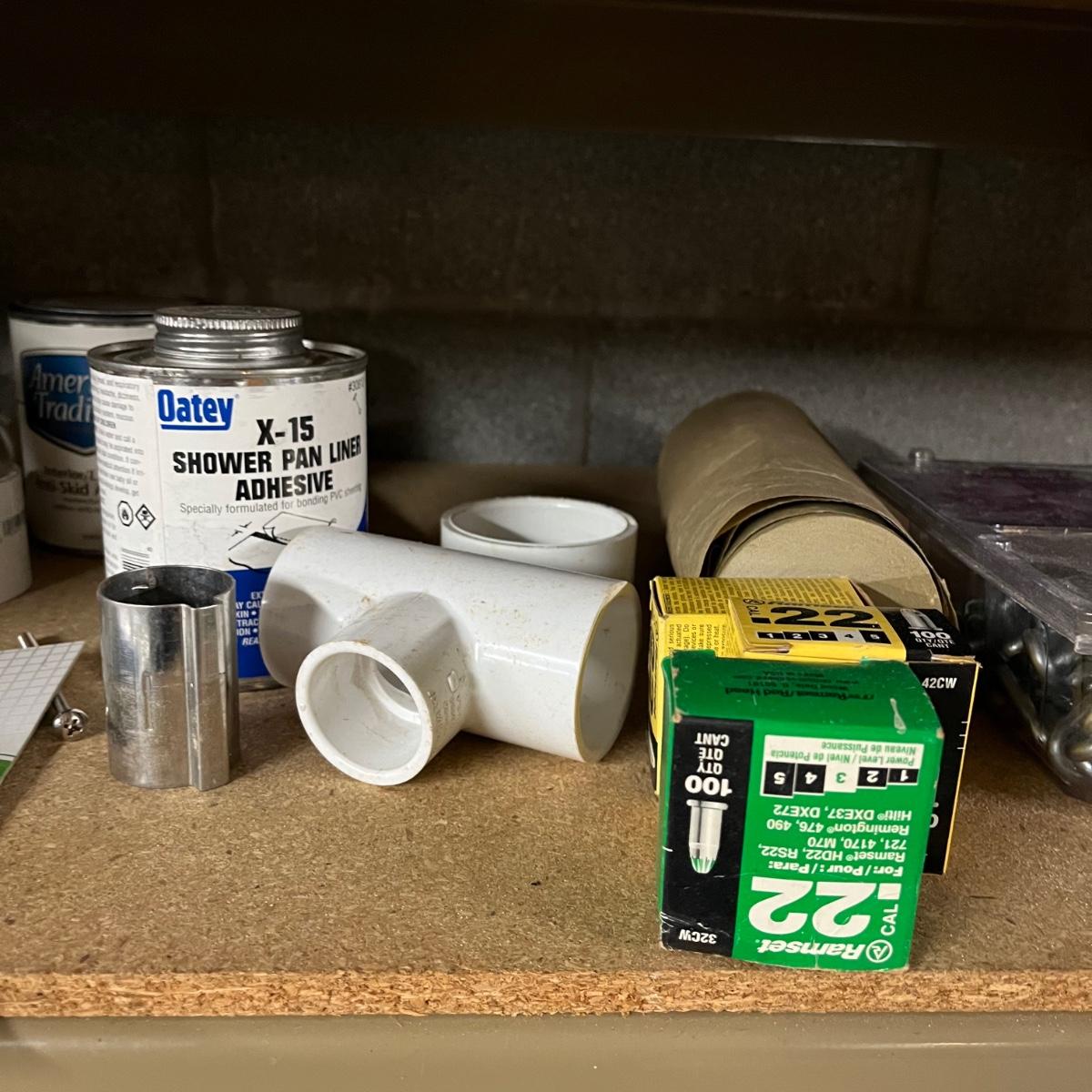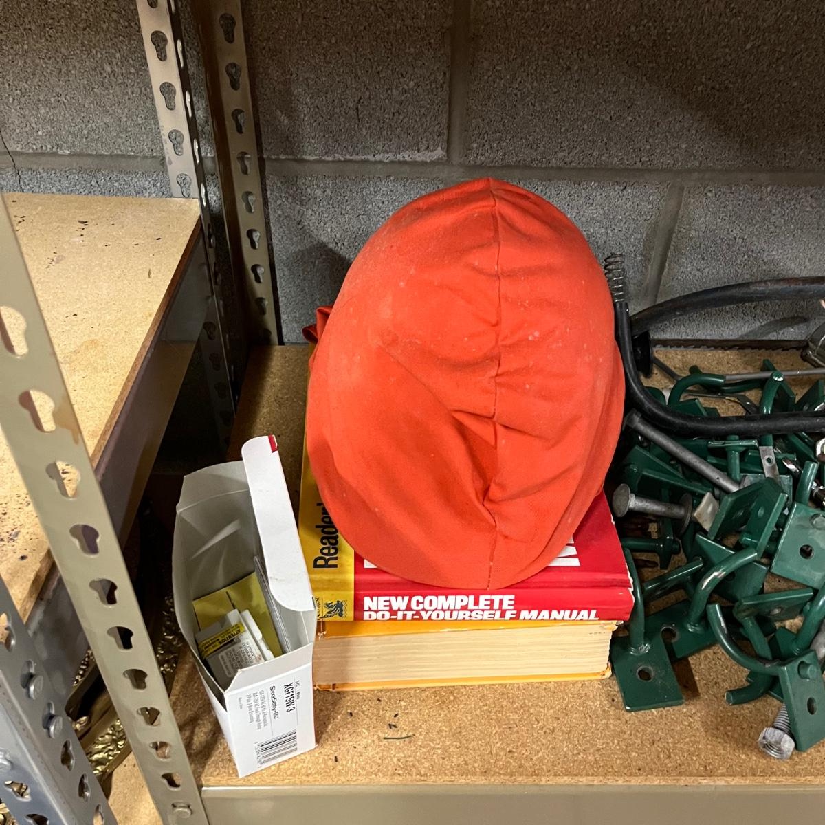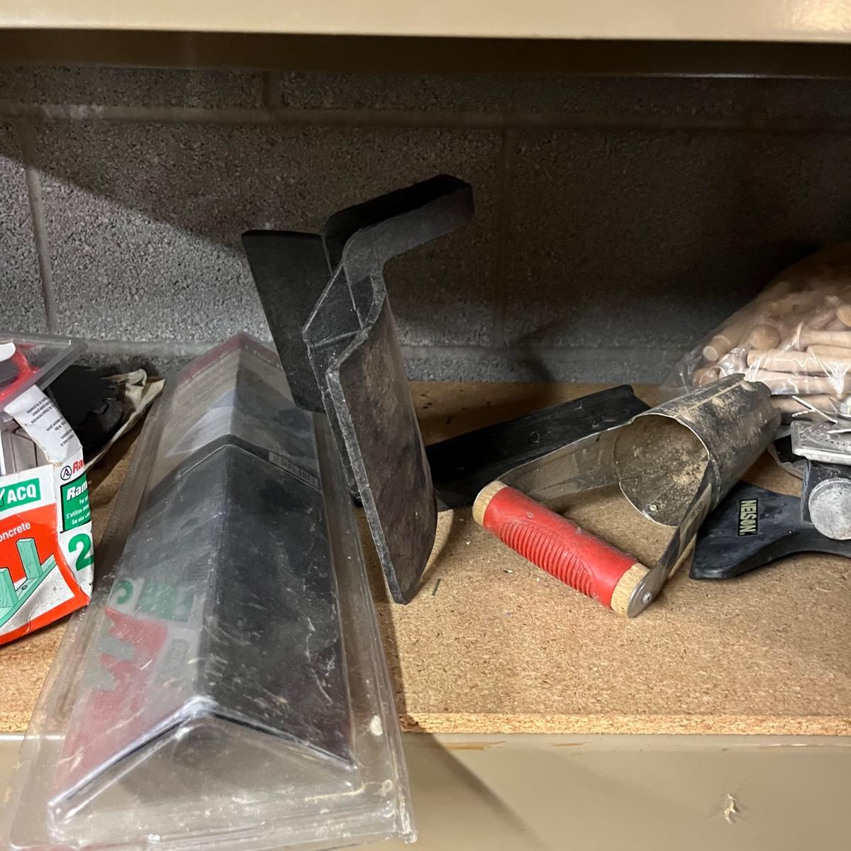 Lot contains a plethora of hardware including paint gun, chains, wall hooks, electric receptacles, roller, PVC valves, saw blades, peg hooks, sandpaper, trowel and more. Shelving unit not included but available in another lot in this auction.
