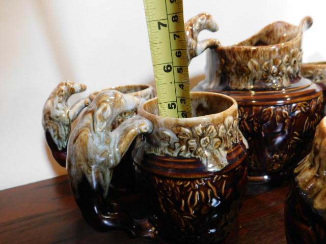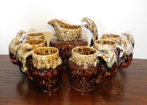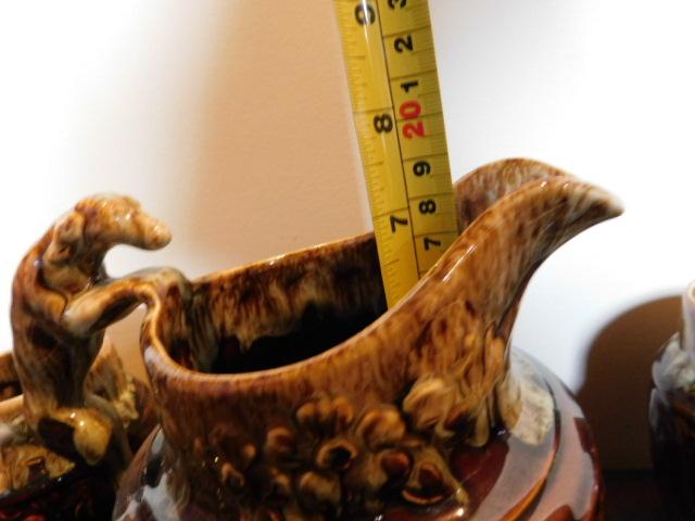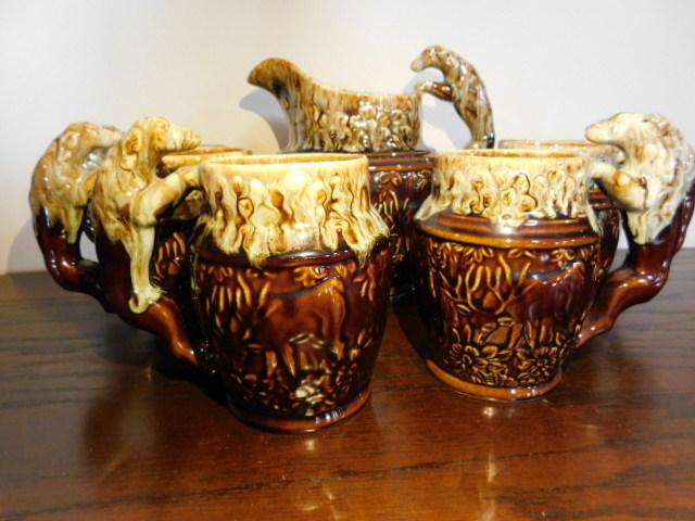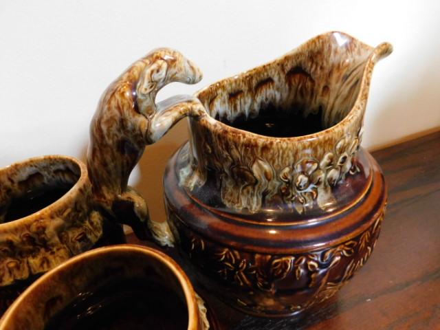 Harker Rockingham Reproduction 1840 Stag Deer with Hunting Dogs Pitcher & 6 Mugs seems to be in very good condition.