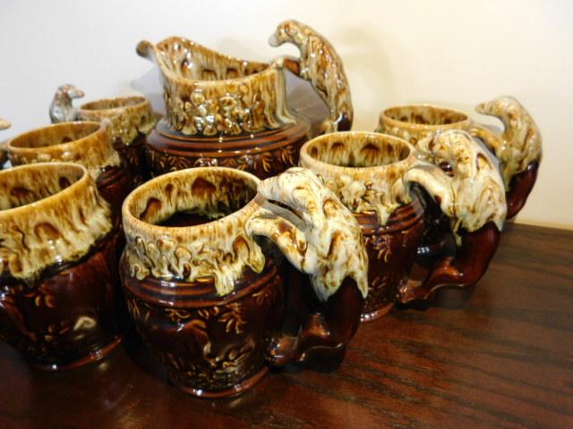 Harker Rockingham Reproduction 1840 Stag Deer with Hunting Dogs Pitcher & 6 Mugs