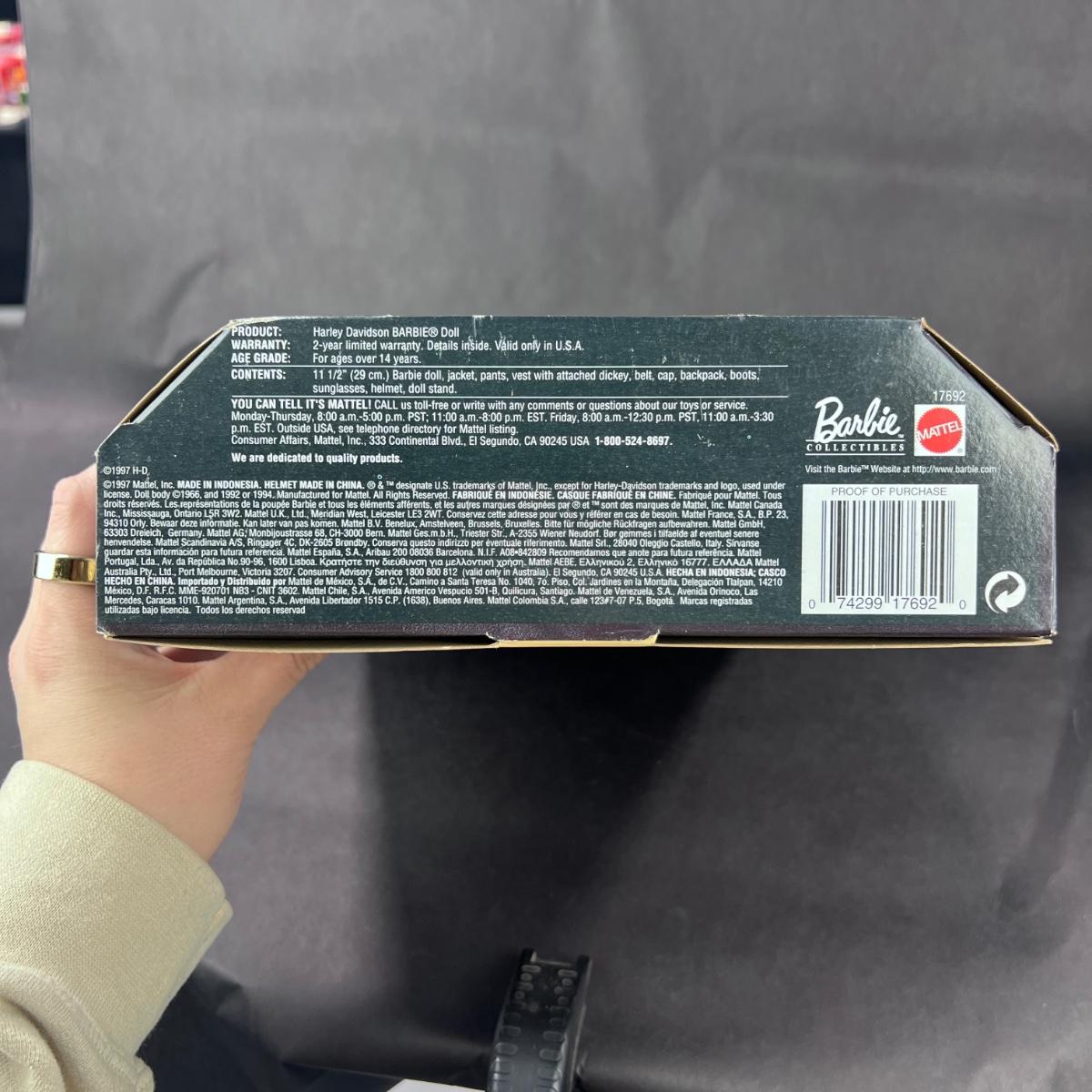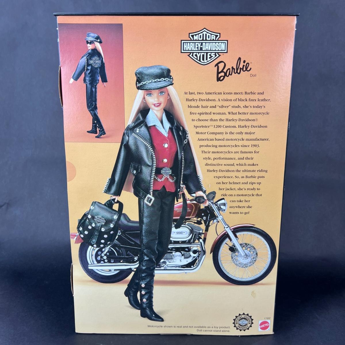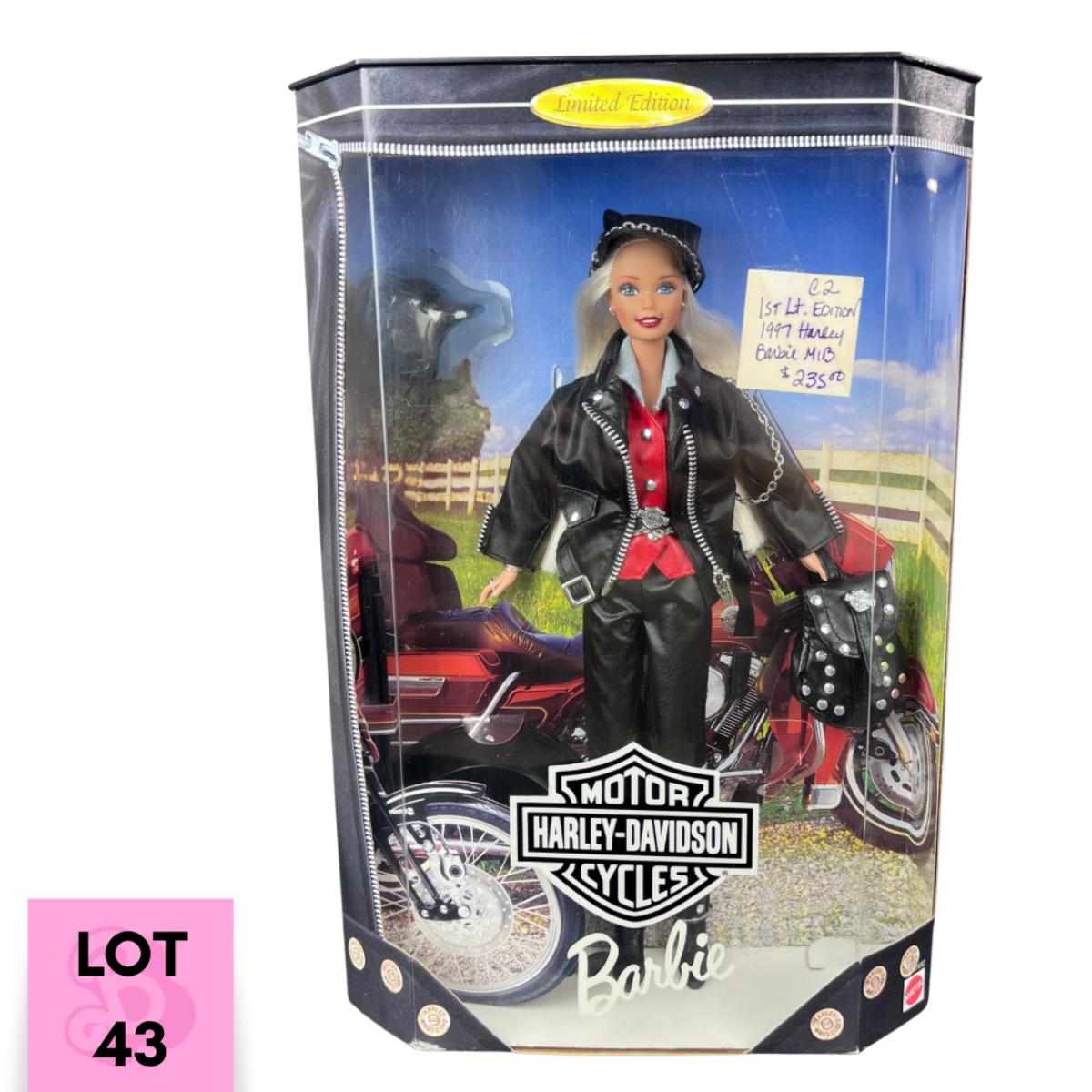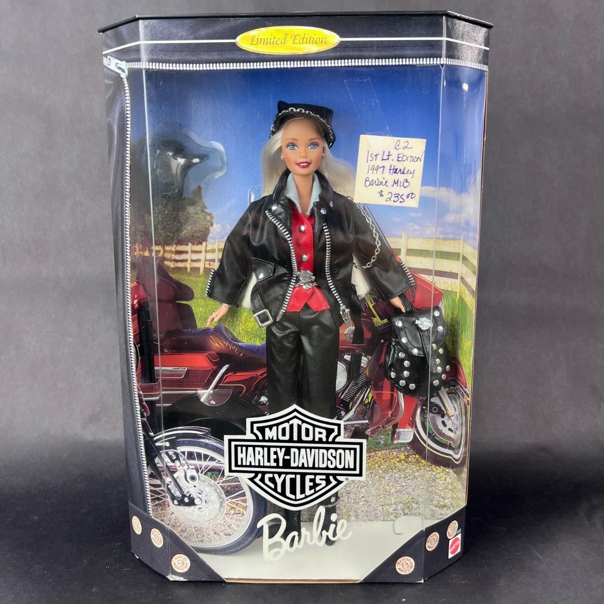 The FIRST Harley Davidson Barbie to be produced in partnership with Mattel, in 1997. Doll is in exceptional condition for her age, and has not been out of the box. **|** Please see photos for details and condition. ::: Shipping is available on this lot. If you require shipping you must let us know at the close of the auction. We will coordinate with you after the item has been won. Shipping fees will include insurance up to or exceeding the value of all items being mailed. If you have any questions regarding this lot please contact the auctioneer either via this website, by direct email or by phone. PICK UP TIMES and other important information can be found in the TERMS and DESCRIPTION of the auction. Please take a look for pertinent information. Thanks!