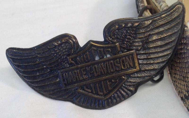 Harley Davidson belt buckle snake leather belt. Item is numbered 83. Belt measurement approximate : 36 inches in length. Material : Bronze/ snake leather skin. Shipping cost: $12.00