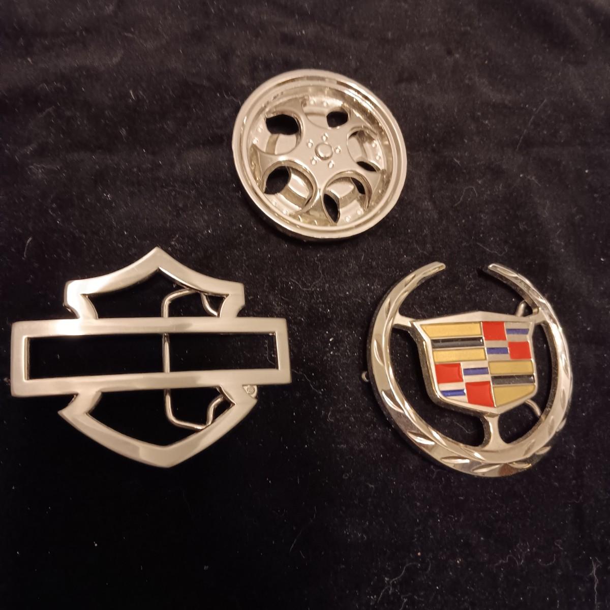 HARLEY DAVIDSON & CADILLAC EMBLEM BELT BUCKLES PLUS A ROTATING RIM BUCKLE