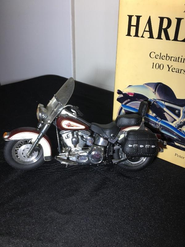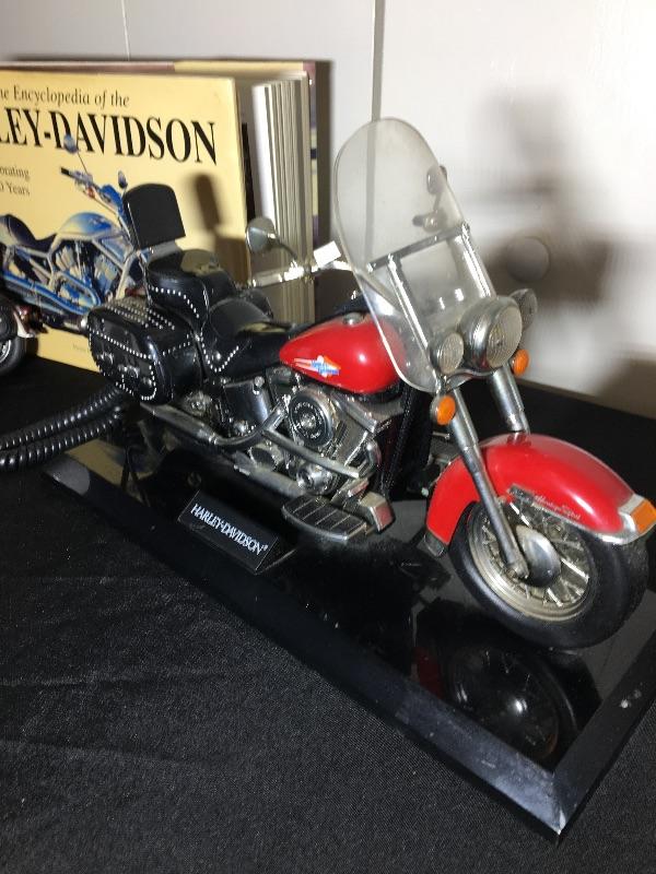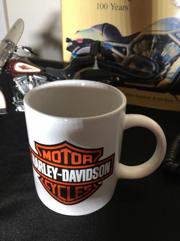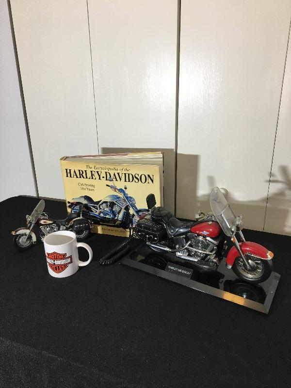 Harley Davidson Hardcover book, telephone, mug and collector bike