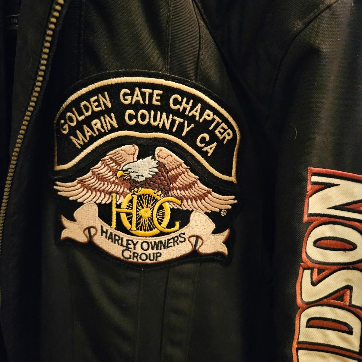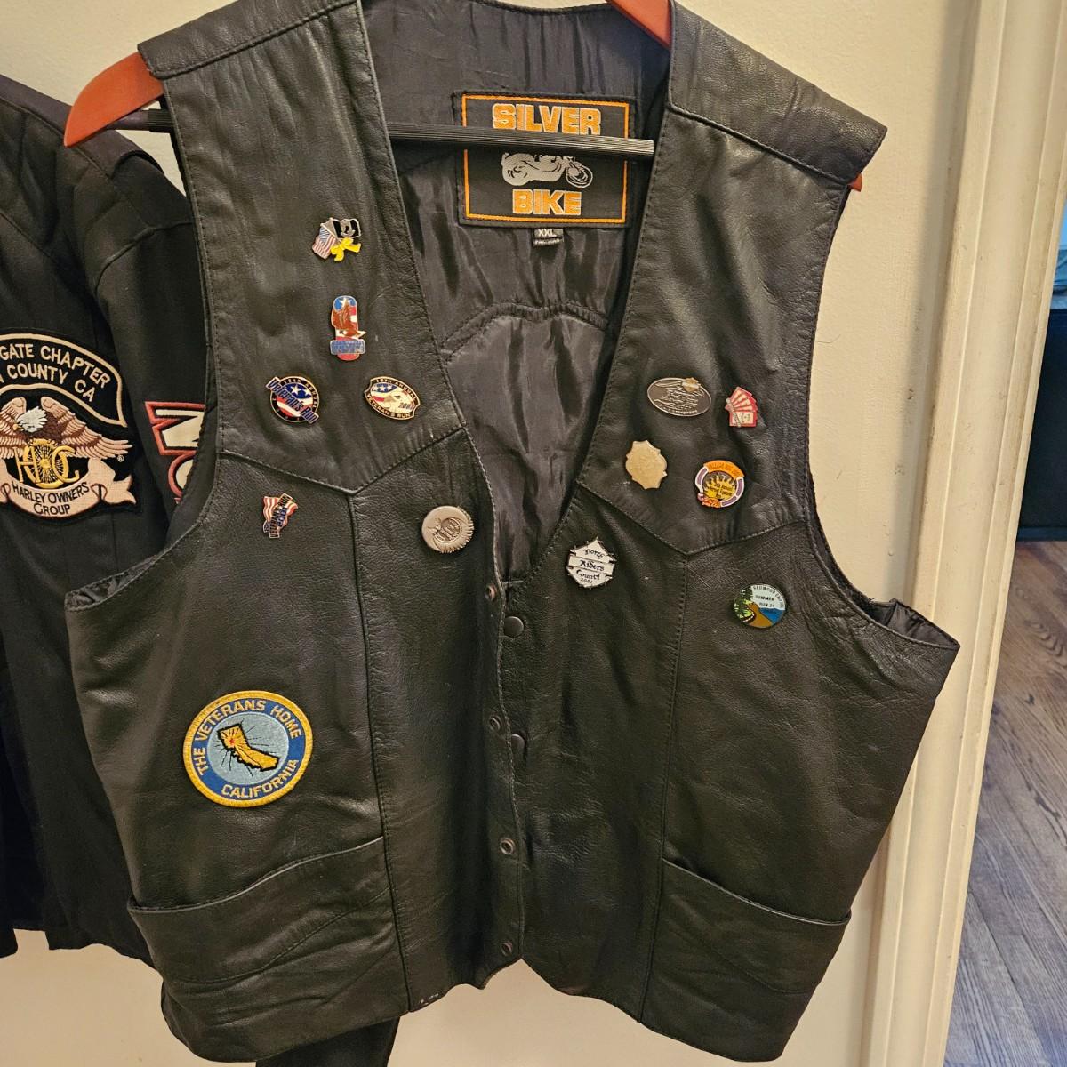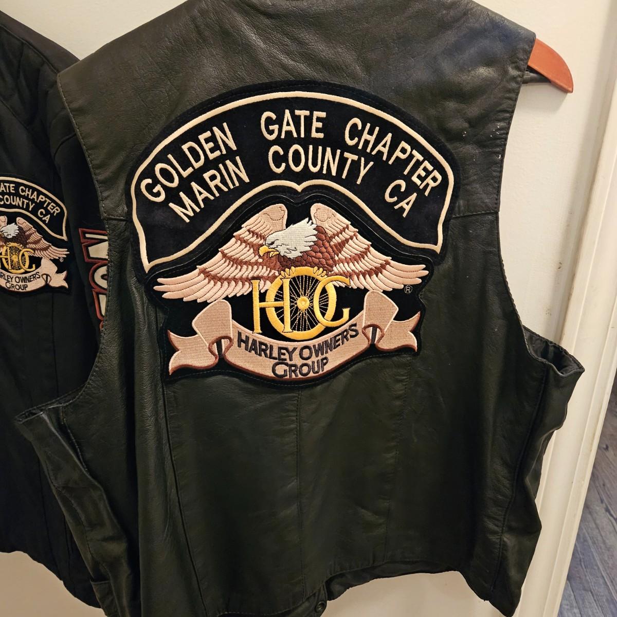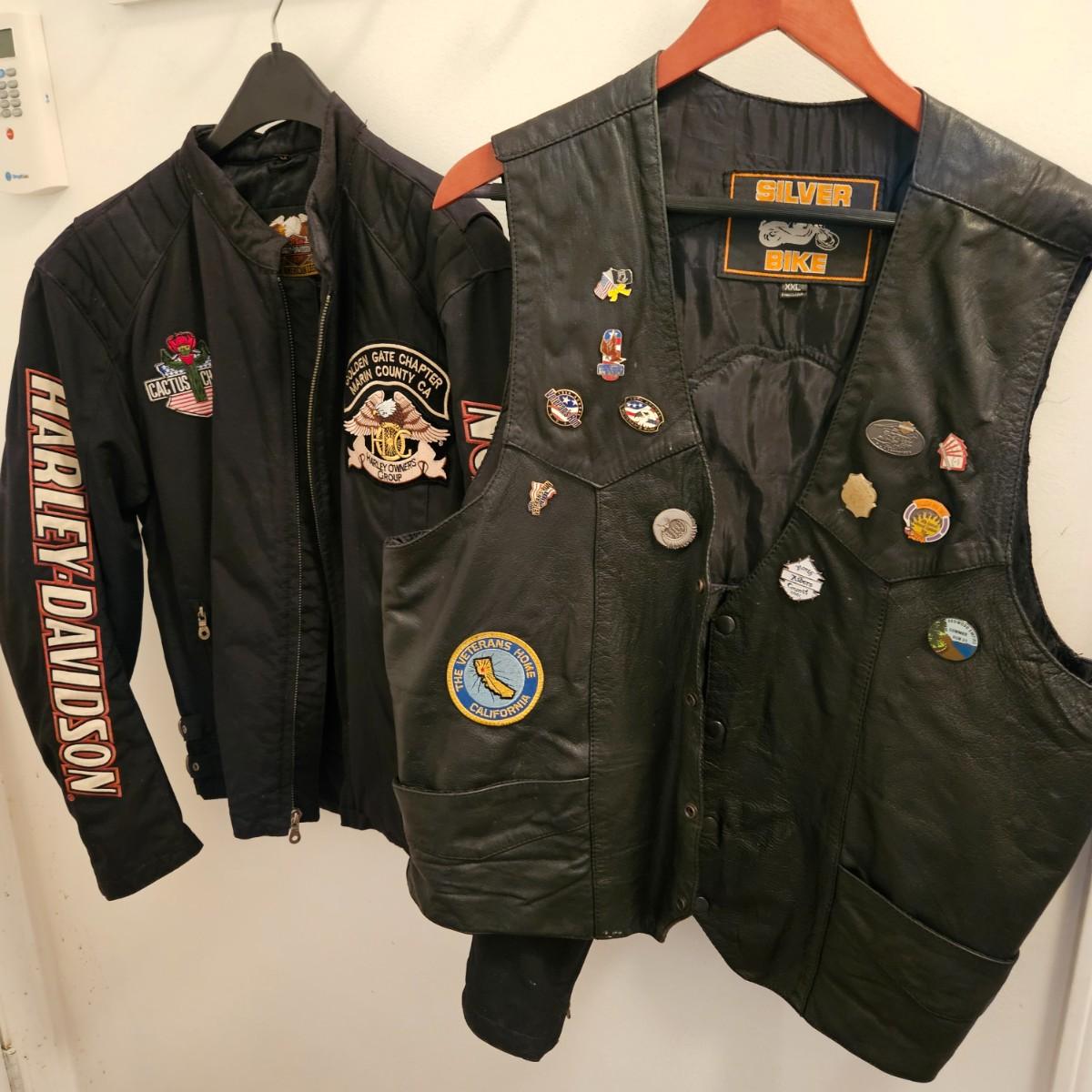 A Harley Davidson Jacket size M and a what appears to be a leather vest, size XL. Both items have a multitude of patches and pins, including Golden Gate Chapter Patches. The left side of the vest has duct tape covering the back of the pins. Shipping available