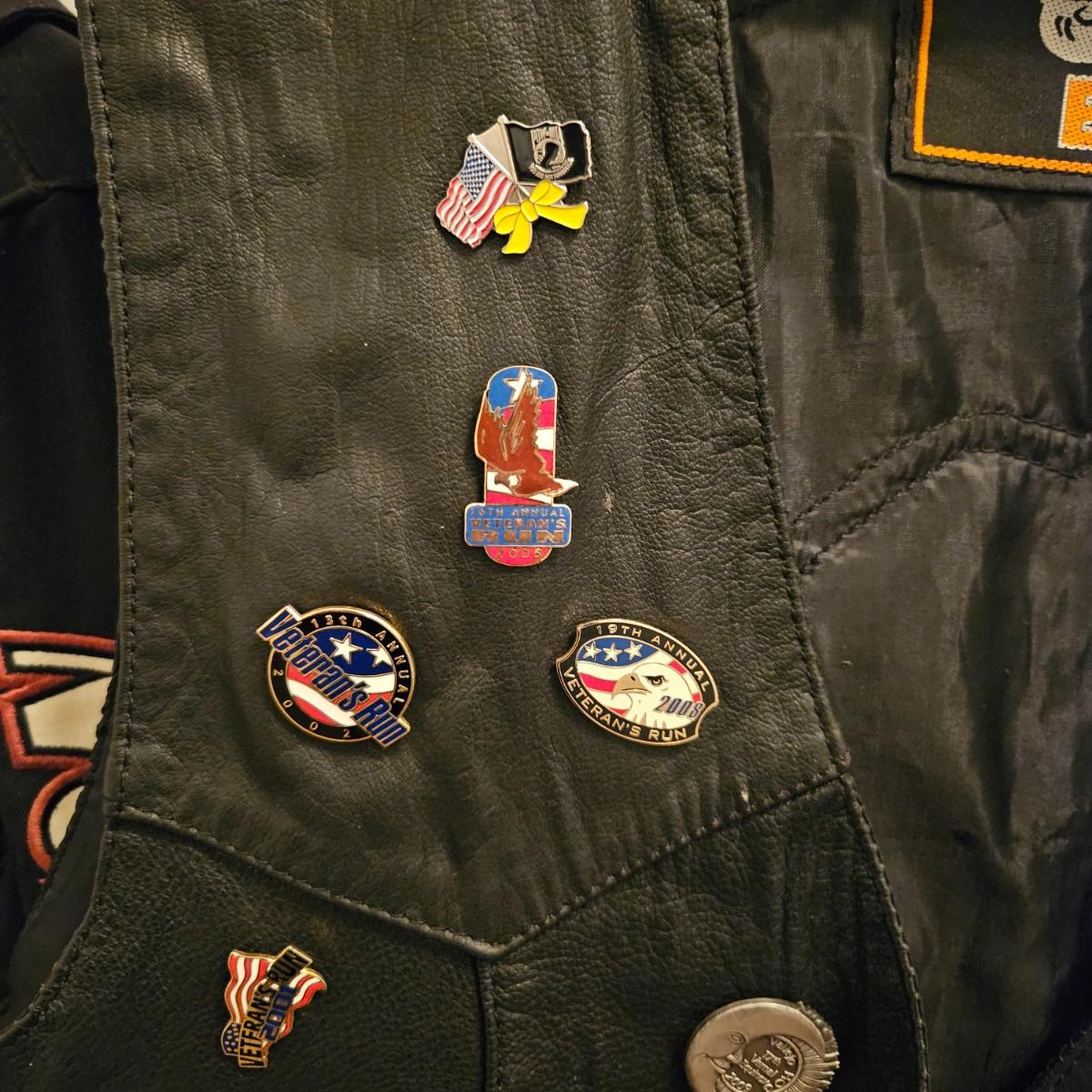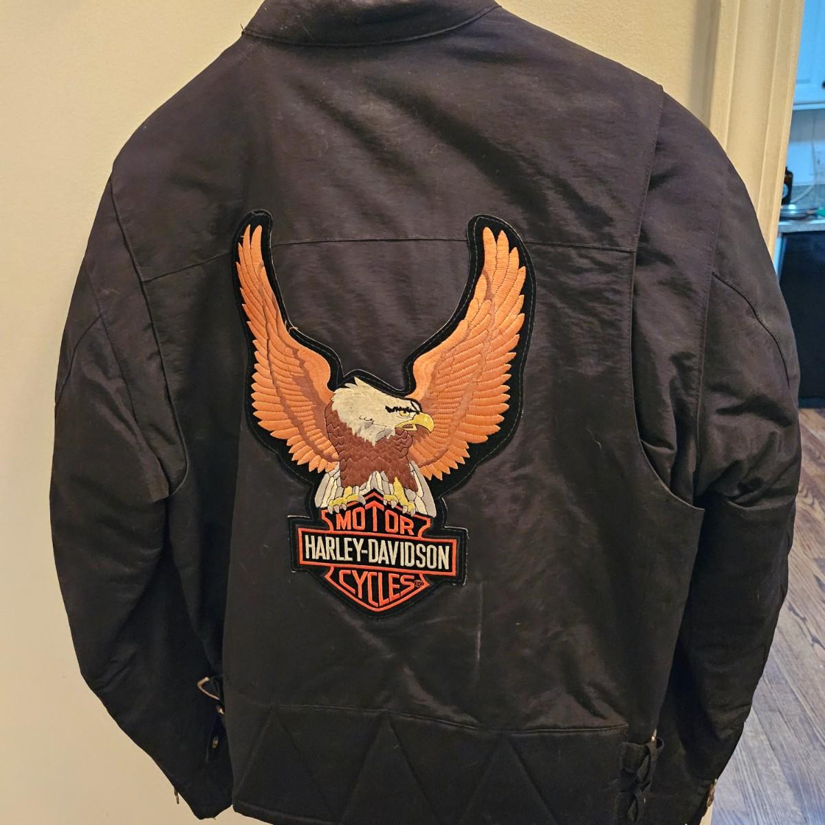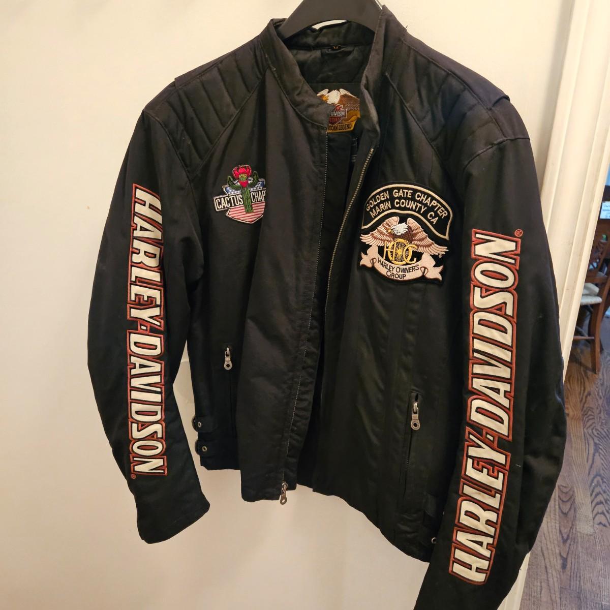 A Harley Davidson Jacket size M and a what appears to be a leather vest, size XL. Both items have a multitude of patches and pins, including Golden Gate Chapter Patches. The left side of the vest has duct tape covering the back of the pins. Shipping available