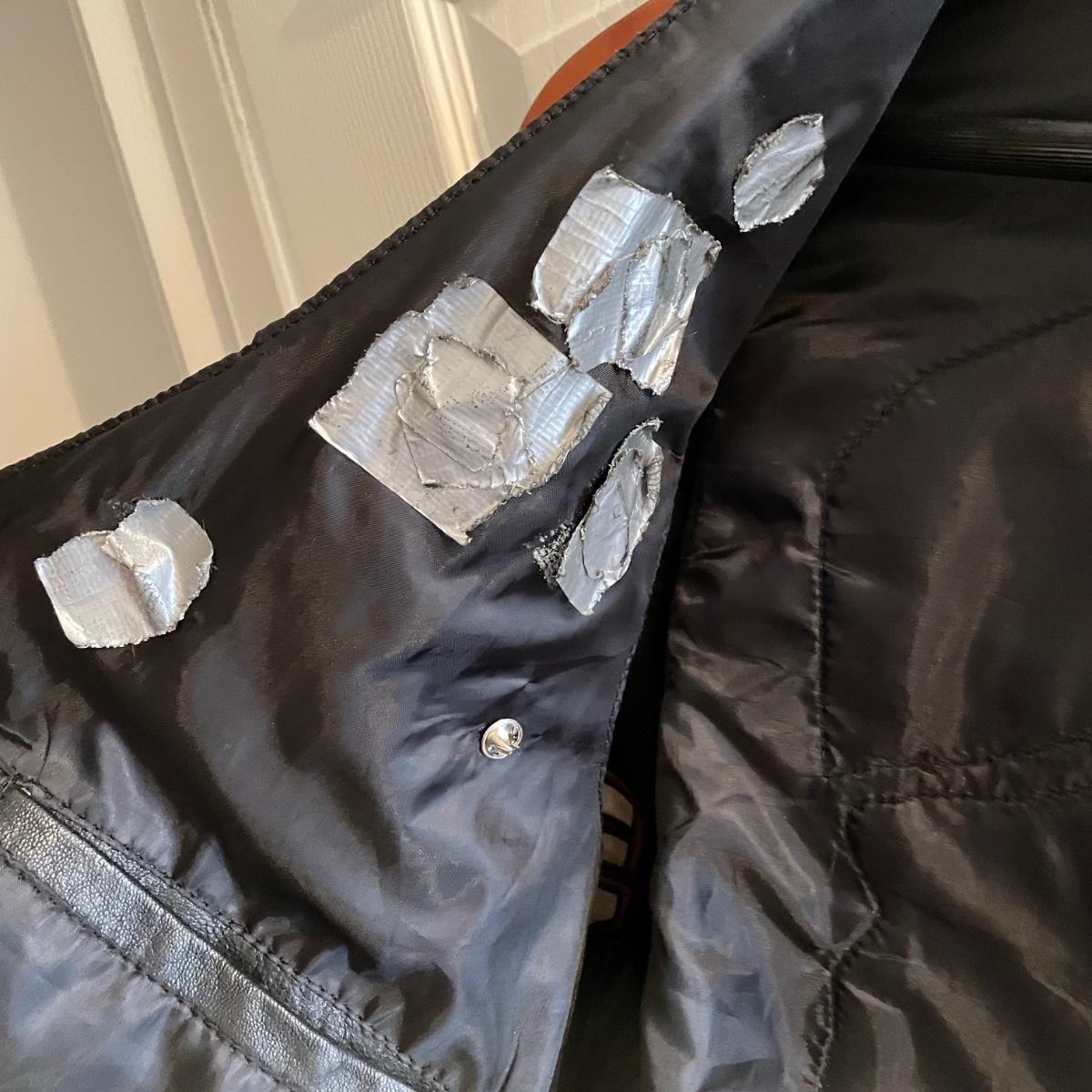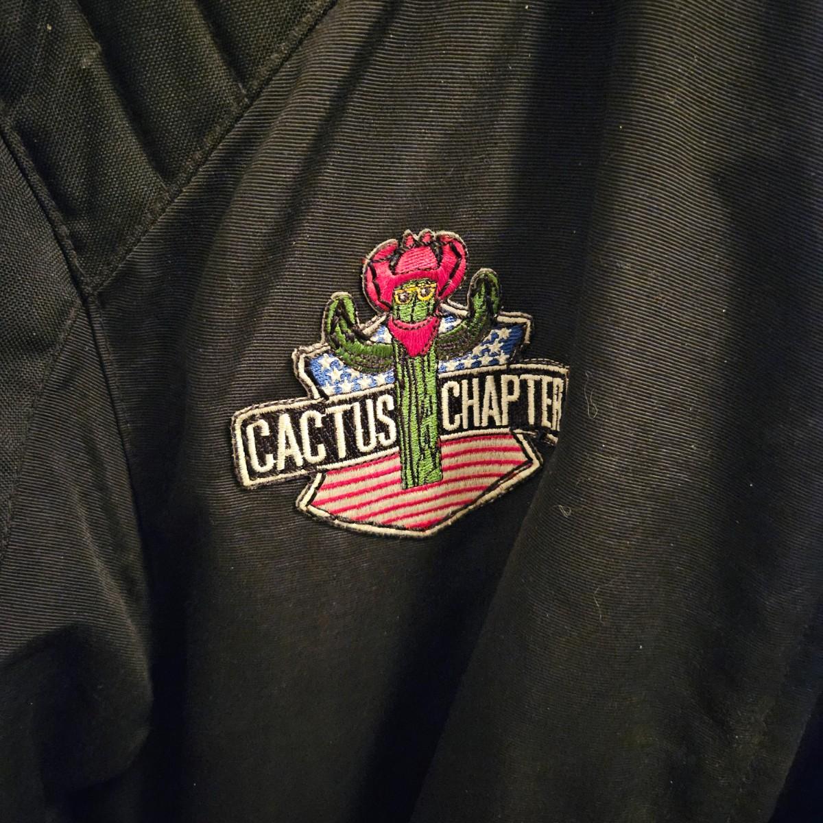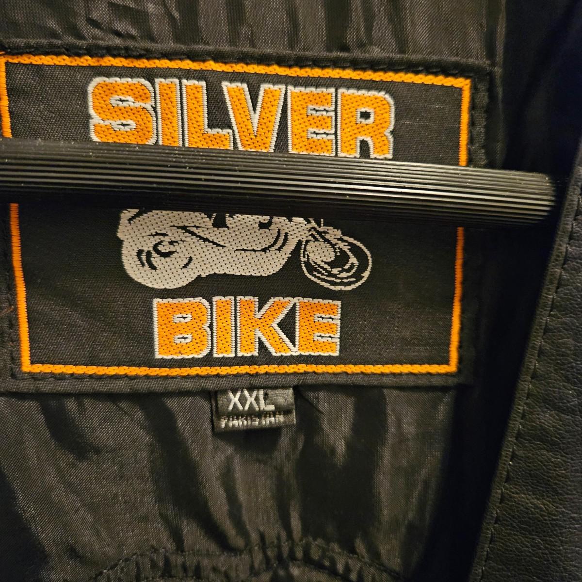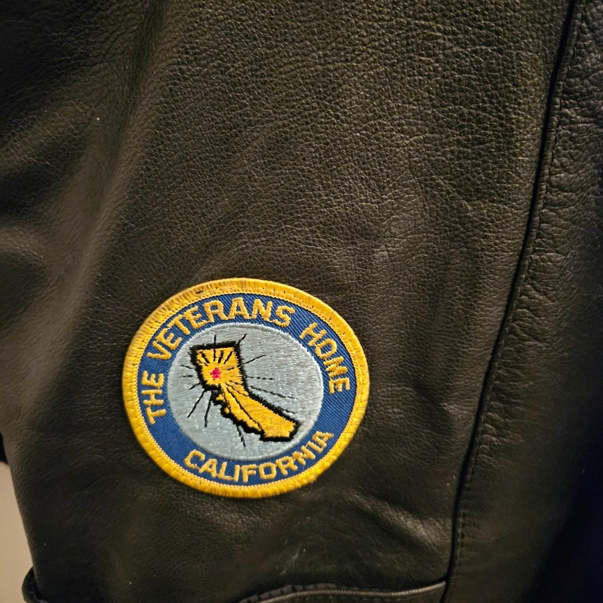 A Harley Davidson Jacket size M and a what appears to be a leather vest, size XL. Both items have a multitude of patches and pins, including Golden Gate Chapter Patches. The left side of the vest has duct tape covering the back of the pins. Shipping available
