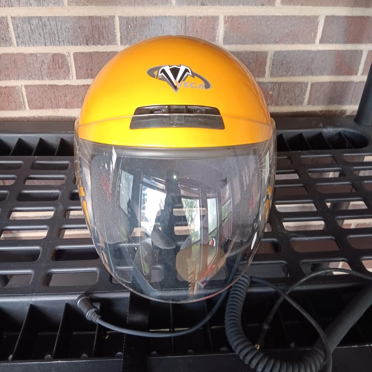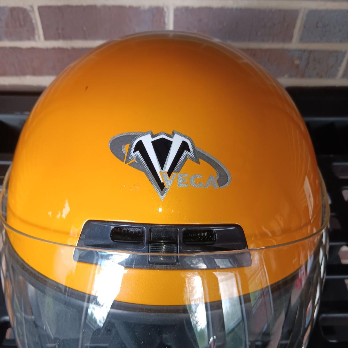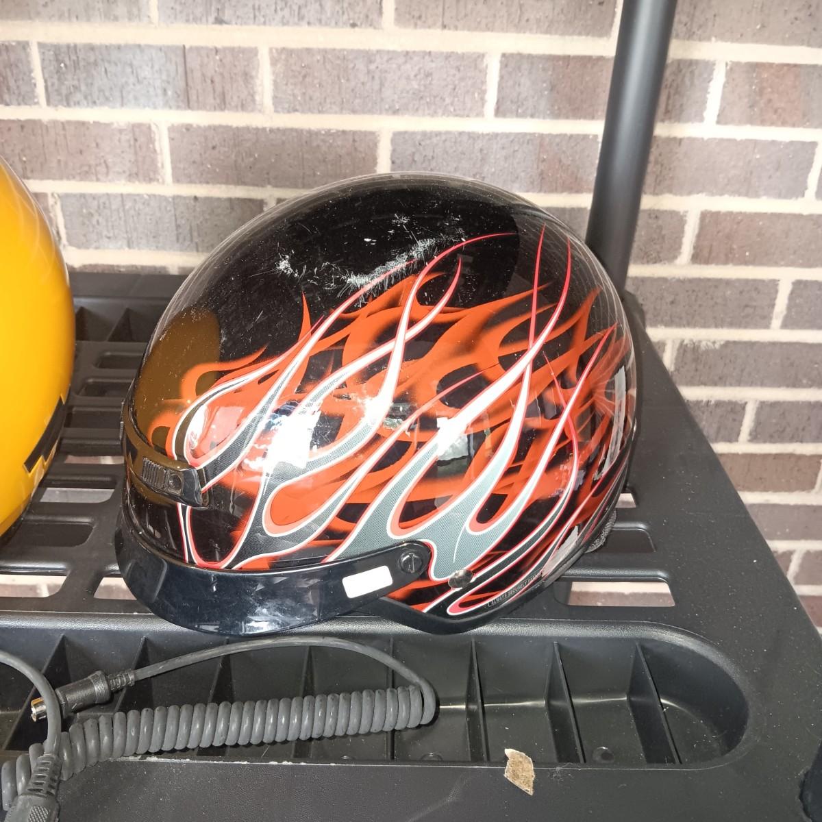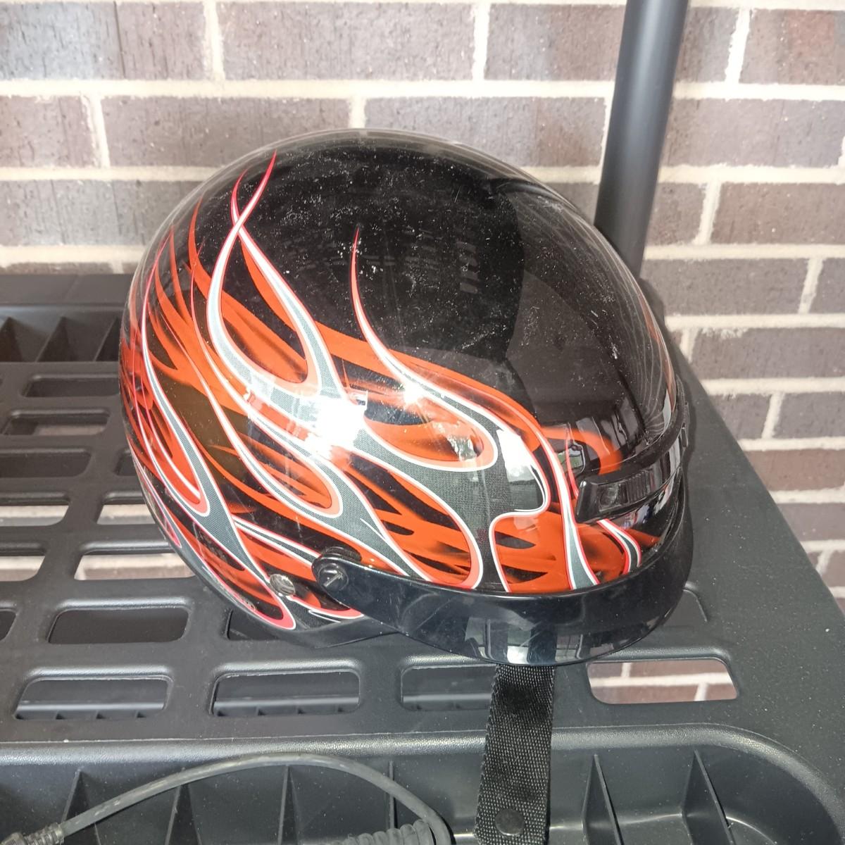 HARLEY DAVIDSON LEATHER SEAT, LARGE VEGA HELMET AND MEDIUM HELMET